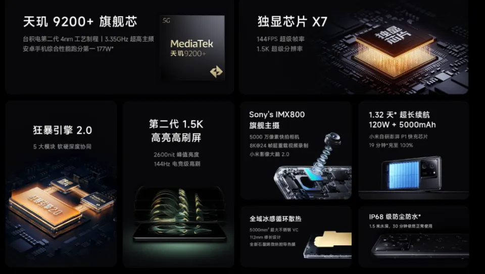 1.5K高刷屏、IMX800主摄、120W+5000mAh电池组合、X7独显芯片、IP68防尘防水。