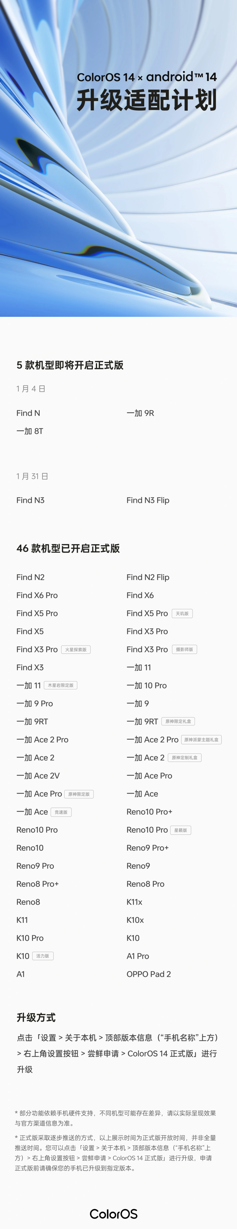 IT之家 12 月 29 日消息,ColorOS 官方公布,5 款 OPPO 和一加手机将在 2024 年 1 月开启 ColorOS14 x 安卓 14 正式版更新升级: 1 月 4 日:OPPO Find N、一加 9R、一加 8T 1 月 31 日:OPPO Find N3、OPPO Find N3 Flip ColorOS 官方体现,正式版采取徐徐推送的方式,以上展示时间为正式版开放时间,并非全量推送时间。 IT之家小搭档可以点击 「设置>关于本机>顶部版本信息(“手机名称”上方)>右上角设置按钮>尝鲜申请>ColorOS 14 正式版」举行升级,申请正式版前须要确保手机已升级到指定版本(具体版本号有待后续公布)。 OPPO ColorOS 14 于 11 月 16 日发布,该体系基于安卓14 打造,新增“流体云关照”计划,在关照栏即时展示信息控件,支持各种装备(手机、平板、手表等),并提供自顺应开辟框架,号称“一次接入多端可用”。 ColorOS 14 新增“中转站”功能,号称是“跨装备的超等暂时存储空间”,并声称体系支持了60多种文件格式。 别的,OPPO 官方还约请了微软环球合资人,先容了体系新增的“Phone Link”功能,允许手机与电脑无缝互联、实现更高效的跨端协同;并先容了装备拥有的“随身工作台”功能,号称用户只要登岸个人账号,就能在恣意装备的欣赏器上搜刮、访问、编辑、分享 OPPO装备上的软件。 |