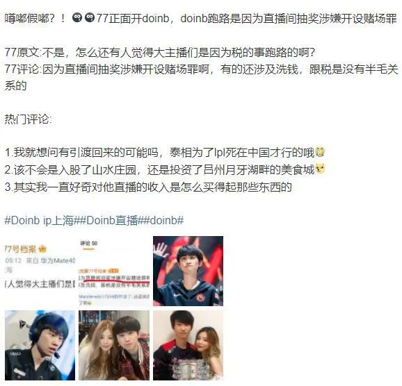 迩来关于电竞圈的消息是很多人在关注的,信任各人也不停在讨论这方面的内容,迩来有一位选手失事了,他就是doinb,实在并不是只有他失事,在一个多月前,整个直播圈都震动了,由于某鱼平台老板被抓了。 由于之前办卡抽奖的举动是违法的,而大量主播都到场了,有上百人扳连此中,不外迩来他们都没事了,拘留一段时间,然后补交罚款就行,准确说是补税,我们看到小团团就被曝光补了2000万的税。 在补完税之后,这些主播也连续回归,而且开启了直播了,但是doinb不停没有消息,有人说他就是故意不交的,由于从6月份开始,他就连续注销了本身的公司,而且在韩国买了别墅,停播之后立刻就去韩国了。 实在他已经做好了不返来的准备,但是迩来他和糖小幽的账号IP又表现在上海,岂非他们真的返来了吗?有人说他已经把赃款全部买了房子,以是根本没有钱交,除非把大庄园卖了,他们如果真的返来了,那大概真要卖房了。 合法各人都以为doinb有大概回归的时间,迩来有一位着名博主开团doinb,直言他的性子更恶劣,是要抓起来判刑的罪,并不是交钱就能办理,通过他的形貌,doinb的标题跟平台老板是一样的,涉嫌开设D场。 其他主播都是补税,而doinb根本就不是补税就能办理的,他的标题很严肃,肯定是回不来了,不外很多人以为他说的不对,由于迩来德云色都出来爆料,表现doinb很有大概会回归,另有其他圈内人也表现他会回归。 只有这位博主说doinb的标题很大,以是现在各人真的搞不懂了,有人说doinb能返来,又有人说doinb回不来,真的不知道终极会是什么环境,只能说各人拭目以待吧,很快就会有答案了,对此你们有什么想说的吗? |