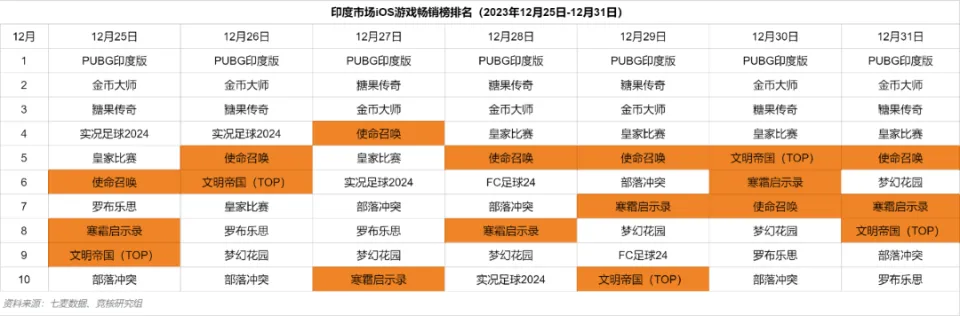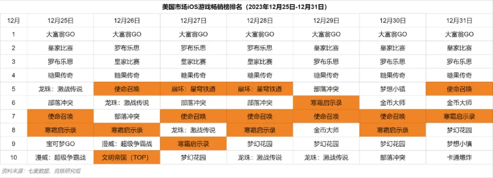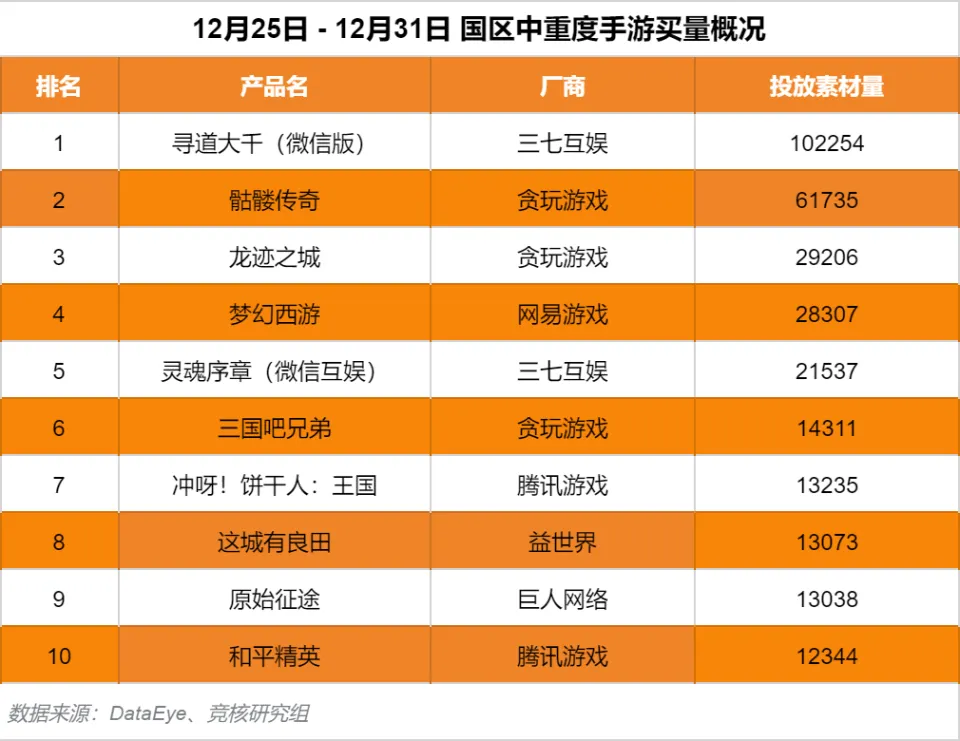 美国市场 美国市场2023年12月25日—12月31日iOS游戏脱销榜中,头部游戏相对固化,《豪富翁GO》、《糖果传奇》、《皇家比赛》、《罗布乐思》的头部位置难以撼动。 国产游戏方面,《寒霜启示录》和《任务召唤》本周连续在榜,后者最高升至第五。尚有《崩坏:星穹铁道》和《文明帝国》也乐成进入榜单。 日本市场 日本市场2023年12月25日—12月31日iOS游戏脱销榜中,本土老产物仍旧显现出绵长的生命力。《龙珠:鏖战传说》、《COMPASS》、《海贼王:宝藏巡航》等产物依附运营活动在本周有着精彩的流水体现。 国产游戏方面,本周入榜的产物数量较上周有所降落,除《崩坏:星穹铁道》外,仅有《偶像梦幻祭》和《荒原举措》冲进前十。 韩国市场 韩国市场2023年12月25日—12月31日iOS游戏脱销榜中,MMORPG仍旧是韩国最受欢迎的范例,但在多款国产游戏的打击下,本周只有《天国M》和《奥丁:神叛》保持在榜单之内。 国产游戏方面,《冒险大作战》自12月22日上线韩服后体现一起走高,本周险些实现霸榜。而同样在近期上线的元趣娱乐《末了的战争:生存》也有亮眼体现,冲至榜单前三。别的另有《寒霜启示录》连续在榜,《弹壳特工队》、《万龙觉醒》、《崩坏:星穹铁道》则依附版更也进入榜单。 印度市场 印度市场2023年12月25日—12月31日iOS游戏脱销榜中,《PUBG MOBLIE 印度版》保持强势,别的榜单构成同美国市场愈发相似。国产游戏方面,《文明帝国》、《任务召唤》以及《寒霜启示录》仍旧保持着较为稳固的体现。 Data-Eye数据表现,2023年12月25日—12月31日国内中重度手游买量榜单中,头部厂商包罗腾讯、网易、三七互娱、贪玩游戏等。由于时比年末以及游戏版更的缘故起因,《梦幻西游》、《宁静精英》等多款长线产物加大了投放力度,相应的本周微信小游戏的占比有所降落。从素材量规模来看,厂商投放力度较上周稍有上升。 《寻道大千》微信版本周继续断崖式领跑买量市场,10万组的素材量较上周根本持平。从投放渠道上来看,穿山甲同盟、QQ音乐、以及虎扑是该作的重要投向。同时我们也发现,以QQ音乐和酷狗音乐为首的头部音乐App,也成为了厂商们的热门方向。 而本周仍保持在Top 10的常见产物另有益天下《这城有良田》,投放素材量1.3万组;贪玩游戏《龙迹之城》和《三国吧兄弟》,投放素材量分别为2.9和1.4万组。须要指出的是,疯狂游戏《咸鱼之王》本周投放量骤减,素材量仅有5300余组,不敷上周1.2万组的一半。 |