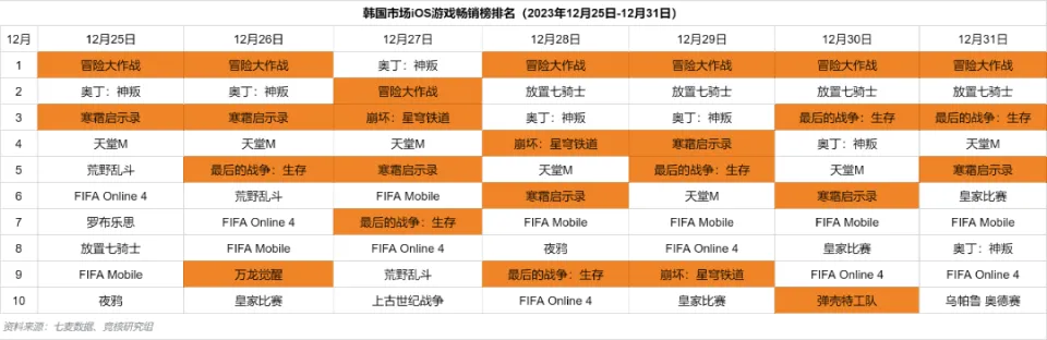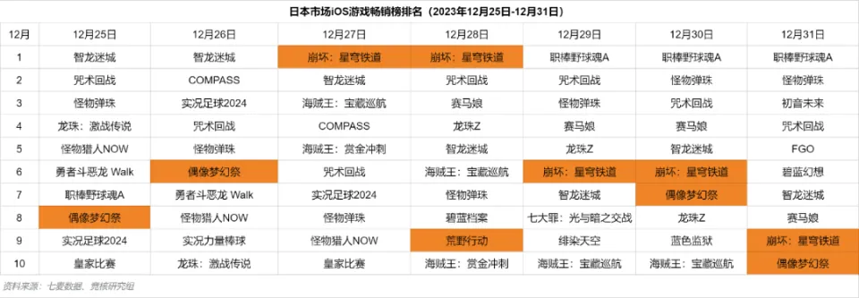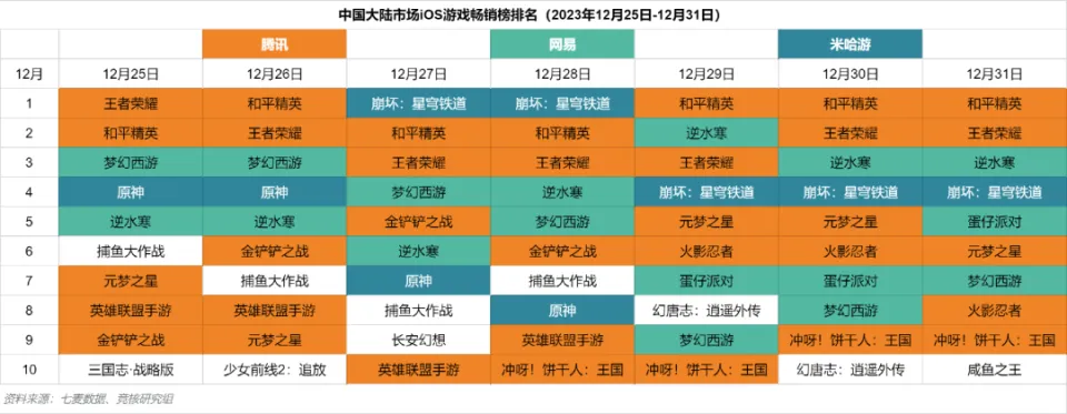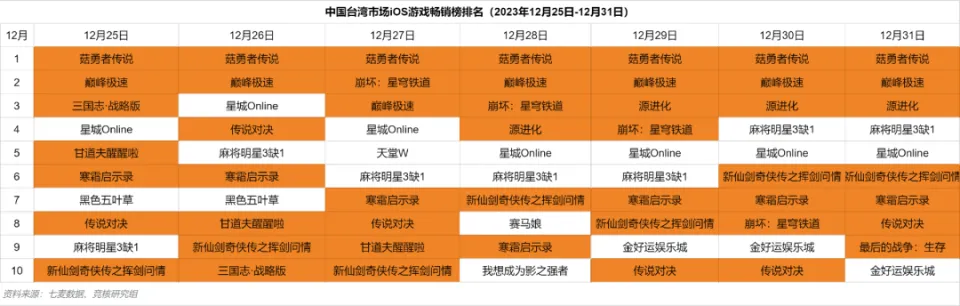 中国大陆市场 中国大陆市场2023年12月25日—12月31日iOS游戏脱销榜中,《王者光彩》、《崩坏:星穹铁道》、《宁静精英》分别继续了1天、2天和4天的榜单第一。 此中,《崩坏:星穹铁道》在12月27日更新了1.6版本,依附新脚色的高人气,游戏在环球多市场都实现了流水和排名的上升。而《宁静精英》则在12月26日开启了SS25新赛季,并在同期一并推出了新年主题版本和活动,资助其在本周把住了榜首位置。 《元梦之星》和《蛋仔派对》也在本周连续较量,《元梦之星》和蜡笔小新的联动,以及《蛋仔派对》和三丽鸥的联动都选择在12月29日上线。这场派对游戏激斗预计将连续至2024年春节之后。 别的,腾讯方面有《火影忍者》依附着8周年系列活动在近期体现精彩,而IP改编新游《冲呀!饼干人:王国》在12月28日上线后也保持在榜单前十。别的要指出的是,腾讯、网易、米哈游三产业品,占据了本周国内市场Top10中的8席,头部厂商的领先上风较为显着。 中国香港市场 中国香港市场2023年12月25日—12月31日iOS游戏脱销榜中,《菇勇者传说》、《三国志·战略版》,以及《崩坏:星穹铁道》轮番登顶。别的,《顶峰极速》、《寒霜启示录》、《新仙剑奇侠传之挥剑问情》等产物也都乐成进入前十。团体来看,国产游戏还是香港游戏市场的主力。 值得一提的是,露珠游戏旗下MMO新游《源进化》在12月28日上线后收到热捧,在港台地区都进入了榜单前三。而大梦龙途旗下塔防游戏《甘道夫醒醒啦》一连了上周版更后的热度,在本周最高到达第7名,也革新了自己的汗青记载。 中国台湾市场 中国台湾市场2023年12月25日—12月31日iOS游戏脱销榜中,团体产物构成类似香港市场。大陆和日韩厂商的产物根本占据了榜单前十,游戏品类也覆盖了卡牌、ARPG、MOBA、MMO 等多种范例。此中,《菇勇者传说》连续霸榜,老产物中《寒霜启示录》、《传说对决》等发挥妥当,新产物中则有《源进化》和《甘道夫醒醒啦》体现抢眼。