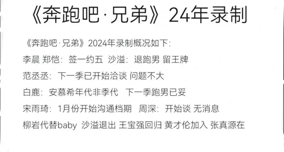 《疾驰吧兄弟》作为最早一批引让到国内的真人户外综艺节目,自从播出以来受到了许多网友们的追捧,随着节目改名为《疾驰吧》,加上邓超、陈赫、鹿晗等人退出,这档节目收视率和口碑都不如之前,不外依然有不少网友关注。 随着2024年的到来,新一季候目次制也是越来越近,现在节目组正在沟通高朋名单中,根据最新高朋信息来看,沙溢退出张真源参加,柳岩将取代她。 沙溢退出 沙溢是通过《武林外传》被广大网友熟知的艺人,而在前几年他以飞行高朋身份加入了东方卫视的《极限挑衅》,固然他被常驻高朋以及节目组整蛊得非常惨,但也正是这一期节目,让他再次翻红。 翻红后他便是各大综艺的常客,而在邓超、陈赫等人退出节目后,沙溢更是以常驻高朋身份参加到了《疾驰吧》,他的参加为这档节目带来了许多笑点,他退出有点惋惜。 而根据爆料者称沙溢真会退出《疾驰吧》,不会退出《王牌对王牌》,2023年《王牌对王牌8》中贾玲退出了节目次制,沙溢等人新参加,他留驻《王牌对王牌》和沈腾继承相助也是挺好。 三人已签约,王宝强回归 现在三人已经签约,他们分别是李晨、郑恺和白鹿,李晨、郑恺两人是这档节目的元老高朋,从第一季开始他们便在,他们从未缺席过,随着baby遭到封杀后,元老高朋也就他们两人了。 白鹿则是厥后参加的常驻高朋,她在2023年年底签约了《疾驰吧》的冠名商安慕希,因此她继承回归加入《疾驰吧》很正常,而且在baby遭到封杀后,毫无疑问她将成为新的团宠。 除此之外,爆料者称首季的常驻高朋王宝强将回归到节目,王宝强首季候目竣事,便退出了录制,固然背面节目中网传多次他会回归,但不停都没有,不知道这次他能不能真的回归。 三人沟通中 还在沟通中的三人分别是范丞丞、宋雨琦和周深,宋雨琦在沟通档期标题,而范丞丞大概率也会回归继承加入新一季的节目,范丞丞是客岁新参加的常驻高朋,他是取代自己的队友参加的高朋,而也是他的参加,才没有让这档节目出现大量的马赛克。 周深是现在当地最火的歌手,他是2022年《疾驰吧》最低谷时参加的高朋,他参加后让这档节目的收视坦白线上升,只惋惜依然难改节目口碑,如果新一季候目他缺席,收视率肯定会有所下滑。 三人新参加,柳岩取代baby 根据爆料者称24年节目将会有三位新高朋参加,他们分别是黄才伦、张真源和柳岩,张真源是客岁《疾驰吧生态篇》的常驻高朋,他作为期间少年团的成员人气非常高,而且他的综艺感非常强,他常驻也是许多网友的呼声。 柳岩是当地女演员,比年来她也非常火,而她之以是参加,是取代baby,baby客岁加入了疯马秀遭到了封杀,因此元老高朋只剩李晨和郑恺两人。 而柳岩在前几季候目中,也是常常以飞行高朋身份加入这档节目,她对于这档节目可以说非常认识,因此她取代baby参加常驻,也非常符合。 团体而言,这档节目随着邓超、陈赫等人退出,就不停在走下坡路,而新一季候目固然有多位新人参加,和王宝强的回归,但想要重回顶峰非常困难。 |