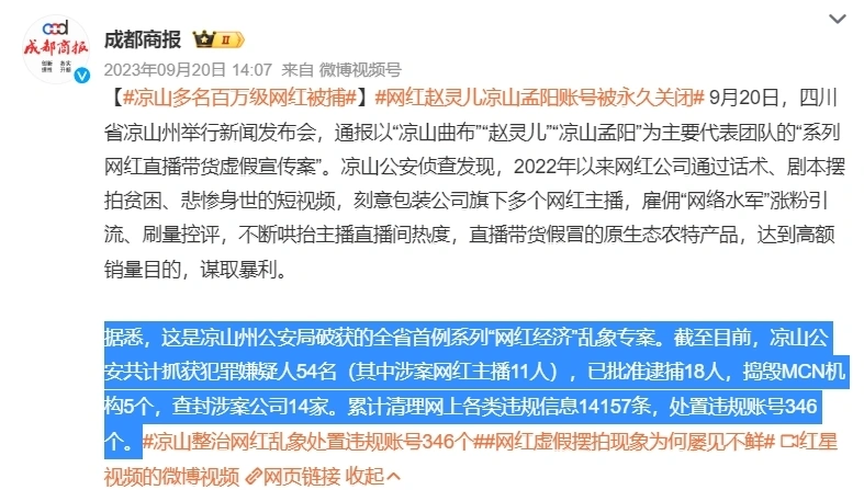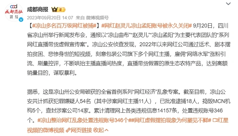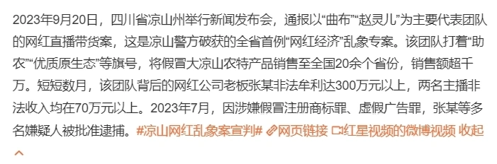 放到本日来说,「直播带货」这回事儿,已经不是什么特别的玩意了。 有人爱看颜值,有人专看整活,有人奔着才艺……萝卜白菜各有所爱。 就小雷看直播带货丰富履向来看,主播「人设」对于直播带货有绝对加成的作用。 主播人设一立起来,而且还很对粉丝群体胃口的话,直播带货的服从那是杠杠的。 但是,小雷又要说但是了嚯。 也正由于云云,一些个人或机构打着虚伪人设旗帜,吸引流量从而直播带货赢利。 前几天小雷刷到消息,多名百万粉丝级别网红被抓,乃至判刑效果都出来了! 好家伙,一个两个被抓还能说是偶合,一下子这么多网红失事,就没那么简单咯。 本日小雷就来深扒下,这些百万粉网红到底整出啥骚利用,才落得现在这个了局。 虚伪人设百万粉网红被判刑事故是如许的。12月28日,四川凉山昭觉县人民法院一审宣判: 网红公司法定代表人张某、网红主播赵某、阿日某某等9人分别被判8个月至3年2个月不等的有期徒刑。 大概有小搭档要疑惑了,固然这几个人说是什么大网红主播,但还真没听说过。 小雷再提点一波,赵某是网红「赵灵儿」,而阿日某某则是网红「曲布」。 这么说信赖大伙有印象了吧?估计不少人都看过他们的视频和直播带货。 图源:微博@成都商报 着实早在本年9月20日,「赵灵儿」和「曲布」就已经被官方转达一波。 当时四川省凉山州举行消息发布会,转达了以这俩人为告急代表团队的网红直播带货。 图源:微博@成都商报 老例子,给不相识情况的小搭档先容一下这两个网红。 话说赵灵儿和曲布,是一对来自四川凉山的青年男女。 之以是双双会火,是由于2022年8月19日那会,一个关于他们偶遇的短视频在网上疯传。 在凉山偏远山村,赵灵儿偶遇了单纯淳厚的彝族青年曲布,还被约请抵家中做客。 图源:抖音 在冷僻山村、青年男女、淳朴民风等Buff加持下,这条视频多次被顶上热搜榜单。 而赵灵儿和曲布也顺着这波热度,在接下来的时间,发布一系列俩人互动的视频。 人红黑白多,很快有网友质疑他们背后有包装团队,不外赵灵儿倒是出来辟谣过。 她体现本身只是单纯记载生存,并没有网友所说的「背后有资源和大公司包装」。 图源:红星消息 据媒体报道,赵灵儿和曲布的某音短视频账号,制止案发前都已经凌驾200万粉。 而在履历一夜爆红之后,这俩人也没闲着嗷,很快就做起了「直播带货」的买卖。 据相识,从2022年9月到2023年5月时间里,赵灵儿和曲布开直播带货凌驾40场。 图源:抖音 小雷观摩过他们直播间,告急是卖蜂蜜、核桃等一些农产物,主打一个契合人设。 而且直播带货,还打着资助全村致富、打开农产物销路,贩卖滞销农产物的旗帜。 有了两个网红的招呼力,农产物卖得那叫一个顺遂。 98元一罐的大凉山土蜂蜜各人争着买,2000多斤核桃也能在1分钟时间里被抢空。 图源:网络 然而好景不长,2023年5月,凉山公安构造接州市场羁系局率先了局转达一波: 市监局发现赵灵儿和曲布在直播带货过程中虚伪宣传,涉案数额巨大,涉嫌犯罪。 既然都涉嫌犯罪了,公安构造固然不能放过,在收到线索后建立专案组开展侦查。 MCN机构设置脚本孵化网红随着公安构造的观察,发现赵灵儿和曲布确实不一样寻常,背后还真有团队包装运作。 前面提到的法人张某,为了捧网红再直播带货,建立了成都XX助农传媒有限公司。 2022年他跑到凉山,找到了个体工商户赵某和男青年阿日某某等本地人孵化网红。 为了塑造好赵灵儿和曲布这两个淳厚脚色,他没少花心思下功夫琢磨脚本和话术。 喏,不光拍摄短视频有台词分镜动作完满的脚本,就连直播带货也有一整套话术。 有了主角和脚本,张某公司还特意选了,本地没人住的生产用房等地作直播配景。 在这一套组合拳利用下,赵灵儿和曲布顺遂进阶为,粉丝量凌驾200万的网红账号。 图源:网络 大概有人又要说了,虽说网红短视频内容是假造,但卖的东西没标题不就好了吗? NoNoNo,着实所谓的蜂蜜、核桃等原生态助农产物,背后同样隐蔽了不少猫腻。 原来嗷,这些农产物都是从成都、南京等地食品公司低价购入,再包装直播带货贩卖到天下20多个省份,贩卖额超万万。 So,不光两个网红的身份是假的,最关键的农副产物泉源一样也是假的。 然而靠着虚伪身份带货,低价包装农产物也能卖高价,张某公司赚了个盆满钵满。 仅仅几个月,张某公司就非法牟利达300万元以上,两个网红主播更是人均拿下70万元以上非法收入。 时间来到2023年7月,因涉嫌冒充注册商标罪、虚伪广告罪,张某等多名怀疑人被答应逮捕,也算咎由自取了。 图源:微博@成都商报 擦亮眼睛别让善良提前透支现在,赵灵儿和曲布等干系网红账号已被封禁。 凉山公安也公布了此类网红案件的干系处理处罚效果: 共计抓获犯罪怀疑人54名(此中涉案网红主播11人),已答应逮捕18人,捣毁MCN机构5个,查封涉案公司14家; 累计整理网上各类违规信息14157条,处理违规账号346个。 图源:成都商报 和小搭档们聊完这档子事儿,小雷还想给你们提个醒。 现在短视频期间已到临,时不时就诞生一些征象级网红,我们擦亮眼睛才最告急。 可以纯看乐子,也可以一时上头,但一旦涉及到钱包,就得打起十万分精力来啦! 毕竟骗我感情可以,骗钱那可万万不可(不是)。 末了,小雷也盼望短视频等平台方,也能在直播带货方面器重起来。 核查直播带货账号的真实身份,关注直播带货商品的质量,保