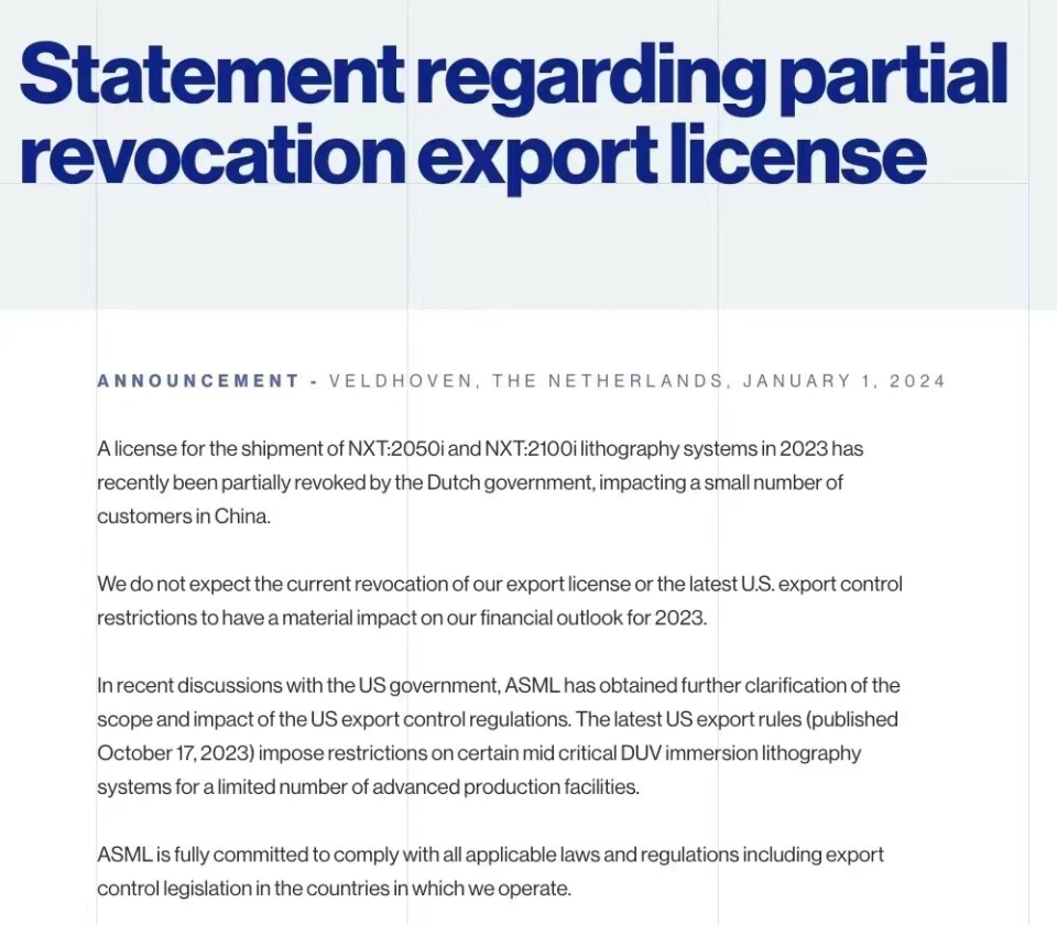 内容提要:该来的终究会来,新年第二天,荷兰政府吊销了ASML向中国出口部分芯片制造装备的答应。早在2023年初,美、荷、日三个光刻机财产链最紧张的三个国家,就告竣了对部分国家禁售中高端光刻机的协议。跟随美国对我禁售光刻机,荷兰不怕搬起石头砸自己的脚吗?克制部分ASML中高端光刻装备对华贩卖,对中国芯片财产有什么影响? 一、该来的终究会来,新年第二天,荷兰政府吊销了ASML向中国出口部分芯片制造装备的答应。10月2日,新年第二天,法新社消息称,环球微处置处罚器制造巨头、荷兰半导体巨头阿斯麦ASML发布公告称,在美国对这一战略行业施加压力的情况下,荷兰政府吊销了该公司向中国出口部分芯片制造装备的答应,该公司的先辈芯片制造装备已被克制出口到中国。此举将对阿斯麦ASML在中国的少数客户产生影响。 法新社在报道中称,在10-11月份中国入口ASML的光刻机激增10多倍后,美国官员接洽了荷兰政府。荷兰外交发言人表现,出口答应证是根据荷兰国家安全逐案评估的。 光刻是指晶圆被放入光刻机中,光线会通过掩模版投射到晶圆上,光刻机的光学体系将掩模版上筹划好的电路图案缩小并聚焦到晶圆上的光刻胶。当光线照射到光刻胶上时,会产生化学厘革,将掩模版上的图案印制到光刻胶涂层上。因此,光刻在芯片制造过程中至关紧张。而光刻机也被誉为半导体皇冠上的明珠。 二、早在2023年初,美、荷、日三个光刻机财产链最紧张的三个国家,就告竣了对部分国家禁售中高端光刻机的协议。2023年初,美国与荷兰和日本,告竣了对先辈芯片制造装备实行出口限定的划一意见,旨在制止东方国家得到可用于武器制造和高科技产物的开始进芯片。 2023年6月30日,荷兰政府根据年初与美日告竣的意向,发布了有关半导体装备的出口管制新规定,其时就规定ASML必要向荷兰政府申请出口答应证,才气对外贩卖开始进的浸润式DUV体系(即TWINSCAN NXT:2000i及后续推出的浸润式光刻体系)。 美国商务部于10月17日发布了对华半导体出口管制终极规则,进一步加严对人工智醒目系芯片、半导体制造装备的对华出口限定。 美国商务部在10月份扩大了针对中国的出口管制规则后,中国的入口量一连两个月飙升。在有关光刻体系的部分,美国废除了实用于某些深紫外线(DUV)工具的微量规则,该规则比荷兰政府9月份见效的出口规则设定了更高的标准。 不外必要指出的是: 第一、美、日、荷出口管制的对象并非全部浸润式DUV光刻体系,仅针对沉积装备和浸润式光刻体系。以后次ASML的声明中也可以看到,美国新规限定的也是特定型号的中高端DUV浸润式光刻机。 第二、如果非美国公司的任何产物含有至少25%的美国原产技能,按规则赋予华盛顿对该产物的长臂管辖权。 第三、ASML 首席实行官 Peter Wennink 表现,最新的限定步伐并不针对绝大多数中国客户。由于这些客户涉足的是禁售范围外的成熟或传统的半导体制造,即28纳米及以上的半导体制造。 三、跟随美国对我禁售光刻机,荷兰不怕搬起石头砸自己的脚吗?作为环球半导体行业的创新领导者,1984年建立的ASML公司,提供涵盖硬件、软件和服务在内的全景光刻办理方案,资助芯片制造商在硅晶圆上批量刻制图形。同时,ASML也是现在天下上唯一利用极紫外光(EUV)的光刻机制造商,环球全部的芯片制造厂,都必须购买ASML的装备,它的光刻机,可谓是天子的女儿不愁嫁。 2022财年,ASML环球净贩卖额达212亿欧元。 2023年10月18日ASML公布的最新财报表现,2023年前三季度,ASML环球贩卖额达203亿欧元,来自中国的收入约53亿欧元,占比26%左右。毛利率在50%-51%之间。预计整年贩卖额可达270亿欧元以上,增长30%。 其时ASML还在财报发布会上称,只管环球半导体行业团体处在周期谷底,但到其时为止,ASML还属于产能不敷的状态,由于其时ASML手里另有未生产的订单350亿欧元,相称于其一年的产能。总体上讲,ASML的光刻装备供不应求。 现新的出口管制政策,按照ASML中国区披露的情况,大概只对在中国的贩卖产生10%-15%的影响,约莫影响贩卖额7-10亿欧元。相称于整个ASML年贩卖收入的2.6%-3.7%。 以是荷兰的阿斯麦ASML公司表现,这些出口限定不会对该公司的财务远景产生实质性影响。2日在荷兰股市综合指数(AEX)上涨的情况下,阿斯麦股价在阿姆斯特丹证券生意业务所收盘下跌2.8%。 四、克制部分ASML中高端光刻装备对华贩卖,对中国芯片财产有什么影响?按照我国外交部发言人汪文彬的说法,对中国禁售部分中高端光刻机,这种活动 严峻违背国际贸易规则,严峻侵害环球半导体财产格局,对国际财产链和供应链的安全与稳固造成严峻结果。实际上,就是对我们的芯片财产链和供应链会产生肯定的影响。 第一、由于禁售的是沉积装备和浸润式光刻体系,影响紧张体现在高端芯片制造上。 从装备代价上看,被禁售的装备占天下光刻装备总需求的10%-15%。这一块的影响肯定黑白常大的,由于独此一家,无可更换。网传的堆积什么的,另有网传的华为攻克了难关什么的,都是妖言惑众。否则从逻辑上讲,外交部发言人就没须要品评美国、荷兰的禁售决定了,禁什么我们就攻克什么,我们不是还应该感谢他们给我们提供了克难攻坚的动力了吗?! 第二、我们担心荷兰禁售范围扩大化,还提前会合入口了一批光刻装备。 2023年12月22日《南华早报》报道,在美国加强限定后,我国11月入口荷兰芯