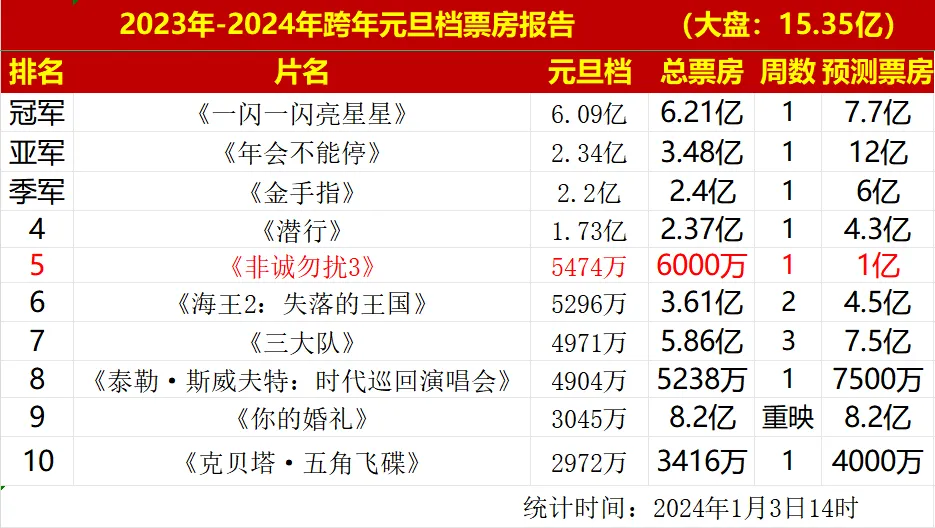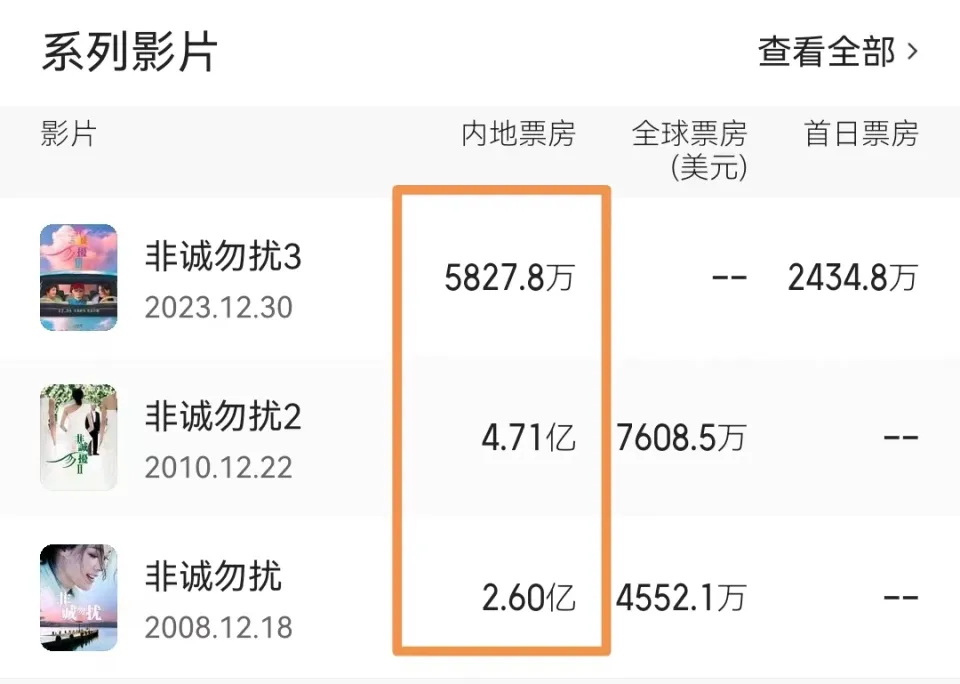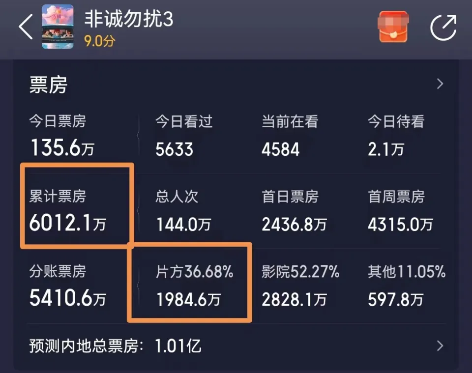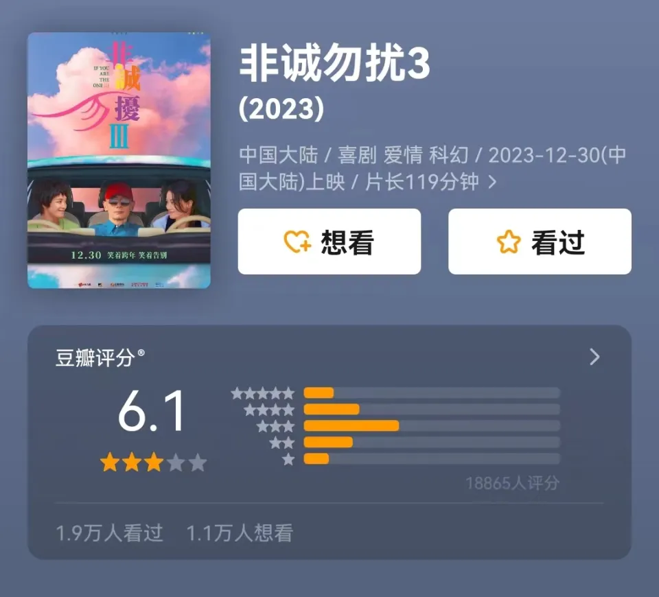 您还记得,在1996年中心电视台春节联欢晚会上,有一个蔡明和郭达演出的小品叫《呆板人趣话》吗? 小品中,只身已久的郭达订购了一台入口的呆板人做妻子,蔡明乐成塑造了各种性格的呆板人,爆笑全场的同时,让天下观众印象深刻。 这个小品的原创编剧是冯小刚和张越,没错就是各人熟悉的导演冯小刚,现在,他又将这个小品的创意制作成一部贺岁大片了。 这便是热映中的《非诚勿扰3》。 一、 开门红! 2023年圆满画上了句号,2024年新的征程我们来了! 中国影市2024年第一个小档期准期而至——跨年元旦档(12月30日至1月1日),我们制作的票房排行榜怎么能落下呢? 元旦三天假期本地票房陈诉,大盘统共拿到15.35亿,突破了2021年同期13.03亿的票房结果,创下了这项新的记录,假期内观影人次高达3635万名。 前三甲为《一闪一闪亮星星》《年会不能停》和《金手指》。 芳华奇幻爱情片《一闪一闪亮星星》成了最大的赢家,元旦档轰下6.09亿票房,拔得头筹,制片方利用精准营销噱头,让主力观影人群走进了影院。 跨年档“张万森下雪场”,定位了目的人群,谁不想在如许一个特殊时间留下芳华影象呢?该死它赢利! 大鹏、白客和庄达菲主演的《年会不能停》紧跟厥后,档期内斩获2.34亿,夺得亚军。 院线高产影戏人大鹏又来了,他的观众缘着实太好了。 除了《煎饼侠》口碑不佳之外,大鹏别的的影戏都体现很棒,客岁五部新片劳绩颇丰,这次《年会不能停》还找来了“王大锤”,上映后口碑绝佳,将会反超《一闪一闪亮星星》实现长线大卖。 刘德华两部新片《金手指》和《潜行》分别位居第三和第四名,一部金融商业片,一部香港警匪片,固然票房没有大爆,但也不至于亏损,终极收支平衡实现小幅红利,毫无题目。 本次跨年元旦档堪称史上最卷的一届,浩繁新片扎堆上映,都想分上一杯羹,那怎么大概呢? 一样平常来说,如许的小档期只能容纳3部新片,高出了肯定会出现炮灰影片。 在未出数据之前,我很为刘德华的《潜行》捏一把汗,由于他要面临本身对打本身的局面,影迷观影将会被分散,对他非常倒霉。 没想到,我的担心是多余的,最大的炮灰不是《潜行》,而是冯小刚的《非诚勿扰3》。 这部影片在元旦档中收到5474万票房,位居第五名,不消笔者啡哥多说,明眼人一看,如许的票房对标阵容和宣发本钱,铁定扑街了。 1月3日制止发稿时,《非诚勿扰3》票房惨败,5天仅收6000万,成为本届元旦档最大的“炮灰”影片。 二、 没办法,现实就是这么暴虐,冯小刚也不破例! 5天收6000万,猜测票房1亿元左右,根本公布《非诚勿扰3》扑街了,那这内里谁亏损最大呢? 影片于2023年2月立项乐成,其时的制片方为中影和东阳美拉传媒公司。 后续又增长了中影创意、华谊兄弟、新疆博纳润泽文化传媒有限公司。 此中,中影创意为中影旗下公司,华谊兄弟为王中磊和王中军的公司,别的新疆博纳润泽为博纳旗下子公司。 东阳美拉是2015年冯小刚建立的公司公司,厥后搞对赌条约,让王中磊收购了70%的股份,紧张股东为华谊兄弟的王中磊和冯小刚。 也就是说,《非诚勿扰3》的紧张资方是华谊兄弟和冯小刚本身。 网络上面流传《非诚勿扰3》预算本钱有两个版本,一个说是3.5亿,一个说是2亿左右,根据观影后我本身预估,该片绝对不是大制作,最大的本钱为演员片酬和后续宣发费用。 以是,预计本钱会在1.5亿左右,院线回本票房为4.5亿,再去掉影片中的植入收入,和后续卖给流媒体播放版权收入,票房保底为3亿,才有大概到达收支平衡状态。 而现在只有6000万,就按照1亿盘算,分账票房也只能劳绩3600万元,预计亏损8000万左右,从而可以判断冯小刚王中磊亏损已成定局。 华谊兄弟原来日子就不好过,自《八佰》之后,也就《前任4》赚了一点,别的没有什么重磅大片问世,前年11月份还大裁人了一次。 冯小刚的《非诚勿扰3》票房惨败,让原来就不好过的华谊兄弟落井下石。 三、 同样都是贺岁笑剧片,《一闪一闪亮星星》和《年会不能停》都实现了票房大卖,而《非诚勿扰3》为何会云云惨淡呢? 主演阵容有葛优和舒淇,别的范伟、姚晨、李诚儒、关晓彤、虞书欣、岳云鹏、常远等演员倾情加盟,张涵予、王宝强等客串出演。 影片制作阶段得到圈内很多朋侪大力相助。 故事内容一连前作,葛优扮演的秦奋见不到妻子笑笑(舒淇扮演),老范有些心疼,就弄了一个智能仿生人笑笑送给秦奋。 与假笑笑的相处中,秦奋徐徐产生了暗昧的感情,这时间真笑笑返来了,秦奋这可怎样是好呢? 《非诚勿扰3》票房不好紧张有以下几个方面: 第一,主打情怀,而情怀那批人不进影戏院了。 第一部作品是2008年冯小刚导演的,在谁人本地银幕稀缺的年代,能取得2.6亿票房,着实是不容易。 两年后,冯导又制作了续集《非诚勿扰2》,同样口碑票房非常出彩,票房也井喷到达4.7亿,合法各人以为这个系列完结的时间。 冯小刚硬是要重启这个系列,创意紧张来自蔡明和郭达的小品《呆板人趣话》,想用这种情怀方式,给这个系列画上一个美满的句号。 《非诚勿扰3》隔断第一部上映已往15年,隔断小品《呆板人趣话》也已经已往了27年,看过这个系列的人群,根本都高出了35岁以上,大部门都在40岁至50岁之间了。 我们再看看《一闪一闪亮星星》的观影人群,根本上都是20岁至28岁之间,这部门人现在就是中国影坛主力观影人群,高出40岁以上的观众,很少可以或许吸引他们