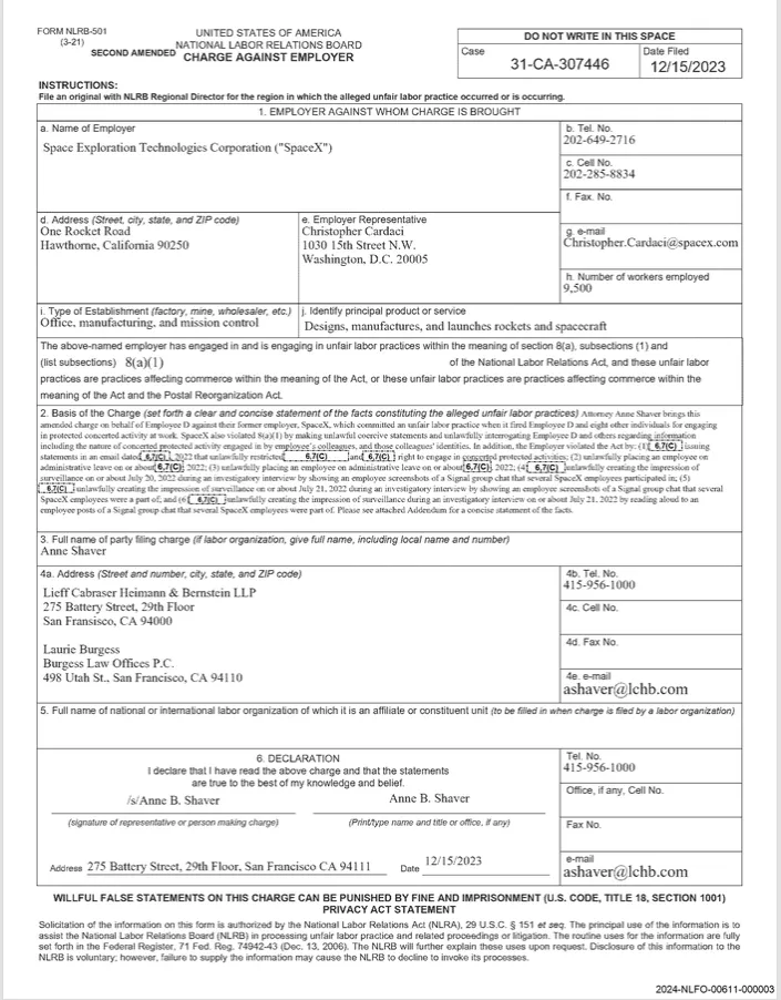 IT之家 1 月 4 日消息,客岁 11 月,8 名 SpaceX 前员工向美国劳工委员会(NLRB)提出申说,声称他们因公开反对埃隆-马斯克而被开除。本地时间周三,NLRB 公布对 SpaceX 发告状讼。 2022 年6 月,一群 SpaceX 员工草拟了一封公开信,公开品评 SpaceX 首创人兼 CEO 马斯克,表达了对马斯克活动“经常引起分心和尴尬”(IT之家注:指马斯克试图收购推特一事)的担心,并渴望高管们可以或许让公司的文化更具包涵性。 NLRB 于周三提交的控告中求全谴责 SpaceX 扣问员工是否到场这封公开信,并告诉员工不要讨论这些扣问内容。NLRB 发言人卡拉布拉多(Kayla Blado)告诉路透社,SpaceX 陵犯了员工们团体夺取更好工作条件的权利。 NLRB声称,SpaceX 通过阅读和展示员工之间消息的截图“创造了一种监督(员工的)印象”,并试图制止员工发布公开信。别的,SpaceX 还涉嫌“诱导员工辞职,并威胁如果他们到场构造运动将予以开除”。 NLRB 要求 SpaceX 在 120 天内张贴一份关于员工权利的关照,并要求该公司为其开除的每位员工写致歉信。除非 SpaceX 试图办理控告,否则将于 2024 年 3 月 5 日举行听证会,不外 SpaceX 也可以向委员会提出上诉,并向联邦上诉法院申请上诉。 |