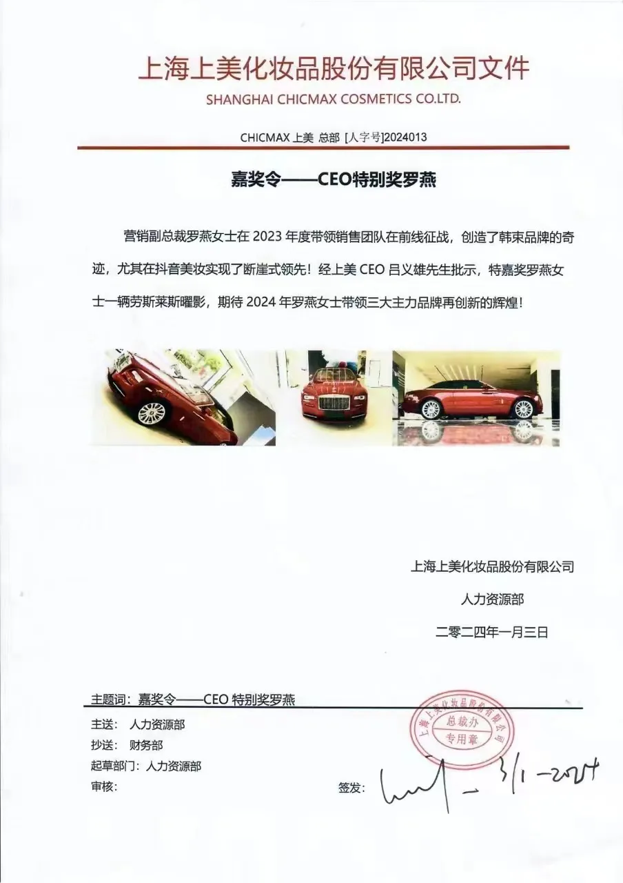 1月4日,一家公司CEO发公文夸奖贩卖劳斯莱斯的截图在网络热传,根据文件内容表现,上海上美化装品股份有限公司发布夸奖令,称营销副总裁罗燕密斯在2023年度向导贩卖团队在抖音美妆实现了断崖式领先。经上美CEO吕义雄老师指挥,特夸奖罗燕密斯一辆劳斯莱斯曜影。 这一公文主主体上海上美化装品股份有限公司,旗下化装品重要为韩束品牌。据《鹏友圈》相识,这一发文为真。尚有知恋人士称,上海上美首创人兼CEO吕义雄,与罗燕关系非比寻常。 别的,跟据青眼谍报,上美股份旗下韩束品牌12月以来每周贩卖额破亿,占据抖音美妆榜第一。在2023年整年抖音美妆榜单中,韩束以超33.4亿元的GMV赶超一众国表里大牌,位列抖音美妆类目TOP1。 罗燕在2012年3月到场上海上美,十多年的时间里,她在公司历任多个职位。2015年1月至2020年2月担当首席运营官,2020年3月被任命为公司副行政总裁,重要负责新兴媒体平台电商,同年2020年5月获委任为实行董事。在上海上美披露的董事会名单中,罗燕紧随吕义雄,排名第二。 在刚刚竣事的大颜值财产年会上,吕义雄总结,上美股份刚刚走过沼泽地,于2023年开始规复增长并实现突围。而在这背后,2023年的战略规划“重回增长八大方法论”具有不可消散的功劳。这八大方法论分别为:1、重兵抖音;2、聚焦韩束;3、聚焦韩束红;4、聚焦韩束红礼盒;5、全渠道同一价、同一长处点;6、聚焦日销,而非大促;7、只学习不模仿,走本身的路;8、避开竞品,找本身的舒服区。 |