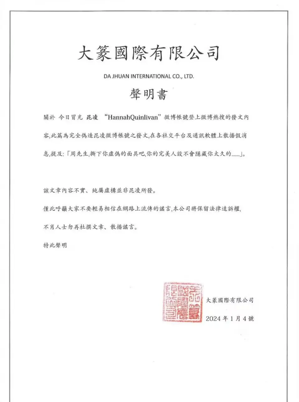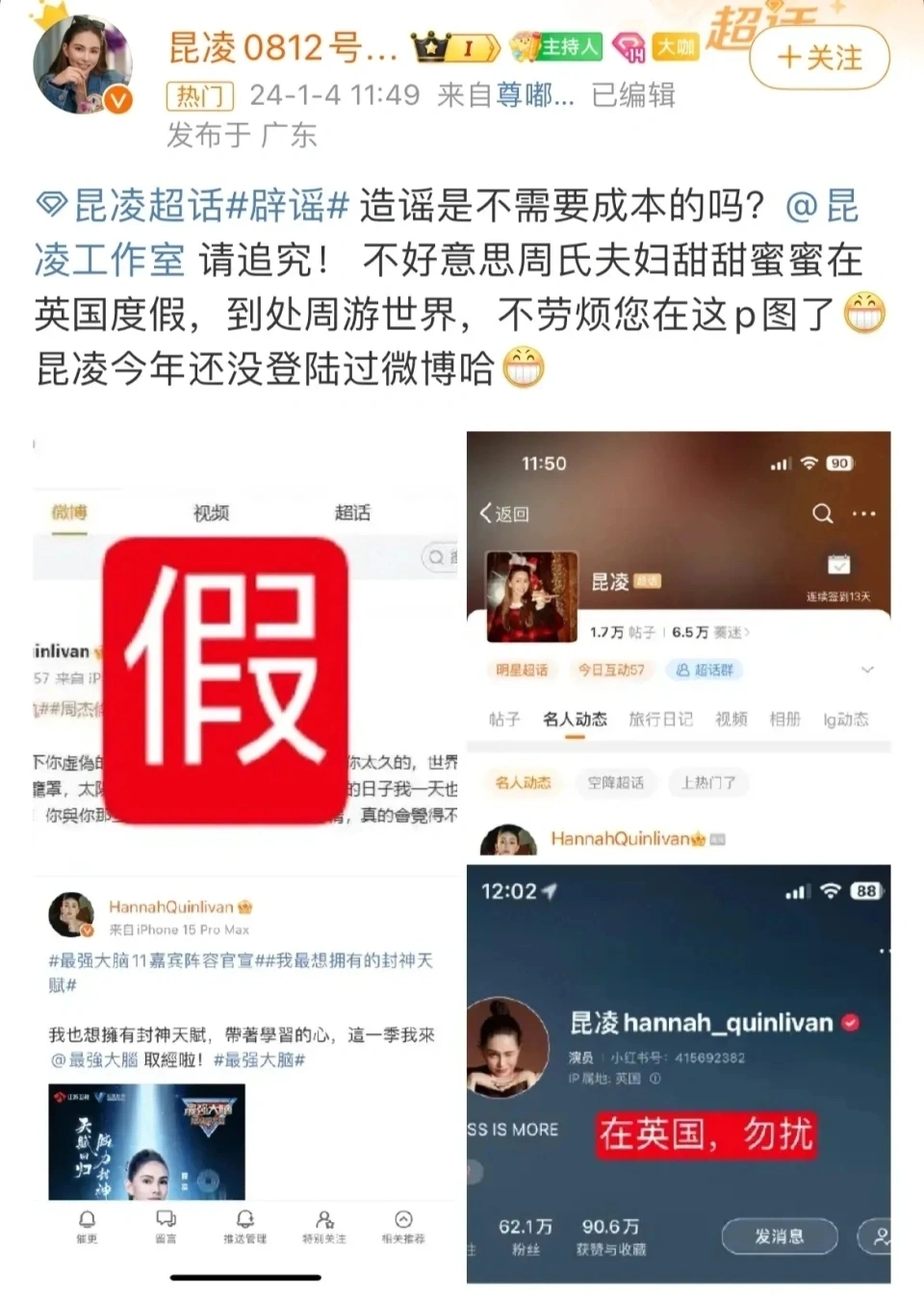 1月4日,昆凌通过外交账号发布了一则公司声明,回应了网传的“昆凌发文控诉44岁周杰伦出轨,秒删博文”一事,引起网友热议。 声明中,昆凌方否认了网友的爆料,表现该文章内容不实,纯属假造并非昆凌所发,盼望各人不要轻信谎话。 同时,昆凌方将保存法律追诉的权利,盼望造谣者不要再恶意杜撰文章、散播谎话。 昆凌方在声明中的言辞还是比力严肃的,看得出来,该谎话对昆凌已经造成了不小的困扰。 此前,有网友在网上爆料称“昆凌发文控诉周杰伦出轨后秒删”,并配了一张疑似昆凌个人外交账号发文的截图。 截图内容是以一种非常愤怒的语气控诉周杰伦出轨,跟好友一起多人运动,还直言让他撕下卖弄的面具,完善人设藏不了多久等等。 爆料一出,瞬间引起网友热议,究竟从爆料来看,发文的账号表现的就是昆凌的外交账号,以至于不少网友信以为真。 有人为昆凌感到不值,有民气疼昆凌和周杰伦的孩子们,尚有不少人直接就怒斥周杰伦对不起粉丝的喜好,直言他“该死塌房”。 不外也有许多网友保持理性的看法,以为所谓的“昆凌控诉周杰伦出轨”的爆料真实性存疑。 最直接的证据就是,在2023年年末时,周杰伦还晒出了他和昆凌以及孩子一起看烟花的照片,同时还配文表现“家人永世在第一位”。 不但云云,二人克日还在同一个地点拍摄了照片,从照片就能很显着地感觉到昆凌其时的幸福,两口子恩爱的很,怎么大概会像爆料人说的那样? 紧接着,昆凌的大粉便发文辟谣了,怒斥爆料人造谣,称昆凌和周杰伦正在英国旅游,并晒出了干系证据,比如在爆料人发帖之前,昆凌并未登录过微博账号,而且昆凌的另一个外交账号上明白表现IP地点是在英国。 变乱发展到这里,昆凌大粉的回应着实已经可以大概证明爆料内容的卖弄,大部分网友也更加信托根本就没有“周杰伦出轨”一说。 但即便云云,还是有不少网友质疑,以为“娱乐圈明星都一个样”“无风不起浪”等等。 变乱徐徐发酵后,于是我们就看到了昆凌发布了一则公司的声明,否认了爆料内容。不但云云,周杰伦公司杰威尔音乐敏捷转发了昆凌方的声明,再度辟谣。 昆凌方和周杰伦方双双举行辟谣,足以阐明爆料内容的卖弄,同时也让各人看到了造谣者貌寝的嘴脸,信托以后类似的谎话应该不会再出现了。 据悉,昆凌是中国台湾省艺人,跟华语乐坛着名歌手周杰伦的恋情于2014年公开,2015年1月17日在英国举行的婚礼。 2024年1月4日,新一季的《最强盛脑》刚公布完昆凌将担当高朋加入节目次制。 |