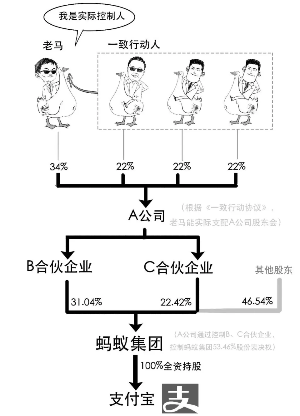 近来,付出宝传来大消息, 央行已经同意付出宝变更为无实际控制人。 付出宝作为第三方付出公司, 受到央行的一样寻常羁系。 在实际生存中,无实际控制人的公司还是满多的,一样运行的很好。付出宝的这次变更,并不影响公司的正常策划。 简单明白, 付出宝没有了单一的个体可以或许对企业的运营和决定产生决定性影响。 通常来说,拥有一家公司的股份数目越多,表决权就越大,对公司的掌控就越大。 (固然也有破例环境,比犹如股差别权,我们从前说过,这里就不睁开了) 所谓实际控制人,就是通过投资关系、协议大概其他安排,拥有较大的表决权,可以或许实际支配公司运动的人。 此中, 投资关系重要是指持有股权的运动, 比如直接持有股权,大概通过基金公司投资。 协议重要指通过代持协议、投资协议等来控制公司。 所谓代持是指本身不直接持有股权,而通过签署协议,找机构大概个人代为持有股权等的运动。 而其他安排一样寻常是指支属代持、员工代持等等。 实际控制人通过这些方式,成为对公司拥有实际控制权的人。 这里我们再增补一个概念,叫做划一办法人。简单的说,就是为了共同长处作出划一办法的人。 划一办法人为了划一对外,当一个股东的表决权不敷用时,就必要聚集多个股东告竣划一意思的表决。 这时间,就由划一办法人通过让渡表决权的方式,将表决权会合到个别股东手上,从而扩大该股东对公司股权的控制,如许能进步决定服从大概对抗其他股东对公司的控制。 对于上市公司而言,划一办法人就是指投资者通过协议或其他安排,与其他投资者共同扩大其所能支配的一个上市公司股份表决权数目标运动或究竟。 明白了这些根本概念, 那么为什么说付出宝原来是有实际控制人的? 付出宝原先的股权布局大抵是如许: 可见,这时间老马通过划一办法协议,拥有蚂蚁团体53.46%的表决权,成为蚂蚁团体的实际控制人,而付出宝由蚂蚁团体全资持股控制。 那到底什么样的公司才算没有实际控制人呢? 1、 股权布局分散, 不存在持股50%以上的控股股东。 2、 不存在实际支配公司股份表决权凌驾30%的环境。 3、 股东间没有划一办法协议。 4、 单个股东无法控制股东大会,大概单个董事无法控制董事会; 单个董事、高级管理职员无法支配公司庞大财务和策划决定。 这次股权调解后, 我们看看付出宝公司的股权布局发生了什么厘革: 调解后,老马的表决权降落到6.208%,各重要股东独立利用蚂蚁团体股份表决权,没有了划一办法的关系。 至此,不再存在任何直接或间接股东,单一大概共同控制蚂蚁团体的情况,付出宝也就没有了实际控制人。 表决权相对分散,可以实现更好的相互制衡,防止一股独大,公司管理也更妥当透明,这是一种更今世的企业管理模式。 总之,蚂蚁团体完满了公司管理布局,有利于公司长远可一连发展。 那么,蚂蚁上市是不是又要提上日程了? 好了,本日就说到这吧。 |