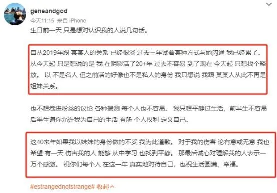 1月5日,孙燕姿妹妹孙燕美忽然发长文公布要和或人断绝关系,且言语间说的此人是位明星,自己不想到场近粉丝的议论和臆测中,外界纷纷推测她是在说孙燕姿。 孙燕美说,自己在对方的阴影下生存了20多年,由于或人的关系,自己就算不是名士,也没有私生存,以后两人不再是姐妹关系。孙燕美还说自己身为妹妹,也曾伤害过姐姐,但对方也给自己带来了许多痛楚。 如许不管掉臂的公开家事,能看出孙燕美确实很瓦解也很愤怒,时间点选得照旧生日前一天。不禁让人想起从前孙燕姿为这个妹妹庆生时配的文案,称对方挑剔又讨厌,看来两姐妹的关系不停很玄妙。而孙燕姿末了一次给妹妹庆生就是2019年,孙燕美这次也提到从那年开始两人就没什么来往了。 孙燕姿家中有姐妹三个,大姐孙燕佳是新加坡某银行的副总裁,工作本事很强,是闻名的铁娘子。而孙燕美是最小的妹妹,和二姐孙燕姿年岁相称,两人长得也很相似,在外人眼里她们就像双胞胎,尤其孙燕姿成名后,孙燕美在表面常常被认错是姐姐,周杰伦、郑秀文都曾认错她。 大概这就是孙燕美说的不停生存在对方的影响下吧,由于太过相像,很容易就会影响到自己的正常生存。以是这些年孙燕美着实不停生存在澳大利亚,她此前是医学硕士,不知道现在是否从事相干工作。 由于孙燕美曾说过,姐姐成名前自己很受接待,但孙燕姿着名后,她常常被倾轧孤立,结业后也找不到工作,姐姐曾帮她做了一个关于风衣的项目。可见孙燕姿很照顾姐妹们,也渴望通过自己帮她们过得更好。 客岁孙燕美还发布孙燕姿和家人们的合照,称自己很倾慕姐姐,不停有父母的陪同,言语间尽显失落,毕竟她在国外多年,应该也很渴望家人的关心爱护吧。之后有人问孙燕美和二姐另有没有接洽,她说对方一天都没有复兴自己的信息。 着实孙燕姿前些年常常自动发姐妹们的照片,她是个很器重家庭的人,这些年除了工作以外,很少外出交际,偶然间就陪同家人。而且看每次的合照,姐妹们都很开心也很融洽。 而且孙燕姿2011年就完婚了,老公是个长相帅气的富豪,两人先后生下了一对儿女,生存的很幸福。按理说孙燕姿寻常照顾自己的小家庭都来不及,怎么会偶然间和心情和外家人闹抵牾呢?何况是个常年远在澳洲生存的小妹妹,这此中的黑幕也让人好奇。 只是孙燕美常常在交际平台发布一些不开心的言论,大概她真的由于常年和家人分隔两地,感觉自己不被爱,被别人夺走了父母的关注吧。但怎么说也是亲姐妹,有标题照旧要好好沟通,在网上关照网友是没用的。 免责声明:文章为林大家娱乐团队原创,克制抄袭转载,图片来自网络,侵权请接洽删除。更多娱乐资讯尽在林大家。 |