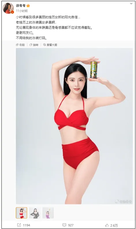1月6日,演员徐冬冬(@徐冬冬 )在交际媒体发文,回应“椰树泳装挂历争议”:“小时间看到很多美丽的挂历女郎的阳光自大……老挂历上的泳装玉人多美啊,无论显现身材的丰腴美还是骨感美都不应该以为羞辱。谢谢网友们。不消给我的泳装打码。 ” 据@白鹿视频 报道,克日,网友发出椰树2024年日历图片引发讨论。有网友以为这种比基尼玉人及猛男配图低俗无法继续。也有网友以为很正常,很多老日历也是如许,康健丰满的审美没什么,留言想要。4日,椰树工作职员回应称,此款日历确实有,现在没有购买渠道,当地大批量供应商会有。日历不出售,仅用于内部生存。 这并非椰树第一次因“擦边内容”卷入争议。 汹涌消息报道,从直播间里身着紧身衣服,暴露长腿,在各种神曲的动员下热舞,并展示鲜榨椰汁、椰子油、矿泉水等产物的丰满玉人,再到身高1米85的肌肉猛男们妖娆的演出画面,由玉人与猛男构成的主播团,为了吸睛使出浑身解数。 有网友表现以为直播风格有特点,但也有网友直呼“辣眼睛”,“不绝行走在擦边最前沿!” 九派消息报道,2023年6月,椰树团体初次正面继续媒体采访,回应直播风格题目。 椰树直播间运营方、海南记得开心文化传媒有限公司相干负责人称,热舞的直播风格是为了表达“男子有男子味,女人有女人味,椰汁有椰汁的味道,主打原汁原味”的中心头脑,“跟市面上的完满是不一样的。” 该负责人表现,对于男女模特,椰树团体有本身的一套审美和选人尺度,审美趋近于90年代审美。“男生要1米8以上,有肌肉,长得阳光,女生曲线动人,都得白白嫩嫩。” “男主播也好,女主播也好,辨识度非常高。”工作职员称,无论男女模特,都要求自然真实阳光,辨识度高。“广告词也非常故意思,对峙在海南岛用奇怪椰肉榨汁,敢答应不哄人,我们选模特也是如许,真实的,自然的,敢答应不哄人。” 对于网络上对于椰树的负面标签,对方表现,会恭敬差异意见,秉持包容心态,对峙本心,“盼望我们不会在网友的意见当中失去本身。” 天眼查APP体现,椰树团体海南椰汁饮料有限公司创建于1998年2月,法定代表人为张武,注册资源约5286万人民币,策划范围包罗饮料的生产、贩卖及批发等。 本文系观察者网独家稿件,未经授权,不得转载。 |