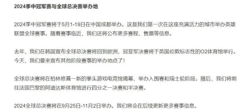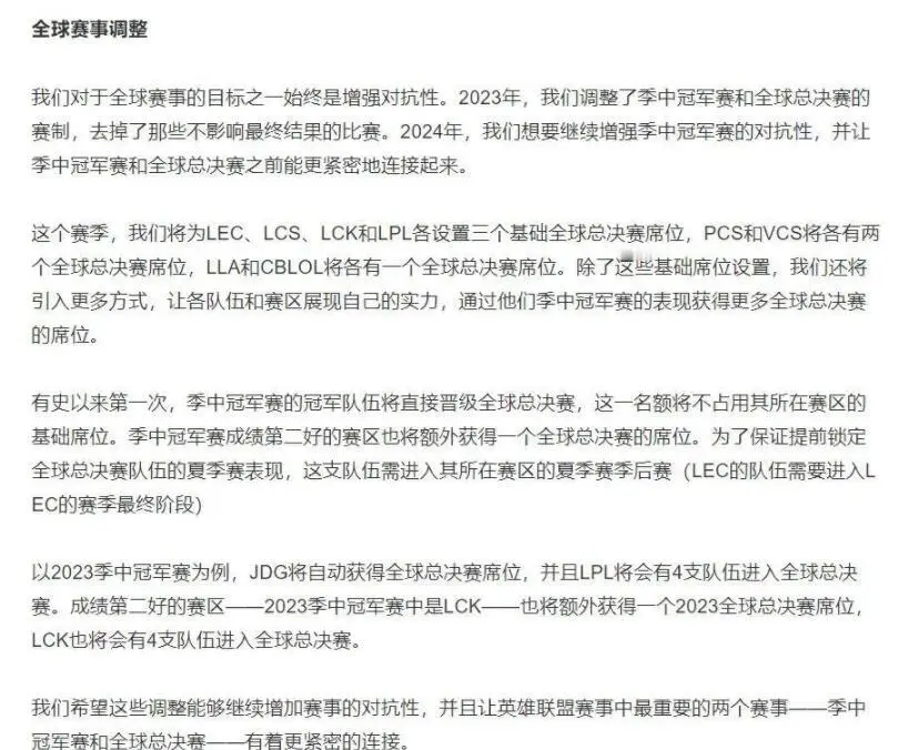 迩来关于电竞圈的话题非常多,信托各人也不绝在关注这方面的内容,这段时间我们赛区正在打德杯,在德杯之外,实在另有很多话题值得各人讨论,比如迩来拳头方面就发布了很多新规定,对S14举行大调解。 拳头先是公布了对新舆图的调解,下赛季的舆图在三条路上都发生了很大的厘革,下赛季开始比赛强度将发生翻天覆地的厘革,而且拳头也表现将取消神话装备的设定,这个是玩家们团体同意的事变。 除此之外,迩来拳头还公布了新好汉,如今还不知道技能是什么,只知道是一只龙,除此之外,拳头还公布S14天下赛规矩,内容就是各大赛区规复3支战队名额,而msi冠军将直通S赛,这也引起了热议。 官方的原文表现:从来岁开始,LPL、LCK、LEC赛区将只有三个S赛固定席位,能否拿到第四个席位取决于MSI结果。如果是如许的话,那各大赛区按规定只有3支战队加入,如果哪个赛区拿到msi冠军,就有4个名额。 由于第二条规定就是msi冠军直通S赛,不外这又引发另一个话题,由于规定写的不是很清晰,如果msi直通天下赛,那夏季赛的结果中,前三名进入天下赛,而msi冠军又是这三支战队中的一支,那要怎么算呢? 是次序今后连续,四号种子也能进入天下赛吗?照旧msi冠军也占用一个名额,那msi是否直通S赛似乎没有什么作用,由于能拿到msi冠军的战队,夏季赛的结果肯定不会差的,拿到前三名标题不大。 除此之外,拳头还公布24年的msi将在中国成都举行,可以让各人好好感受一下成都的魅力了,很多人都挖苦,去成都比赛,估计只有中路是直的,话说返来,这次拳头公布了这么多新规,你们以为哪些是好的,哪些又是没须要的呢?对此你们有什么想说的吗? |