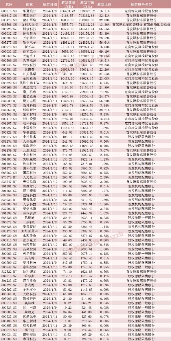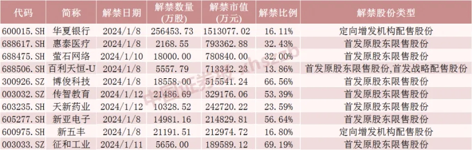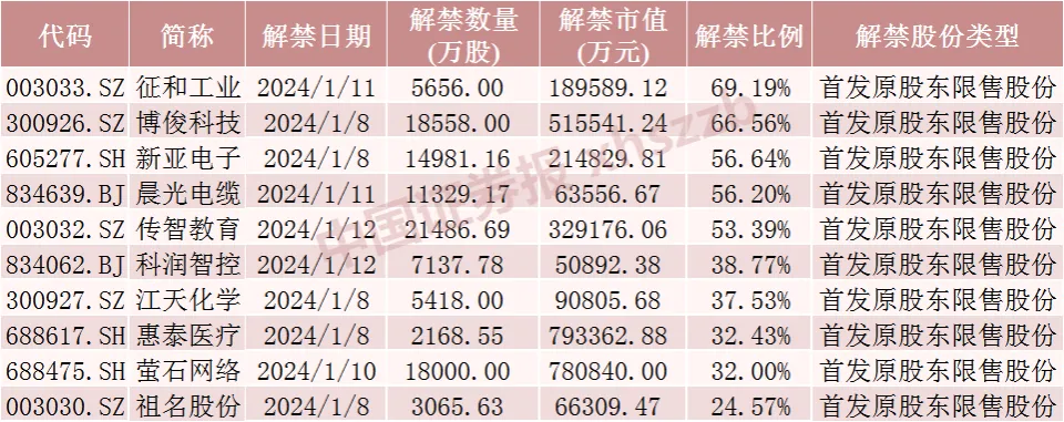 Wind数据表现,除将上市的新股外,下周将有74只股票面对限售股解禁,合计解禁量为53.56亿股;按最新收盘价盘算,合计解禁市值为700.96亿元,较本周解禁市值镌汰35.04%。 从解禁股情况来看,中原银行解禁金额将超150亿元,惠泰医疗、萤石网络、百利天恒-U解禁金额将超70亿元,博俊科技、天新药业、征和工业流畅盘将增长超200%。 4只股票解禁市值将超70亿元 数据表现,按最新收盘价盘算,中原银行、惠泰医疗、萤石网络、百利天恒-U解禁市值居前,解禁市值分别为151.31亿元、79.34亿元、78.08亿元、71.33亿元。 详细来看,Wind数据表现,中原银行1月8日将解禁25.65亿股,均为定向增发机构配售股份。惠泰医疗1月8日将解禁2168.55万股,均为首发原股东限售股份。萤石网络1月10日将解禁1.80亿股,均为首发原股东限售股份。百利天恒-U1月8日将解禁5557.79万股,为首发原股东限售股份和首发战略配售股份。 数据表现,下周解禁市值居前的为中原银行、惠泰医疗、萤石网络、百利天恒-U,1月以来涨幅分别为4.98%、-5.83%、-3.39%、-8.26%。 下周解禁市值前十股票 详细来看,下周解禁市值最大的为中原银行,解禁股东为北京市底子办法投资有限公司、国网英大国际控股团体有限公司、首钢团体有限公司3个股东,分别为中原银行第四、第二、第一大股东。这些股东下周解禁的股份来自于中原银行2019年1月完成的定增,彼时的定增发行价为11.40元/股。 数据表现,制止1月5日收盘,中原银行股价为5.90元/股,市值为939亿元。3年时间已往,盘算期间分红后,中原银行下周解禁的股票解禁收益率为-33.83%,合计浮亏金额超70亿元。 中原银行解禁详细信息 解禁市值第二大的是惠泰医疗,解禁股东为成正辉、成灵,分别为惠泰医疗第一、第二大股东,且成正辉、成灵父子为惠泰医疗的现实控制人。 数据表现,制止1月5日收盘,惠泰医疗股价为365.85元/股,市值为245亿元。上市以来,惠泰医疗后复权股价相较发行价累计上涨396.93%。 惠泰医疗解禁详细信息 3只股票流畅盘将增长超200% 相对于解禁市值,解禁比例更能反映解禁对股票的影响水平。 数据表现,下周有5只股票解禁股数目占总股本比例高出50%,分别为征和工业、博俊科技、新亚电子、晨光电缆、传智教导,解禁比例分别为69.19%、66.56%、56.64%、56.20%、53.39%。与当前流畅股相比,这5只股票下周解禁后流畅盘将分别增长234.77%、264.13%、136.22%、128.29%、125.82%。别的,天新药业下周解禁后流畅盘将增长235.92%,即下周共有3只股票解禁后流畅盘将增长超200%。 下周解禁比例前十股票 别的,国科恒泰、天润科技、纳科诺尔等32只股票解禁股数目占总股本比例不敷1%。 下周解禁股全名单 (责任编辑:华青剑) (泉源:中国证券报) |