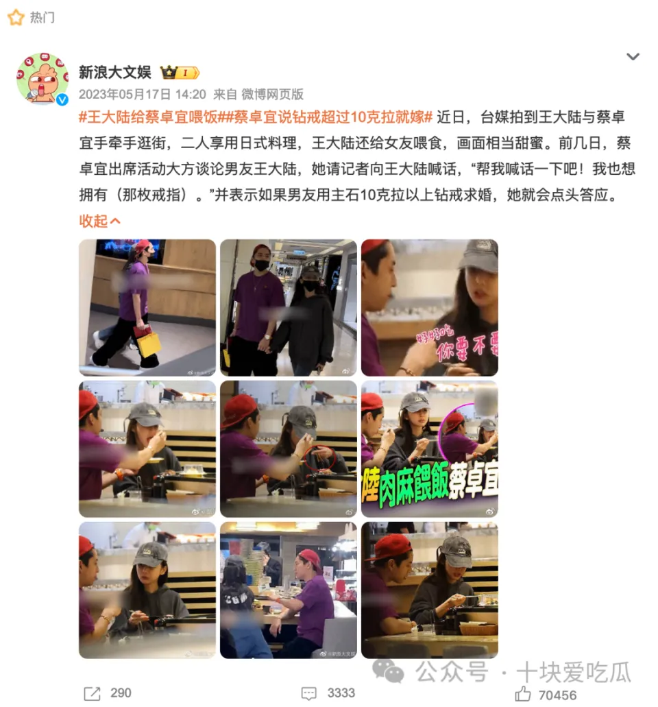 友友们,明星们的恋情真是有点看不懂了。 迩来,王大陆到场影戏《怒潮》记者会,在被问到新恋情时,认可在拍摄期间换了女友,并体现“本身是爱情脑,每天都是恋人节。 拍影戏前,女友是蔡卓宜;拍影戏期间,变成了沐轩。真让人意想不到。 在王大陆官宣新恋情后,相干词条登上微博热搜,引起吃瓜群众的关注。有人吐槽他太花心,也有人说他换女友未免有些太“勤快”了...... (两任女友笑起来都很漂亮) 提及王大陆,想必很多观众都不陌生,代表作影戏《我的少女期间》,票房口碑双丰收,他也因此一举成名,那几年在娱乐圈混的风生水起。 固然现在的人气下滑,但影视资源还算不错,暑期档爆款《孤注一掷》他有参演,迩来主演的影戏《怒潮》也正在热播中。 蔡卓宜也是一个有故事人,她是马来西亚籍女艺人,此前曾有过一段婚史,前夫听说是马来西亚拿督之子,不外这段婚姻只维持了三年左右。 仳离后的她,来当地到场了选秀节目《芳华有你2》,这件事变当时引起了不小的争议,有人说她开创了“仳离女爱豆”的先例。 选秀节目竣事之后,蔡卓宜开始在内娱发展,但由于人气不是特殊高,以是资源很一样平常,比起女明星、女演员的身份,貌似更像是女网红。 王大陆和蔡卓宜结缘于爱情综艺《怦然再心动》,不外女方是到场者,重要是和素人男高朋相处,而男方则是观察员。 故意思的是蔡卓宜没和素人男高朋在一起,反倒是与王大陆“看对眼”了,两人的互动非常甜,因此节目里其他高朋都开始拉拢他们俩人搞对象。 由于这档节目,二人开始传绯闻,还被网友扒出来很多蛛丝马迹,好比同款玩偶,被路人偶遇一起滑雪、逛街、去雍和宫等等。 但要说最锤的那还得是狗仔拍到的画面,视频中二人在陌头亲吻,明眼人都能看出来这已经超出朋侪的边界,总不能说“是给对方嘴巴消毒吧”? 在传了很久的绯闻后,王大陆和蔡卓宜终于官宣恋情,随后并一起到场了综艺《哎呀好身材4》。 在这档节目里,二人不是在撒糖就是在撒糖的路上,小情侣之间的甜度有点超标,而王大在节目里还亲手做普洱茶饼,说要送给蔡卓宜的妈妈, 节目之外,二人的感情貌似也很稳固,感觉是奔着完婚去的。 客岁五月份的时间,王大陆和蔡卓宜被媒体拍到一起用饭,在到场活动的时间,女方还体现:假如用主石10克拉以上钻戒求婚,就会颔首应承。 加上蔡卓宜之前带王大陆回家见父母,以是被外界都以为功德将近。 没想到,到了六月份的时间,二人的ins竟然取关,貌似合照也全部删掉。 随后,蔡卓宜在网上动态,体现“上个月20号到本日发生了太多事变……这个月好漫长”,也被以为吃瓜群众推测是和王大陆打骂大概分手了。 然而,客岁7月份的时间台媒称“蔡卓宜在台期间都住在王大陆台北市信义区的旧家”,但之后二人再没有公开评论过对方,就像从未谈过爱情一样。 时间走到客岁9月份,有媒体拍到王大陆与艺人沐轩逛街,疑似是新恋情曝光;11月份,又有媒体拍到二人一起玩cosplay,互动很密切。 听凭媒体怎么报道,两边就是不回应,直到《怒潮》记者会上,王大陆在正式松口,一口气回应了两段恋情,即与蔡卓宜分手,与沐轩爱情。 有一说一,这两段恋情之间相隔的时间确实是比力近,也难怪网友会多想,直接吐槽王大陆花心,以及内在他「无缝衔接」。 值得留意的是,这并不是王大陆第一次被如许吐槽,由于在此之前他就由于私生存的事变引起过争议,好比与已婚女导演陈玉珊热吻。 据悉,陈玉珊是《我的少女期间》的导演,二人在庆功宴时当着导演老公的面热吻。之后,导演发文表明,称“本身也有颠末老公的同意”。 由于之前说过票房过3亿就会裸泳,没想到竟然到达了这个效果,以是王大陆真的赤身裸体跳泳池庆祝,当时另有很多现场图。 在当地到场何炅和王嘉尔主持的节目时,他还说到了这段履历,体现“这是男子的答应,必须要说到要做到”。 该说不说,还挺耐人寻味的,古迹上的答应不管尺度多多数可以说到做到,但对待恋情与女友的时间,却又是另一种做法。 言归正传,不停听闻湾湾明星玩超大,但在看到消息后照旧会感到震惊。 在走红之后,王大陆在当地的工作时间比力长,和金晨、李沁、张天爱、林允等内娱女星都传过绯闻,有的直接否认了,有的则没有回应。 对于男明星而言,只要不冒犯法律红线,不管谈多少段爱情,被爆出多少绯闻,根本上不会影响古迹,最多像王大陆如许被吐槽几句。 通常看到这种情况,十块都不得不说一句:男艺人是真的挺好混。 (全文完) |