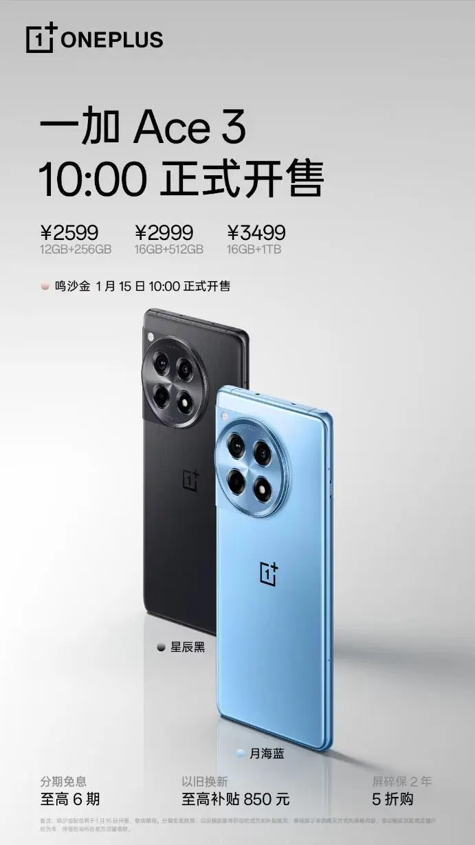 本日上午,一加Ace 3正式开售,不外现在只有星辰黑和月海蓝配色,鸣沙金配色版本则将于1月15日开售。 外貌方面,一加Ace3相沿了家属式的操持语言,硬件设置上则接纳了一块6.78英寸的1.5K东方屏,搭载骁龙8 Gen2主控,以及最高16GB+1TB的存储组合,提供了5500mAh电池、支持100W有线快充,影像方面配备的则是由5000万像素OIS索尼旗舰主摄+800万像素超广角镜头+200万像素微距副摄构成的后置三摄模组。 现在,一加Ace3起步的12GB+256GB版本售价为2599元,16GB+512GB和16GB+1TB版本的代价则分别为2999元、3499元,在同类机型也有着极为突出的性价比表现。 |