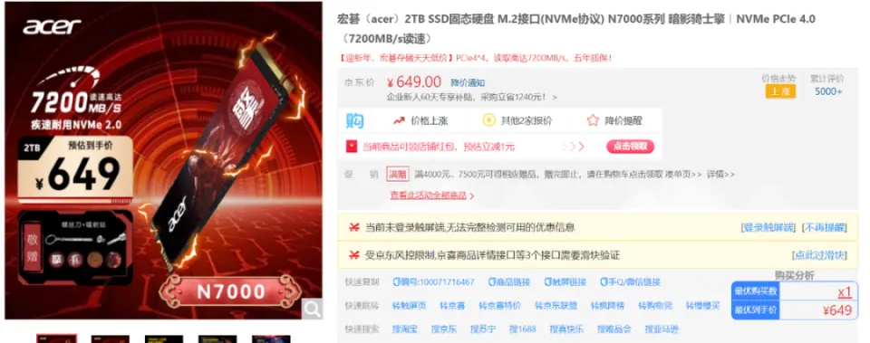 2T SSD现在代价最划算的是Acer的N7000,方案我们都很熟悉了,长江存储TLC颗粒加联芸1602主控,能跑满7000MB/s的读取速率。就4.0无缓盘来说,649的代价已经是近期少有的好价了,毕竟连光威这种厂商都涨到这个代价以上,那就真没啥买的意思了。这套方案发热不高,非常恰当给条记本扩展,但是做体系盘大概不太行,体系盘照旧买个大牌的有缓SSD吧。