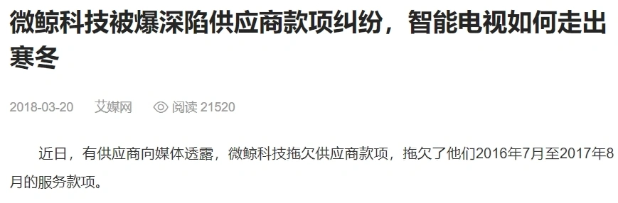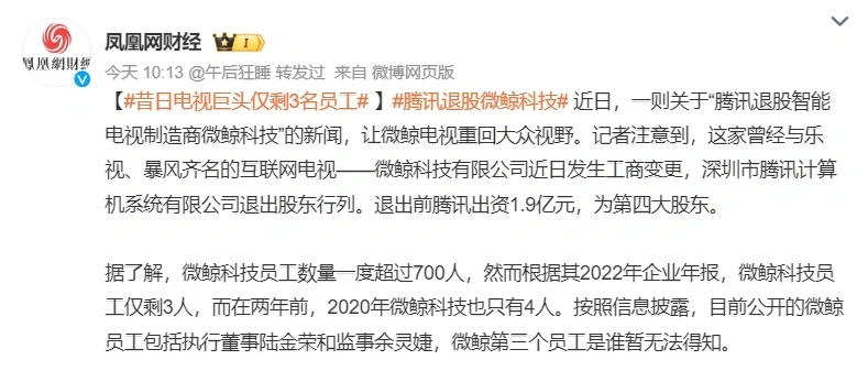 提及「看电视」这件事儿,小雷感触颇深。 在互联网还没遍及那会,每天我都定时蹲守电视机,就为了到点收看喜欢的节目。 如今期间早就变啦,互联网和移动装备的遍及,让随时随地「看电视」酿成实际。 So,估计很多小搭档都忘了,坐在客堂手握遥控器换台看电视是什么感觉了吧? 村里的大妈大爷们也不再端坐电视前,一个个躺在沙发、大床上对动手机乐呵呵笑不绝,刷抖音看影戏岂不乐哉。 短平快的短视频连续刺激多巴胺的分泌,各人天然也就丢失看电视的耐心。 那些从前火爆的电视巨头,随着电视的失宠,徐徐走向殒命。 一些曾经无比光辉的巨头,正面对被期间扬弃,淡出市场的了局。 比方这家曾经与狂风影音齐名,独占互联网电视半壁江山的「微鲸电视」,迩来就出了大事,半只脚踏在怎样桥上。 图源:微鲸科技 微鲸科技遭巨头退股喏,迩来有媒体报道,腾讯退股了电视制造商微鲸科技。 深圳市腾讯盘算机体系有限公司退出股东前出资1.9亿元,为微鲸科技第四大股东。 那么题目来了,好端端的,腾讯为啥要退股微鲸科技呢? 图源:微博@凤凰网财经 实在微鲸科技会有本日这个效果,小雷不太不测,由于公司早在几年就有征兆了。 据微鲸科技年度陈诉,从2021年到2022年起,公司的社保缴纳人数只剩下3个人。 换句话说,整个公司只剩下3个员工。 图源:企查查 而2020年是4个员工,2019年是6个员工,2018年是113个,人属于是越来越少喽。 图源:企查查 大伙别以为113人不少了,要知道在壮盛时期,微鲸科技员工但是凌驾700人的! 如今微鲸科技只剩3人,一个是实行董事陆金荣,一个是监事余灵婕,第三个小雷查不到。 图源:企查查 从前几年员工人数骤降到如今腾讯退股,微鲸科冀蛹谜会酿成如许也屡见不鲜了。 实在早在客岁,微鲸科技的持股公司就履历了好几轮变更,小雷给小搭档们捋一捋。 2023年1月,阿里巴巴(中国)网络技能有限公司退出,转让股份给新增股东上海微粒视科技有限责任公司。 同年11月,林芝腾讯科技有限公司把本身的股份,转让给深圳市腾讯盘算机体系有限公司。 背面就是我们知道的,深圳市腾讯盘算机体系有限公司退股,将股份转让给上海微粒视科技有限责任公司。 图源:企查查 在腾讯退出持股后,现在微鲸科技只剩下了三个股东。 分别是持股41%的上海微粒视科技有限责任公司,39%的华人文化有限责任公司以及20%的苏州工业园区紫猫信息咨询有限公司。 能被阿里和腾讯等巨头入股,员工也曾高达700+人,想必大伙都好奇微鲸科技怎么就落得本日这般田地? 图源:企查查 微鲸科技也曾风光一时小搭档们有所不知,实在微鲸科技也曾经是电视范畴的行业大佬,风光过好些年初。 微鲸科技建立于2015年,这不巧了吗?恰好撞上了智能和互联网电视发达发展的黄金时期。 而互联网什么最吸引人?最焦点的肯定是内容,于是首创人一合计便瞅准内容赛道发力。 首创人之一黎瑞刚是不少传媒文化公司的高管,手头上拥有分量不轻的内容资源。 像TVB很多港剧、《中国好声音》等综艺、《驯龙高手》等动画以及球赛等赛事,等等资源都可以接入微鲸为它所用。 图源:微鲸科技 再加上接纳互联网电视和内容补贴的模式,在公司建立初期那会儿,微鲸的小日子过得那叫一个滋润。 有一说一,彼时微鲸结果照旧相称不错的,在建立仅一年后就拿下了一笔高达20亿元的投资。 当时投资的股东个个名头还都不小,分别是华人文化、阿里巴巴、苏州工业园区紫猫信息咨询、林芝腾讯科技。 不光云云,当年微鲸曾经做到互联网电视市场第二,仅次于当时间气吞江山的乐视电视。 图源:乐视 微鲸科技走下坡路但是,小雷要说但是了嚯。 微鲸科技并没有像各人所想的那样,不绝做大做强下去,反而开始走下坡路了。 移动智能装备的快速遍及,让用户可以在更方便的手机平板上观看各种视频节目。 加上电视市场各家品牌的猛烈竞争,时间来到2017年,电视市场的行情很不客观。 原来微鲸是靠着低价卖硬件+内容补贴抢占市场,眼看市场不可,就把代价补贴取消了。 这边电视市场不乐观,2018年微鲸又想了一招业务重组,进军智能硬件范畴探求时机。 微鲸顺势推出智能投影系列产物,于是当时微鲸旗下拥有电视、投影、VR头盔、家居以及配件等等产物。 再加上微鲸本身的智能电视软件和自制节目,整合了一套以智能电视为主的家庭娱乐产物线。 只是貌似效果不大行,同年微鲸又被爆出和供应商有款子纠纷,拖欠了人家工资,不外微鲸也立即举行否认。 图源:艾媒网 以后好几年,微鲸科技开始徐徐淡出市场,小雷发现微鲸在很多电商平台的官方旗舰店也已经下架。 图源:淘宝 而关于微鲸科技的很多外交媒体账号,小雷留意到也根本处于停更多年的状态。 图源:微博@微鲸&@微鲸投影 至于微鲸官网更新则停顿在2018年,很多产物点进去已经没有「购买」按钮喽。 图源:微鲸科技官网 喏,另有一个「微鲸电视」公众号断断续续在更新,只是也快停更一年了。 不外这个公众号就不卖电视了,重要卖的是「超等影视VIP」的电视会员服务。 图源:公众号@微鲸电视 从行业第二、到大张旗鼓、到走下坡路,再到巨头退股,微鲸的遭遇让人唏嘘。 说来是企业蹊径选择的题目,如果当年微鲸选择别的方向,本日会不会不一样呢? 只是时间不能重来,微鲸科技将来能撑到什么时间?现在来说照旧一个未知数。 有没有小搭档们用过