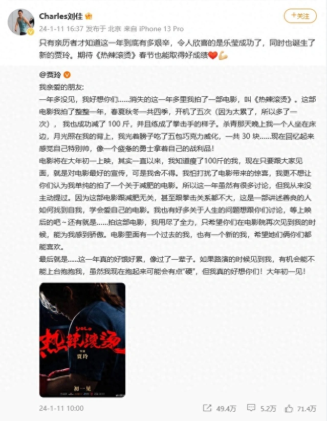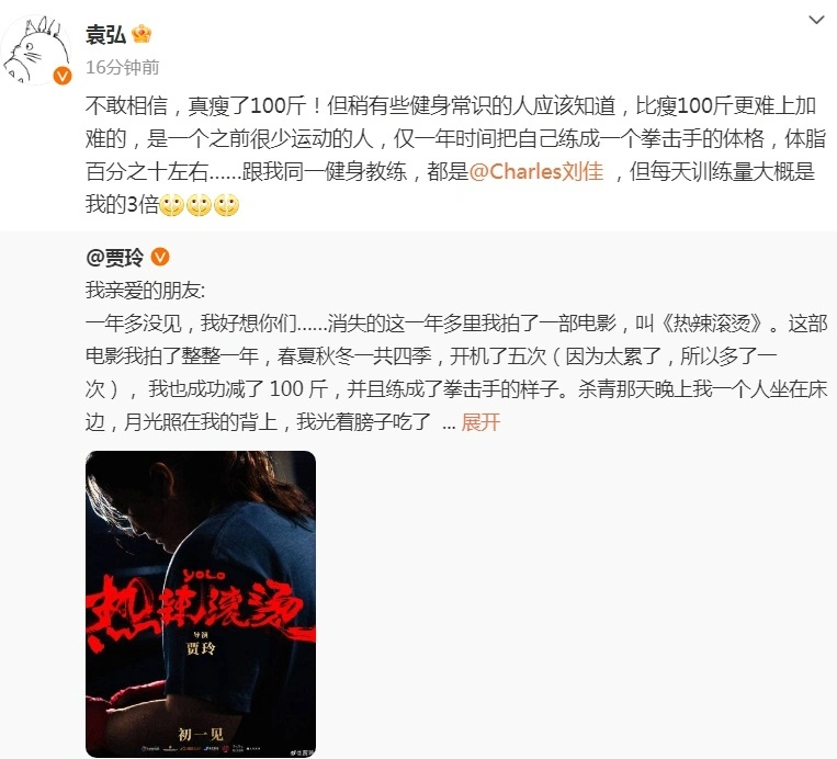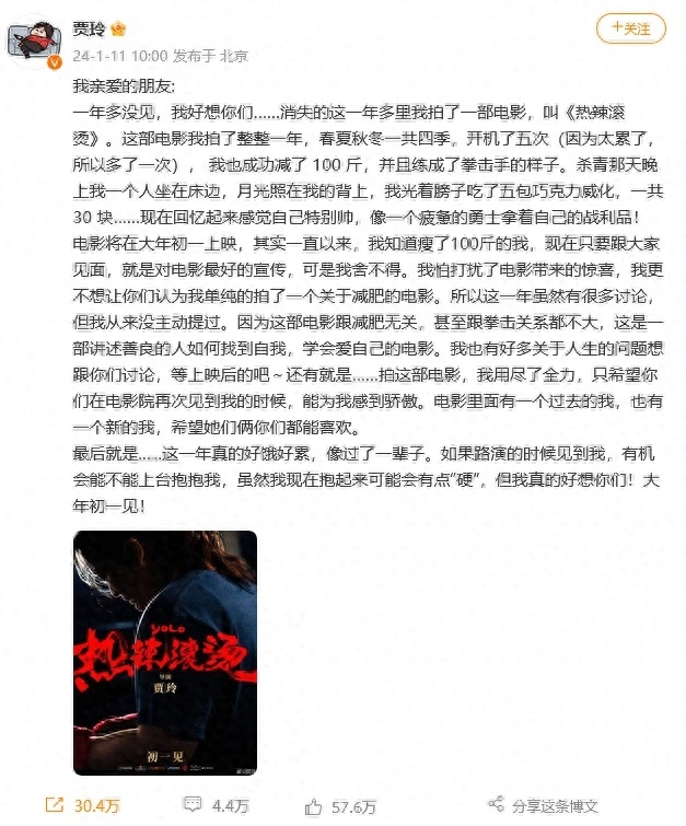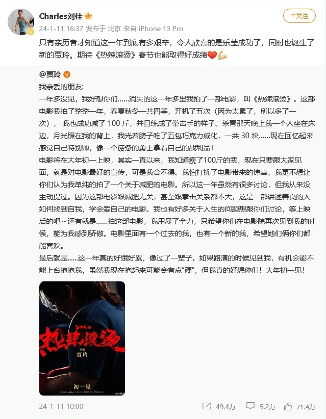1月11日,贾玲发长文公布新影戏《热辣滚烫》定档大年代朔,自曝为了新片减重100斤,获浩繁明星好友力挺夸赞。 贾玲发文后,好友袁弘发文称贾玲的体脂仅百分之十左右,批评区翻车被吐槽他没知识。 被吐槽后,袁弘数次编辑微博修改内容,现在已去掉关于体脂的内容。 11日下战书,贾玲健身锻练发声:“只有亲历者才知道这一年到底有多费力,令人欣喜的是乐莹乐成了,同时也诞生了新的贾玲。等候《热辣滚烫》春节也能取得好结果。” 此前报道>> 贾玲影戏《热辣滚烫》定档月朔,已减肥100斤,杨紫张小斐袁弘力挺:大概只有狠人才知道做个狠人要履历什么 1月11日,贾玲发长文公布新影戏《热辣滚烫》定档大年代朔,自曝为了新片减肥100斤,得到浩繁明星好友力挺。 贾玲称这部影戏她拍了整整一年,开机了五次乐成减了 100 斤,练成了拳击手的样子。 我酷爱的朋侪: 一年多没见,我好想你们……消散的这一年多里我拍了一部影戏,叫《热辣滚烫》。这部影戏我拍了整整一年,春夏秋冬一共四序,开机了五次(由于太累了,以是多了一次), 我也乐成减了 100 斤,而且练成了拳击手的样子。告竣那天晚上我一个人坐在床边,月光照在我的背上,我光着膀子吃了五包巧克力威化,一共 30 块……如今回想起来感觉本身特别帅,像一个疲惫的勇士拿着本身的战利品! 影戏将在大年代朔上映,实在不绝以来,我知道瘦了100斤的我,如今只要跟各人见面,就是对影戏最好的宣传,但是我舍不得。我怕打搅了影戏带来的惊喜,我更不想让你们以为我单纯的拍了一个关于减肥的影戏。以是这一年固然有许多讨论,但我从来没主动提过。由于这部影戏跟减肥无关,以致跟拳击关系都不大,这是一部报告善良的人怎样找到自我,学会爱本身的影戏。我也有许多多少关于人生的标题想跟你们讨论,等上映后的吧~另有就是……拍这部影戏,我用尽了努力,只渴望你们在影戏院再次见到我的时间,能为我感到自满。影戏内里有一个已往的我,也有一个新的我,渴望她们俩你们都能喜好。 末了就是......这一年真的好饿好累,像过了一辈子。假如路演的时间见到我,有机会能不能上台抱抱我,固然我如今抱起来大概会有点“硬”,但我真的好想你们!大年代朔见! 贾玲发文后,影戏《热辣滚烫》官博转发公布:“春夏秋冬,昼夜轮转,永世热辣滚烫。我们大年代朔见。” 据悉,继《你好,李焕英》后,这是贾玲作为导演出品的第二部影戏作品。 贾玲自曝减肥为了新片减肥100斤后,杨紫、周深、张小斐、雷佳音、马丽、袁弘、李雪琴等浩繁明星好友发文力挺。 杨紫:“是我见过最帅气的一次奔赴,大年代朔见。” 周深 :“玲姐很久不见!大年代朔得见见了!!” 张小斐:“是我那都忘了暖锅烧烤炸鸡麻辣烫是啥味儿的姐呀,大年代朔见.” 马丽:“玲儿贾玲辛劳了,抱抱 最酷的玲儿,大年代朔见。” 雷佳音:“是导演给全部人的一个拥抱,大年代朔见。” 袁弘:“不敢信托,真瘦了100斤!狠人啊!大概只有狠人本身才知道做个狠人要履历什么……等候这部影戏!” 李雪琴:“我心中的勇士,大年代朔见。” 【泉源:九派消息综合当事人账号、影戏官博】 |