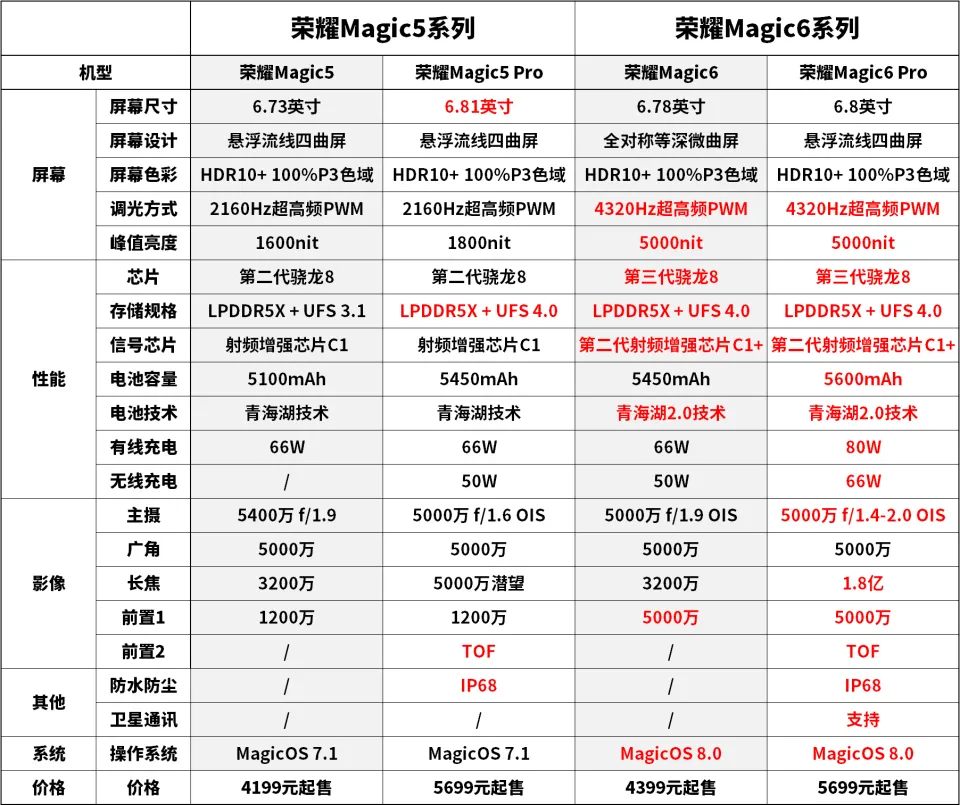 Magic6系列来了!临时还没拿到真机,但是作为Magic系列的死忠粉,每代都是必入,Magic6也不破例。这篇文章就来分析一下,这一代的Magic6系列有哪些创新?对比起上一代的Magic5系列,又有哪些升级? 先说我的结论:光彩Magic6系列这次的升级幅度照旧很大的,Pro版本的Buff叠满了,各种设置和新功能遥遥领先;让人没想到的是,这次尺度版的诚意也很足,乃至已经高出了上一代的Pro版本,性价比拉满。 表面&屏幕升级先来看光彩Magic6系列的表面操持,下图中左侧的两款是Magic5系列,右侧的两款是Magic6系列。光彩这次在大的方向上继承一连眷属式的操持,也就是缪斯之眼镜头模组,然后在此底子上又参加了方圆的理念。 就我个人的喜好来说,我会更喜好光彩Magic6系列的操持,比上一代显得更风雅,尤其是流云紫配色和素皮的搭配,有如淡紫晨光,很清新的感觉。 再来到正面,这次光彩Magic6的屏幕尺寸没什么厘革,但是内涵但是大厘革,相当炸裂! 这块屏是新一代的绿洲护眼屏,直接拉升到了4320Hz的超高频PWM调光,光彩真的是太卷了,很多多少机型还没遍及3840Hz的PWM调光,光彩都到达4320Hz了。别的它另有天然色彩表现、类天然光护眼、助眠表现等等,同时也通过了中标院Vico A+的认证,Magic6系列在护眼方面下足了功夫。不外光彩的对峙也是有结果的,如今只要提及护眼屏,脑筋里第一个蹦出来的品牌就是光彩。 Magic6的屏幕还可以实现全域低功耗LTPO,峰值亮度也飙升到了5000nit,应该是现在行业的最高亮度。 之前的光彩Magic5系列中,只有至臻版才有纳米微晶玻璃技能,尺度版和Pro表现很倾心,但是光彩这次照旧很大气的,光彩Magic6全系标配巨犀玻璃。这个巨犀玻璃就是基于第二代纳米微晶玻璃技能而来,全场景抗跌本领提升10倍,而且另有瑞士SGS多场景金标五星抗跌耐摔认证,实测抗跌结果和Mate60系列的昆仑玻璃持平。 总结一下光彩Magic6系列的表面和屏幕升级。对比起上代产物,外在方面只是微调,改动并不算大。但是内涵方面却是翻天覆地的厘革,峰值亮度一骑绝尘,护眼功能更进一步,另有耐摔抗造的巨犀玻璃加持,诚意满满。 影像升级接着来看光彩Magic6系列的影像升级,又是一个惊喜。先看这颗主摄镜头,尺度版是5000万像素,f/1.9的光圈,Pro版也是5000像素,升级到了可变光圈(f/1.4-f/2.0)。而且这代的主摄是标配光学防抖,这个福利在Magic5尺度版上可没享受到。 再来看长焦镜头,上一代的尺度版是3200万像素,Pro版是5000万像素的潜望镜头。这一代的尺度版仍然是3200万像素,但是Pro版直接提升到了1.8亿像素,另有1/1.5的超大底。 从体验上来说,Magic5 Pro的潜望长焦很好用,有更多倍数的光学变焦,拍远处的物领会更方便。但是Magic6 Pro的1.8亿+1/1.5场景镜头是别的一种体验,由于像素量充足大,通过裁切同样可以拍到更远处的物体,而且省去了变焦的步调,也办理了手抖的题目。 末了是广角镜头,这一代和上一代没什么厘革,仍然是5000万像素,就不赘述了。 前置镜头方面,Magic5系列是1200万像素,然后Pro版本多了一个TOF镜头。这一代全面升级到了5000万像素,Pro版本继承多出一个TOF镜头。 相机玩法方面,最大的厘革肯定是鹰眼相机的升级,在动态范围、感光本领、远视本领、启动速率、对焦速率等方面都有肯定的提升。由于还没拿到呆板,很歉仄这里就没办法放样张了,后续有机会再补上。 性能升级性能方面,Magic6系列全系标配骁龙8Gen3+LPDDR5X+UFS4.0黄金性能三件套,上一代的Magic5尺度版只有UFS3.1啊!倾心哭!关于这三件套的性能,想必各人早就门儿清了,我之前也发过几款8Gen3机型的评测,硬件很强,各家的调校也都很成熟,性能方面临时拉不开什么差距。 关于散热方面,Magic6尺度版重新操持了微纳VC结构,没有提VC的面积,但是说了散热服从提升150%。Magic6 Pro版的VC面积到达了5052m㎡,卢总说只会堆VC面积的厂商都是没技能的,但是卢总啊,堆VC面积真的有效啊!技能是你们厂商的事变,我们斲丧者只要现实的散热结果。 Magic6系列的设置单上另有两个更炸裂的功能:射频加强芯片HONOR C1+和鸿燕卫星通讯。在之前的光彩机型上,我体验过第一代的射频加强芯片C1了,好比在地库等网络欠好的场景下,别的手机看直播都是一卡一卡的音画差别步,但是光彩依附这枚C1芯片可以实现快速回网,比平凡手机的网络信号会更稳固一些。 Magic6系列搭载的C1+芯片再次升级了,根据光彩公布的数据,天线发射收益最大提升51%,天线吸收收益最大提升41%。 在履历过“遥遥领先”之后,各人对于卫星通讯应该都很认识了,光彩这次在Magic6 Pro版上搭载了鸿燕卫星电话技能,支持双向语音和点对点的短信。而且光彩这次还参加了一些创新操持进去,传统的卫星天线是圆极化操持,但是手机天线是线极化操持,为此光彩专门操持了首个自研的黄金卫星天线,既包管了小体积,性能上也更靠近卫星天线的结果。 我记得光彩的青海湖电池技能是在Magic5系列发布时提出来的,青海湖电池的能量密度要比平凡电池高出不少,Magic5至臻版只有7.4mm厚,但是却塞下了一颗5100mAh的电池,有点东西。这次的Magic6系列接纳的是第二代青海湖电池技能,新型的硅碳负极质料,电池的能量密度再次提升,别的另有能效加强芯片HONOR E1和都江堰电源管理体系,对于一样寻常充放电可以或许起到优化作用。 这一次的Magic6尺度版的电池容量(5450mAh)、有线充电(66W)、无线充电(50W)等数据全面持平光彩Magic5 