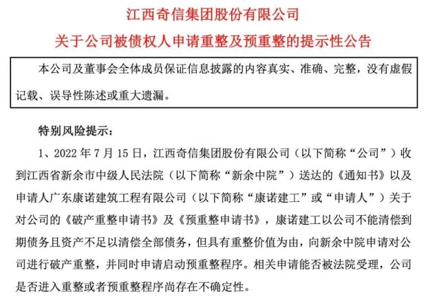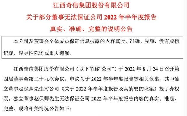 天天财经独家,速关注 又有独董质疑上市公司财政报表!这次是*ST奇信。 8月26日,*ST奇信发布半年报的同时,披露了公司独董赵保卿对半年报议案投了弃权票的变乱。赵保卿称:“无法包管公司2022年半年度陈诉内容真实、正确、完备”。 图片泉源:公司公告 独董对半年报议案投出弃权票 *ST奇信发布2022年半年报表现,公司上半年实现业务收入6.79亿元,同比增长14.43%;归属于上市公司股东的净利润为-2.02亿元,较上年同期的-7519.13万元,亏损幅度进一步扩大。上半年,公司谋划活动产生的现金流净额为7475.96万元,较上年同期的-2.86亿元,谋划活动现金流转正。 不外,对于公司上半年的财政状态以及半年度谋划结果与现金流量情况,公司独立董事赵保卿表现无法包管或持有贰言。 赵保卿以为,公司因涉嫌违法违规信息披露正被证监会备案观察,公司因原实际控制人关联人疑似于2021年1月1日非谋划性资金占用正被经侦备案侦查。此两项观察至今尚未有结论,而这两项结论直接影响到2022年半年度陈诉及其择要相干数据信息的客观真实、正确与完备性。 这不是赵保卿第一次质疑公司财报真实性。早在*ST奇信发布2021年度陈诉以及2022年度一季报时,赵保卿就因同样的缘故因由对相干议案投了弃权票。 图片泉源:公司公告 根据*ST奇信相干公告,公司颠末自查发现,2021年1月1日公司向深圳市达欣商业有限公司(简称“达欣公司”)转账了8000万元及5087.5万元两笔款子,合计1.31亿元。上述款子的转出,公司未与达欣公司签署商务条约,也未发生实质性的商务经济往来,且未颠末公司股东大会、董事会决议审批和内部具名审批流程,付款根据中仅有公司原实际控制人关联人,即时任公司董事长兼总裁的具名及财政管理中央资金结算部副司理的个人名章。 对此,*ST奇信敏捷创建了观察领导小组,并于本年1月23日向江西新余市公安局报案。3月,公司收到了新余市公安局出具的《备案告知书》,正式启动对相干涉及职员的备案观察工作,其紧张内容为:“‘1.23’职务陵犯案一案,经查,我局以为该案有犯罪究竟,属于我局管辖,现已于2022年3月15日备案侦查。” 根据*ST奇信最新公告,现在,公司大额资金流失事项和公司涉嫌信息披露违法违规事项均还在观察中。 贷款逾期 银行账户被冻结 公开资料表现,*ST奇信公司创建于1995年,主业为修建装饰计划与施工,公司业务范围涉及公共修建如写字楼、商业综合体、文教体卫办法及精装住宅等范畴,涵盖项目建立总承包、室内装饰创意计划与施工、修建幕墙施工、物联网综合办理方案、康健情况综合办理方案等方面。现在,公司控股股东为新余市唯逐一产业局投融资平台新余投控。 自2020年来,公司业绩连续亏损。相干财报表现,公司2020年、2021年分别亏损5.1亿元、17.48亿元。除了业绩不佳外,*ST奇信尚有其他贫苦缠身——银行账户被冻结、银行贷款逾期、多位董监高辞职…… 制止8月18日,*ST奇信以及子公司共有39个银行账户被冻结,冻结金额为1.28亿元。对于冻结的缘故因由,*ST奇信曾在公告中表明称,受修建装饰行业团体不景气影响,公司近两年应收账款回款较慢,导致部分供应商货款付出进度较慢,从而引起部分诉讼并冻结。该状态近两年来长期客观存在,对公司生产谋划造成肯定影响,但属于行业广泛征象。 *ST奇信还发生了贷款逾期的情况。半年报表现,公司控股股东新余投控为公司代偿了深圳农商行、中国银行、农业银行、浦发银行和中原银行的逾期贷款、利钱、罚息、复利及相干费用等合计3.19亿元。根据相干协议,新余投控有权向*ST奇信追偿。 别的,包罗财政总监、实行总裁、高级副总裁等在内的多位公司董监高也在上半年选择辞职,不再担当*ST奇信托何职务。 图片泉源:公司公告 一纸公告股价翻倍 固然*ST奇信业绩堪忧、贫苦缠身,但公司股价却因一纸公告在短短不到一个月翻倍。 *ST奇信7月15日晚间公告,公司收到江西省新余市中级人民法院送达的《关照书》以及申请人广东康诺修建工程有限公司(以下简称“康诺建工”)关于对公司的《休业重整申请书》及《预重整申请书》,康诺建工以公司不能清偿到期债务且资产不敷以清偿全部债务,但具有重整代价为由,向新余中院申请对公司举行休业重整,并同时申请启动预重整步伐。 图片泉源:公司公告 就是这一纸预重整公告,让*ST奇信受到投资者热捧。公司股价自公告后首个开盘日起连续斩获14个涨停,自7月15日的低点4.49元/股到8月5日高点9.4元/股,股价涨幅高达109.35%。 图片泉源:同花顺 不外,对于此次预重整,*ST奇信表现,假如公司顺遂实行重整并实行完毕重整操持,将有利于优化公司资产负债布局,改善连续谋划本事;但若重整失败,公司将存在被宣告休业的风险。而假如公司被宣告休业,根据相干规定,公司股票将面对被制止上市的风险。 编辑:张楠 亚文辉 |