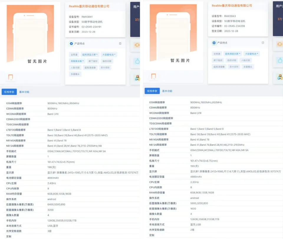 根据此前 @realme真我手机 官宣的信息体现,将搭载旗舰级潜望长焦的千元档新机真我12 Pro系列将在CES2024上首发,日前,该系列新机也准期亮相,从流出的该系列新机在此次展会上的照片来看,其外貌和影像方面确实充足吸睛。而据爆料,该系列机型在本月还将在国内和印度发售,实在这也屡见不鲜,继此前网间曝光了疑似该系列新机已经在工信部入网,并公布了证件照和详细参数之后,日前,该系列机型获国家质量3C认证的截图也已经曝光了出来,看来该系列机型年前在国内发售,已经是大概率变乱了。 根据官方外洋预热海报上体现的真我12 Pro系列的外貌和信息来看,其外貌计划上最大的亮点是其由劳力士计划大家来操刀打造的,带来了顶级奢华的腕表工艺。团体一连了眷属式的计划语言,仍旧将后置居中圆形相机模组,质感在同档位中非常出色。而且相机模组中心另有120X的字样,意味着该机型将支持最高120X变焦。 从CES2024上展出的样机来看,全新的真我12 Pro系列有白色和深蓝格局,均是素皮材质,后置摄像头Deco是圆环造型,位于机身反面上部居中的地区,同时摄像头出现矩阵分列结构,闪光灯则是纵向排布,而且摄像头Deco外另有一条中轴线贯穿机身反面,中轴线与闪光灯处于同一条垂直面上。同时,后摄模块的外圈与中轴线还参加了纹理刻度计划。机身正面是顶部居中曲面屏,由于没有直角中框,有不错的握持感。 根据此前官宣的信息体现,真我12 Pro系列最大的亮点是在千元档机型中参加了旗舰级潜望式长焦镜头——OV64b潜望式长焦。而根据官方晒出的展示海报体现,真我12 Pro+前置3200万像素摄像头,后置5000万旗舰主摄(索尼IMX890、OIS光学防抖)+800万超广角(索尼IMX355)+6400万潜望式长焦三摄组合,最高支持3X光学变焦和120倍数码变焦。 由此看,该机的后置主摄为真我GT5同款,潜望式长焦则为包罗一加12、OPPO Find X7,iQOO12和vivo X100等如今多款主流旗舰机型的同款。别的,日前,数码博主 @数码闲聊站 也曝出了疑似realme12 Pro+的部门信息设置和真机照,其透露,“realme 12 Pro+ Snapdragon 7s Gen2+IMX890+imx355+OV64B 3X”。 在性能方面,该机将搭载高通骁龙7s Gen2处置惩罚器,该芯片由红米Note13 Pro环球首发,安兔兔最新均匀跑分为59.3万+,略低于搭载骁龙778+处置惩罚器的vivo S17(63.3万+)。这个性能也带来了一好一坏两个消息,好消息是这个性能的机型代价应该仍在千元档,坏消息是,大概玩不了更吃性能的手游。 屏幕方面,该机采取了分辨率为2412*1080的6.7英寸居中单打孔OLED双曲屏,支持屏下指纹辨认和120Hz高刷,护眼方面的体现也算不错。续航机身内置5000mAh电池,这根本快成如今新机的标配了,不外联合该机配备的处置惩罚器和屏幕,理论上整机续航体现应该还是可以的。机身厚8.75mm和重196g,还算浮滑,联合双曲面屏,手感应该相当不错。 其他方面,该机内置立体双扬和X轴线性马达,支持杜比全景声和多功能NFC,出厂搭载基于Android14的realme UI5.0。机身由塑料中框和素皮后壳构成。除此之外,真我12 Pro也将采取类似的外貌计划,采取2X竖立式长焦,支持67W有线充电。 别的,日前,网间还曝出了疑似真我12 Pro系列机型获国家质量3C认证的截图,根据截图上体现的认证信息来看,真我12 Pro的产物型号或为RMX3866,其将配备型号为VCB7CACH和VCB70ACH的充电适配器,并有望支持最高功率可达67W的有线快充。不外这个型号貌似与此前已经入网工信部的realme新机的型号并差别等。 根据工信部网站公布的信息体现,这两款realme新机的型号分别为RMX3841、RMX3843,从外貌上看,这两款机型的反面计划酷似真我GT5 Pro,一款采取橙色配色,一款采取白色配色,视觉上,两款机型反面目似都采取的是素皮材质。两机反面显着的差别则来自后摄模块,橙色款的后摄中有一颗矩形镜头,白色款则都是平凡圆形镜头,理论上这颗矩形镜头应该是潜望式长焦镜头。 根据公布的参数体现,型号为RMX3841的realme新机(疑似真我12 Pro+)搭载八核5G处置惩罚器(主频为2.4GHz),有6GB至16GB运存和128GB到1TB闪存组合可选;三围分别为161.47×74.02×8.7mm,重196g,采取分辨率为2412×1080p的6.7英寸曲屏,支持10.7亿色;影像方面,该机后置5000万像素主摄像头+800万像素超广角+6400万像素OV64B潜望长焦的三摄组合,支持3倍光变,前置3200万像素自拍镜头;内置5000mAh电池等。 型号为RMX3843的realme新机(疑似真我12 Pro)搭载八核5G处置惩罚器(主频为2.2GHz),有6GB至16GB运存和128GB到1TB闪存组合可选;三围分别为161.47×74.02×8.75mm,重190g,采取分辨率为2412×1080p的6.7英寸曲屏,支持10.7亿色,在屏幕方面,两款机型是一样的;影像方面,后置5000万像素主摄像头+800万像素镜头+3200万像素IMX709长焦三摄组合,前置1600万像素自拍镜头,支持2倍光变,前置1600万像素自拍镜头;内置4880mAh电池等。 |