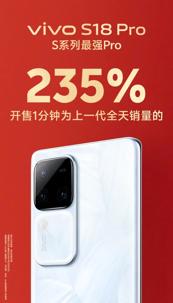 vivo官方消息确认,“vivo S18 Pro首销大捷!开售一分钟为上代首销日全天销量的235%!Pro级气力,作育Pro级战绩!”