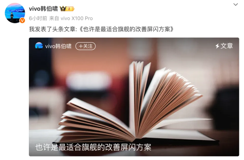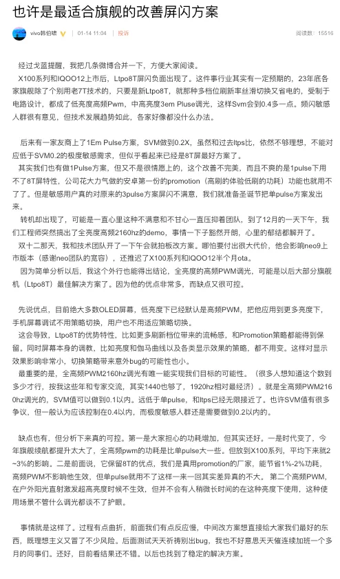 本日,vivo通讯科技有限公司产物司理韩伯啸发布了长文《大概是最适当旗舰的改善屏闪方案》。