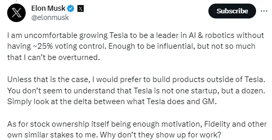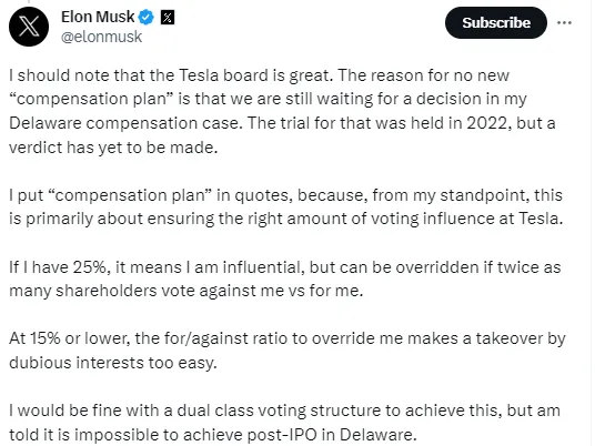 迩来,X上掀起了对马斯克股权鼓励操持的讨论,几位特斯拉粉丝在X上敦促为马斯克订定新的薪酬方案,称自2022年底来这位CEO不绝在为公司“免费”工作,但也有粉丝以为不必要额外的薪酬操持。 马斯克本人则对当前持有的股份相称不满,并渴望得到特斯拉的更大控制权。本地时间周一,马斯克发贴回应称,如果没有25%的投票控制权,他甘心在特斯拉之外开发人工智能产物,他指出特斯拉现实上是十几家初创公司的聚集。 他质疑道: 如果持有股票本身就充足鼓励,富达和其他与我持雷同股份的人,他们为什么不来上班? 马斯克是特斯拉最大的股东之一,拥有超12%的特斯拉股份,他在另一篇帖子中还表达了“被倾轧”的担心: 如果我有25%投票控制权,这意味着我很有影响力,但如果投反对票的股东比投同意票的股东多一倍我就会被倾轧,15%或更低的同意票/反对票比例就可以颠覆我,这令公司很容易被可疑长处团体收购。 我盼望接纳双层布局来实现这一目标,但听说在特拉华州上市后不大概实现。 值得一提的是,马斯克自2019年以来没有从特斯拉拿过现金工资。他持有特斯拉的股票和期权,根据2018年的一项薪酬方案,如果公司到达特定的财务目标,他将分批解锁期权嘉奖,以较低的代价购买更多股票,然后卖出,从而得到巨额收入。 特斯拉在2023年初证明,马斯克已经收到了2018年薪酬方案授予他的末了一批剩余期权。这意味着这位CEO现在没有任何薪酬方案。 对于这一标题,马斯克表明称,之以是没有出台新的薪酬操持,是由于公司仍在等候特拉华州补偿案的诉讼讯断。 马斯克正积极应对股东对一系列标题的不满,从特斯拉的继任操持到责怪他分心于X的工作。特斯拉还受到了一系列负面消息的打击,租车巨头赫兹将出售三分之一电动汽车转买油车、中国地区再次贬价,以及劳动力本钱上升的迹象。 在2023年股价翻了一番多之后,特斯拉股价本年下跌约12%,抹去了高出940亿美元的市值。 |