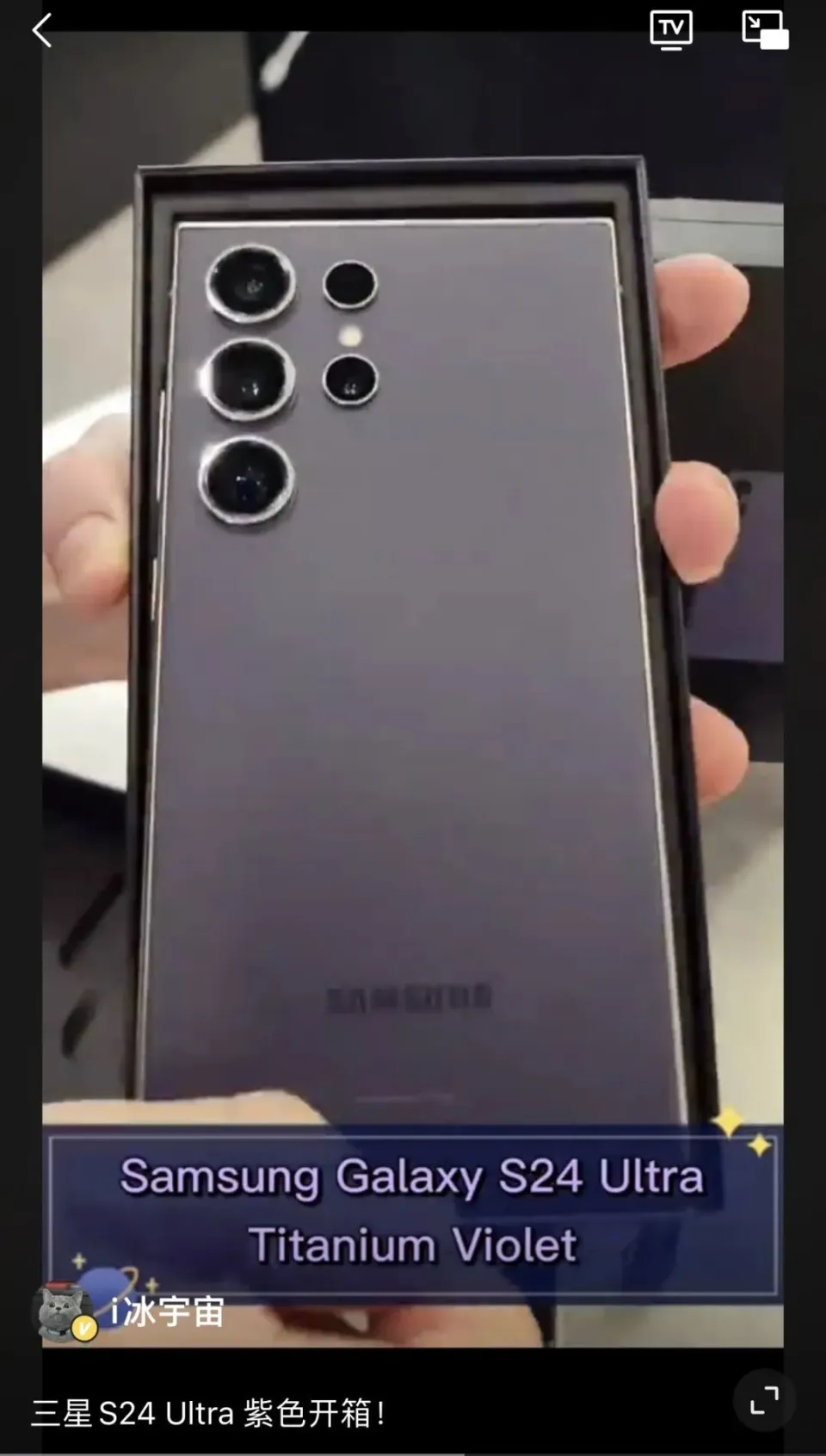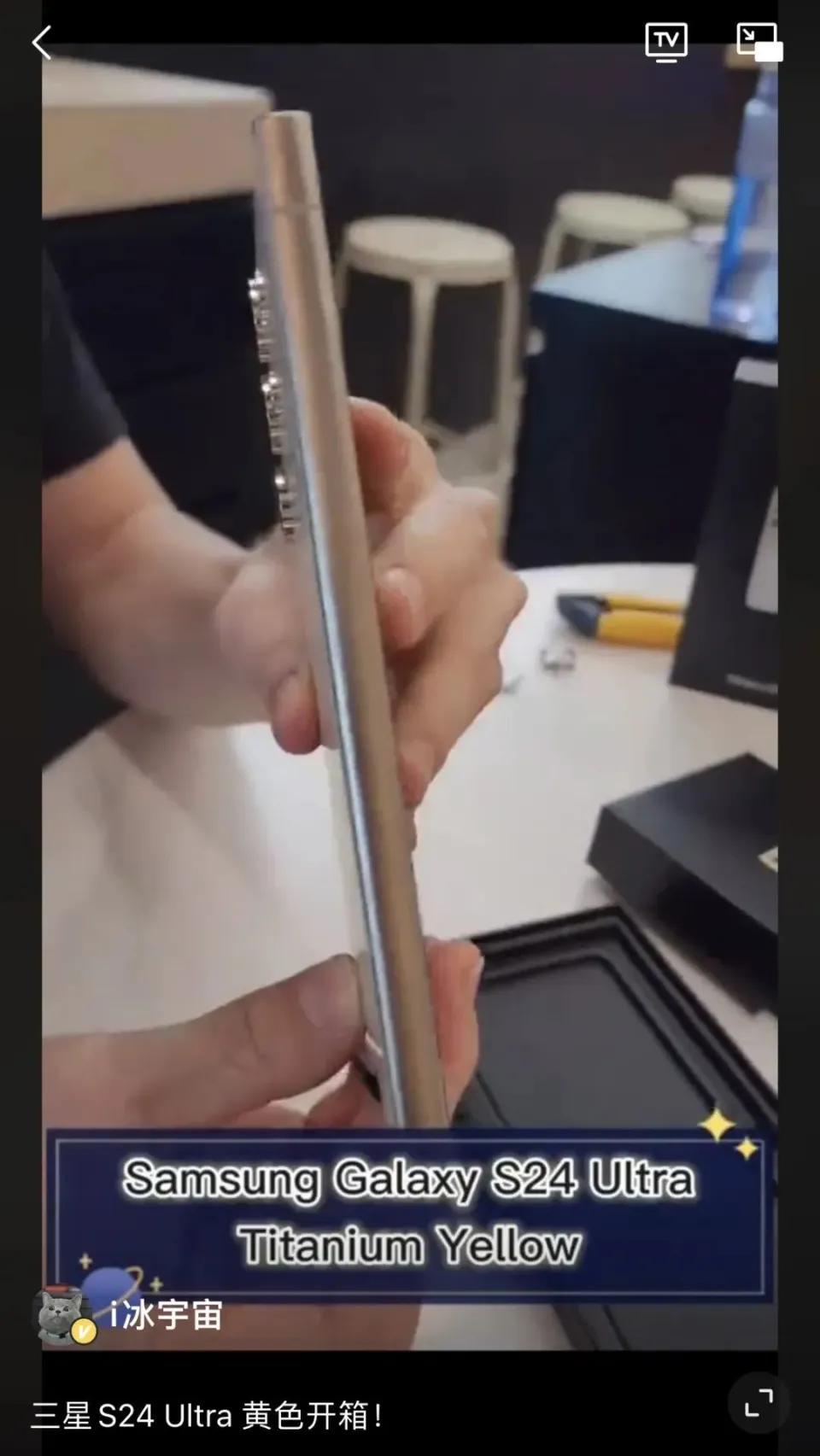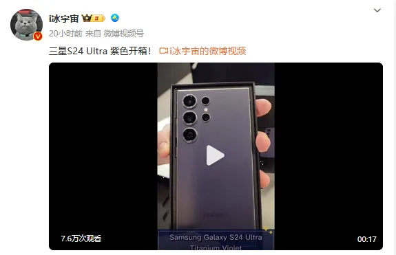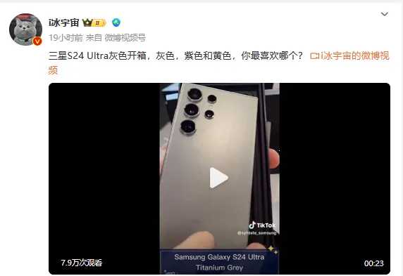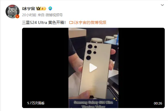 克日,博主@i冰宇宙 分享了三星Galaxy S24 Ultra紫色、黄色和灰色三种配色版本的开箱视频。