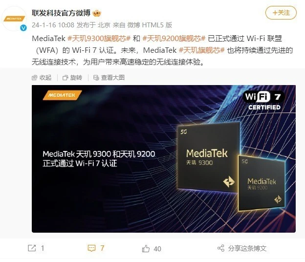 1月16日上午,联发科技官方公布天玑9300旗舰芯和天玑9200旗舰芯如今已经正式通过了Wi-Fi同盟(WFA)的 Wi-Fi 7认证。将来,天玑旗舰芯也将连续通过先辈的无线毗连技能,为用户带来高速稳固的无线毗连体验。 如今,AI正在连续改善人们的生存,一部门简单功能可以在端侧实现,而更多复杂功能照旧须要端云协同乃至全面上云,此时快速而稳固的网络毗连就非常紧张,支持Wi-Fi 7毗连的装备将确保家庭、工作等网络环境下的优质用户体验,而配备天玑9300旗舰芯的手机产物是最容易打仗到的。 天玑 9300旗舰芯片支持Wi-Fi 7,最高理论峰值速率可达6.5Gbps,同时搭载MediaTek特有的Wi-Fi 7加强技能,借助MediaTek Xtra Range 2.0 技能,Wi-Fi 7的室内覆盖可增长4.5米,并大幅提升装备间的数据传输速率,无惧干扰。 联发科作为举世率先投入研发Wi-Fi7无线毗连技能的企业之一,最早于2023年初时就在CES2023上展示其构建的完备 Wi-Fi 7 举世生态体系,以接待下一代无线终端装备的规模量产。近期,联发科也与Wi-Fi同盟互助推动新尺度认证,于CES 2024上展示了首批得到完备Wi-Fi 7认证的产物,引领行业技能创新和遍及。不少搭载天玑9300的旗舰智能手机也支持Wi-Fi 7新尺度,好比新近发布的OPPO Find X7。 Wi-Fi同盟总裁兼首席实行官KevinRobinson曾表现:“已往二十年来,MediaTek积极与Wi-Fi同盟互助举行其产物认证工作,并乐成将互通性强、性能可靠的芯片组办理方案推向市场。我们很荣幸MediaTek参加我们的Wi-Fi7认证互操纵性测试平台,此举将促进更多高品格Wi-Fi7装备上市,以确保家庭和办公网络环境中的优质用户体验。” 假如您也想提前体验Wi-Fi7技能带来的杰出体验,可以选购如今已经上市,且搭载天玑旗舰芯片的手机产物,如搭载天玑旗舰芯片的vivo X系列和搭载天玑9300的iQOO Neo9 Pro等机型都将连续上线Wi-Fi 7功能。 在联发科等行业先行者的推动下,信赖将来更多高端旗舰产物也将支持Wi-Fi 7新尺度,Wi-Fi业界创新也将迎来新的高度。 |