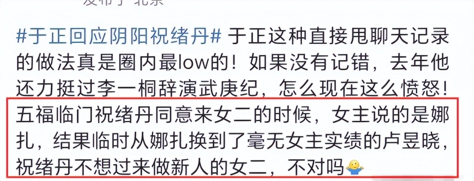 原来于正才是娱乐圈最颠的颠公啊,直接放谈天记载,要不要这么尴尬? 嘉行副总赵若尧在微信里安抚于正,于正的态度照旧咄咄逼人。乍一看,还真以为是祝绪丹服务太离谱。 可不少业内人士出来爆料,于正筹拍新剧《五福临门》时,声称女主是娜扎、虞书欣等大牌,祝绪丹才乐意当女三。如今女主换成新人卢昱晓,祝绪丹不肯给新人抬轿,因此才跑路。 毕竟,祝绪丹也演过不少女主剧,尤其新版《倚天屠龙记》里的周芷若,被广大网友承认。 反倒是于端正接晒出谈天记载的举动,被业内人士不齿。被各人戏称为“戏精”的于正,又一次陷入舆论风波。 在整个娱乐圈,像于正如许频仍上热搜的导演很有数,明显是幕后,却整天评价各位明星;手握多款爆剧,口碑却很差;因抄袭被联名反抗,还能站在舆论中心。 爱蹭热度、手撕明星,于正拿捏了娱乐圈流量暗码。毕竟上,跟于正以往掀起的风浪比起来,内涵祝绪丹就像往水里投了个石子,不算大事。 当年林心如依附《尤物心计》翻红,于正恰好是这部剧的编剧。看到这种题材受接待,林心如干脆建立个人工作室,找来原班人马拍摄《倾世皇妃》,编剧换人,两人因此心生嫌隙。 《笑傲江湖》拍摄前,于正原来找的是林心如,效果被拒绝。琼瑶斥责于正抄袭,林心如力挺琼瑶,跟于正恩怨升级。 对此,于正也不甘示弱,公开在节目中责怪林心如不知恩义,但之后又向林心如致歉,赚足了热度。 佟丽娅和于正互助过《宫锁心玉》,比及《宫锁珠帘》开拍时,杨幂、冯绍峰都来客串,佟丽娅却没出现,于正立刻炮轰佟丽娅“放鸽子”。可佟丽娅却体现,本身从未被约请演女主,斥责于正撒谎。 袁姗姗被于正一手捧红,也因他备受质疑,一度被网友怒斥“滚出娱乐圈”。合约到期后,于正跟袁姗姗的关系敏捷恶化,于正多次内涵她不知感恩。 赵露思没跟于正没互助,于正以为本身被删了,发了一张“绿茶”图片。 就连三金影后周迅,也逃不开于正的毒舌,被骂一句“台词就如许”。 除了内涵各位女明星,于正内涵的男明星也不少。 2023年大火的邓为曾被传出“耍大牌”,于正立即炮轰他是“腌臜东西”。两人抵牾的因由是邓为曾去于正那边试戏,态度不积极。 大多数明星对于正的内涵视而不见,但也有人性情急躁,比如沈泰。两人在咖啡厅大打脱手,恰好被狗仔拍到,事后沈泰大方承认,还直言“他以后再胡来,照旧抽他”。 于正本身备受争议,他旗下的明星也受连累。 于正说本身公司只有学霸没有文盲,效果网友扒出白鹿中专毕业,许凯是高中学历,宋威龙也是中专学历。 明显这三位从未营销过本身是学霸,却由于老板于正的一句话,莫名其妙被网友讽刺一番。 在整个娱乐圈,大众很难找出像于正如许的“内娱活人”,不管是互助过照旧没互助过,都被他批评一句,带上热搜。 于正如许频仍引导舆论,在肯定水平上是为本身的新剧造势,为本身的艺人博眼球,可这种举动也会引来无数网友的恶感。为了热度扬弃口碑,真的值得吗? |