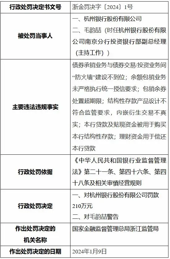 克日,国家金融监督管理总局浙江羁系局开出的2024年“1号罚单”,剑指杭州银行股份有限公司(下称“杭州银行”,SH:600926)。罚单表现,杭州银行因存在6项违法违规举动,被罚款210万元。 具体来看,杭州银行涉及的违法违规题目包罗:贷款及贴现资金被用于购买本行结构性存款;理财资金用于归还本行贷款;结构性存款产物筹划不符合羁系要求,内嵌衍生买卖业务不真实;债券承销业务与债券买卖业务/投资业务间防火墙创建不到位;余额包销业务未严酷实验同一授信要求;包销余券处置惩罚超限期。 因此,国家金融监督管理总局浙江羁系局对杭州银行处以罚款210万元的处罚。同时,时任该行南京分行投资银行部副总司理(主持工作)的毛韵喆被处以告诫的处罚,处罚时间为2024年1月9日。 据期间周报,2024年初至今,商业银行收到罚单29张,政策性银举动2张。此中,大型国有商业银行8张,村镇银行8张,城商行5张,股份制银行4张,农商行4张。对比来看,杭州银行此次罚单为2024年初至的最大罚单。 值得一提的是,毛韵喆被是杭州银行南京分行的紧张脚色。根据公开信息,2018年杭州银行南京分行的一篇文章中提及,毛韵喆在总行资产管理部互换学习中表现优秀,被保举到中国银行间市场买卖业务商协会学习深造。 另在2023年8月,采招网发布“南京浦口经济开辟有限公司2023年度第二期银行间协会债券承销商项目中标候选人公示”,此中中标候选人第五名的杭州银行南京分行的负责人也是毛韵喆。 据贝多财经相识,就在被处罚前,杭州银行还披露了2023年度业绩快报。根据该行披露的业绩快报表现,,杭州银行2023年实现业务收入350.16亿元,同比增长6.33%;实现归母净利润143.83亿元,同比增长23.15%。 制止2023年末,杭州银行的总资产为18413.42亿元,同比增长13.91%,此中贷款总额8070.96亿元,同比增长14.94%;总负债为17300.43亿元,同比增长13.97%,此中存款总额10452.77亿元,同比增长12.63%。 制止2023年末,杭州银行的不良贷款率为0.76%,较2022年末降落0.01个百分点;拨备覆盖率为561.42%,较2022年末降落3.68个百分点;拨贷比为4.25%,较2022年末降落0.11个百分点。 特别阐明的是,杭州银行在2023年内并未受到公开处罚。相比之下,该行旗下消耗金融公司、理财子公司则均曾被罚。此中,杭银理财因理财产品信息披露及贩卖管理不规范、信息登记及数据报送禁绝确,被罚款45万元。 而杭州银行持股42.95%的杭银消耗金融则因“委外催收管理不到位”和“贷款利率风险订价机制落实不到位”,被国家金融监督管理总局浙江羁系局处以罚款55万元,处罚时间为2023年10月31日。 前不久,杭州银行董事长宋剑斌在该行2024年度工作集会中表现,2024年是杭州银行发展历程中令人难忘的一年,将会是转型突围的一年,将会是“二二五五”战略承上启下的一年。越是关键时期,越要理性苏醒,越要刚强信心、鼓足干劲。 同时,宋剑斌在会上夸大,要进一步提振勇立潮头、敢为人先的精气神,加强勇毅前行、舍我其谁的定力风格气魄,以实干继续开创全行高质量发展新局面,为打造“优等生、好银行”增光添彩。 别的,杭州银行行长虞利明则在发言时称,2024年全行上下应把握七个方面的工作重点。此中,提到“打造一流风控,强化内控合规,推选行稳致远”。但贝多财经发现,杭州银行在2024年初便收到了一张金额不小的罚单。 从某种水平上来说,这个“flag”被“打脸”了。 |