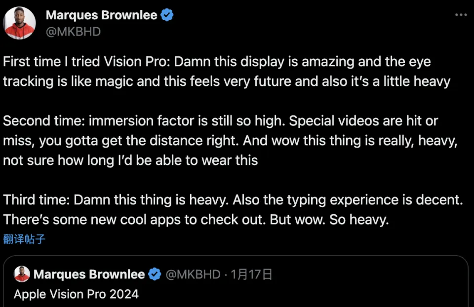 智东西(公众号:zhidxcom) 作者 | 徐珊 编辑 | 云鹏 千呼万唤,2024年科技圈最等候重磅产物Vision Pro终于要开启预定,即将与消耗者晤面! 智东西1月19日报道,北京时间本日晚上9点(美国平静洋时间早上5点),苹果将开启Vision Pro预售,售价为3499美元,折合人民币约2.5万元。此次预售仅针对美国市场开放。 但用户要是想拿到首台Vision Pro,至少要比及小半个月后,苹果官方表现2月2日Vision Pro开始正式发货,可以选择线下自助提货和邮寄两种方式。 苹果分析师郭明祺透露,苹果首批Vision Pro备货在6-8万台左右,约莫2-3周后,Vision Pro备货量将实现翻倍增长。 由于Vision Pro的首批发货量少,因此在第三方市场,Vision Pro的代价一起高涨,最高每台靠近人民币9万元,是原价的4倍。就连京东也有店肆挂出了50000元的Vision Pro标价。 别的,为了打好空间盘算期间的第一战,苹果自身也做了不少预备。近期苹果构造了小部门科技博主来到纽约,争先体验最新的Vision Pro。这一次,Vision Pro内不但上新了150款3D内容资源,还初次开放了全新的App Store。 可以看出,苹果无疑非常想要说好一个“空间盘算期间的新故事”给各人听。但痛惜的是,在诸多科技博主体验苹果Vision Pro之后,他们多数仍以为“不敷好”。 时隔半年,已经靠近“定版”的Vision Pro实际体验毕竟怎样?与客岁6月相比,苹果如今又优化了哪些新功能?身为国内用户的我们怎样才气买到属于本身的Vision Pro?在这里,我们将看到有关Vision Pro的最新盼望。 一、 想要抢购一台3500美元的Vision Pro?难度系数不小想要买一台Vision Pro并非一件易事。(小编本身也在苦蹲。) 如今在美国,Vision Pro预售分为线上、线下两种方式。此中,假如你想要在线上订购,在预售前,你须要完成一系列的信息填写工作。 起首,你须要确保本身的Apple ID为美国地域,已在苹果官网设置好收货地点和接洽方式,并已绑定可用的付出方式(美国本地的银行卡),且下载Apple Store App。其次,你须要预备一部支持人脸解锁的iPhone或iPad,以支持苹果的面部扫描功能。留意,由于苹果须要调用FaceID扫描面部来匹配最符合的面罩,因此Vision Pro预购只能通过Apple Store App举行。末了,在北京时间1月19日晚上21点,当你填好了全部信息后,假如能看到取货时间为2月2日,那么恭喜你,抢到了首批Vision Pro。 而在线下购买用户,则可以选择直接去各大直营店线下列队购买Vision Pro。和线上的网络大战相比,线下的直营店列队则须要早早到达现场。 假如你想要在中国早早买到一台Vision Pro,除了找朋侪代购以外,你还可以看看京东、天猫、淘宝、闲鱼等三方电商平台抢购。此中,京东已经上线了Vision Pro的外洋直营链接,只不外,Vision Pro的溢价从1万到5万不等。 二、外媒体验大曝光:“险些没有满分体验”在近来一波的外媒体验评测中,苹果仍为体验对象提供了一对一专职服务。不外,此次苹果还为每位体验者专门拍摄了体验照片,凸显出Vision Pro在差别人群中佩戴的观感。 此次,外媒对Vision Pro的体验紧张会集在六大方面:根本硬件设置、眼手交互、空间视频、Eyeslight功能、办公场景下的应用、以及娱乐场景下的相干应用体验等。 1、重、重、重!Vision Pro重量成为最大题目 在全部的体验者中,科技博主@MKBHD对Vision Pro重量的吐槽最为显着,险些每次体验到某个功能后,他都夸大了一声“太重了”。 他在本身的交际软件X上写道:“当我第一次实行Vision Pro:表现屏太棒了,眼动追踪就像邪术一样,感觉非常未来,但有点重。第二次:沉醉感仍旧很高。空间视频体验时好时坏,你必须把握准确的间隔。这东西真的很重,不知道我能穿多久。第三次:这东西太重了。打字体验也不错。有一些新的很酷的应用步调可供检察。但是,好重。” 可以看出,产物的重量险些影响了他全部的产物体验。彭博社的马克·古尔曼(Mark Gurman)也曾推测重量将被证实是“Vision Pro的最大题目”。 不算电池组,Vision Pro的重量约莫在450g左右,和一瓶矿泉水差不多重。 苹果在初次体验反馈后,显然发现了人们的重量感知度要更加敏锐,做出了一些新的调解。如将单绑带筹划转换成双绑带筹划,以调解头显在头部的配重分配。 随之新题目出现,据科技博主@Cherlynn Low的说法,只管头带筹划变得更宽且柔软,用户想要通过双绑带佩戴Vision Pro头显,时间一长,仍旧会感受到“头疼”。 同时,与苹果Vision Pro相毗连的电池配件也让不少体验者感到使用不方便,且颇重。“你得给电池找到一个好的放置位置。”一位体验者说道。 可以看出,像是苹果Vision Pro头显类产物,用户对重量的感知非常显着,如今连苹果也仍旧未能将重量降至一个令用户满足的范围内。 2、“蠢萌”的EyeSight功能,并不被用户买单 曾经在发布会上惊艳众人的EyeSight功能,在此次体验会上,也被不少人提及。 EyeSight功能运行时,只要眼动追踪摄像头辨认到佩戴者眨眼,头显的双面屏会在外部表现双眼形象,而当佩戴者的眼睛完全沉醉在假造天下中时,头显的外部表现就会消散。 只管这些功能如发布会展示的一样,但The Verge的维多利亚·宋(Victoria Song)称EyeSight功能“有点愚笨”。有关EyeSight功能,人们对其的质疑紧张聚焦在两个方面:一是与外界的接洽并不细密,仍存在孤立感。二是,其内容交互比力单薄。 对于前者,宋提到使用装备的用户一方面无法真正看到本身的外貌形象是什么样的。另一方面,借助EyeSight功能,用户
