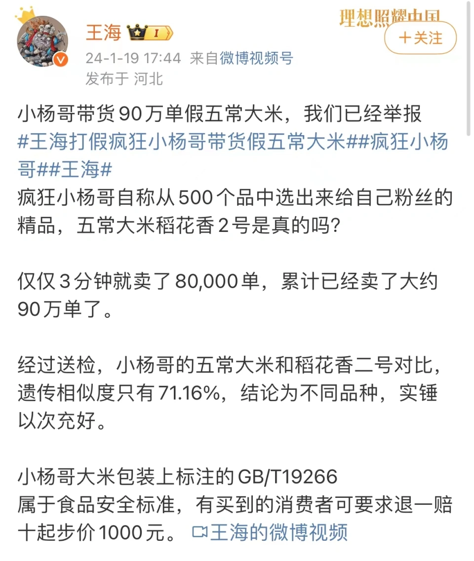 三言科技 1月20日消息,1月19日,着名打假人王海在微博发文,称其已举报小杨哥带货90万单假五常大米。 王海称,颠末送检,小杨哥的五常大米和稻花香二号对比,遗传相似度只有71.16%,结论为差别品种,实锤以次充好。小杨哥大米包装上标注的GB/T19266 ,属于食品安全标准,有买到的消耗者可要求退一赔十起步价1000元。 当晚,“王海举报小杨哥带货假五常大米”干系话题冲上多个平台热搜。 随后,疯狂小杨哥在直播间谈及此事,称不但他没卖过,三只羊网络整个团体,供应链压根就没谁人大米的品,包罗全部达人、主播,都没卖过谁人大米。 小杨哥还体现,被打假的大米是别人盗用他的肖像卖的,“你们媒体怎么那么喜好跟风,你们也查证一下有没有卖过,查证一下究竟依据。” |