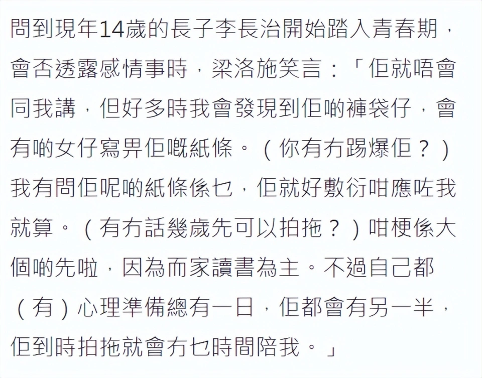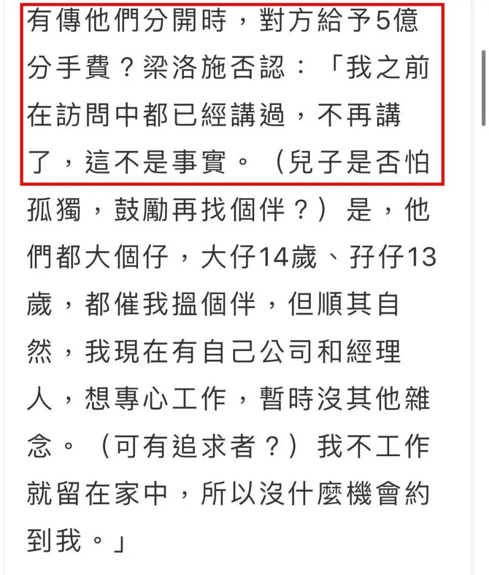 1月23日,35岁女星梁洛施在出席活动时回应了网传的“14岁儿子早恋,李泽楷给了她5亿分手费,被人寻求”的听说,引起热议。 活动现场,梁洛施面对记者的提问从容面对,她体现14岁的宗子李长治开始踏入芳华期,但儿子对爱情方面的事比力怕羞,都不会跟她讲。 但梁洛施体现,她曾很多多少次发现儿子身上有女生写给他的纸条,但每当梁洛施扣问儿子纸条的事时,儿子都是很敷衍地回应她,她也挺无奈的。 被问到以为儿子几岁可以谈爱情时?梁洛施复兴说,照旧盼望孩子现阶段以学业为主。 不外她也夸大,她故意理准备,儿子总有一天是要爱情完婚的,到谁人时间,儿子谈了爱情就会没有太多时间陪自己了。 简而言之,梁洛施没有那么剧烈反对儿子早恋的事,但照旧盼望他现阶段以学业为重。 活动现场,尚有记者问梁洛施:此前有听说说,你跟李泽楷分手时,对方给了你5亿的分手费?对此梁洛施则予以否认,她说,“我之前在访谈中已经说过了,这次就不再多说了,所谓的5亿分手费并不是毕竟。” 在谈到儿子是否盼望她再找个伴儿时,梁洛施体现,三个儿子如今都长大了,也鼓励她找个伴儿,但她如今照旧想用心工作,临时没有其他杂念。 同时,梁洛施还夸大,自己如今也没有寻求者,毕竟要么是工作要么就待在家里,(其他人)也没什么时性能约到她。 值得一提的是,在此次活动之前,梁洛施还到场了鲁豫的节目,在节目中也谈到了类似的一些题目,还体现自己并不悔恨跟李泽楷的那段感情,她说自己当年爱得深沉,如果再来一次,照旧会选李泽楷。 在鲁豫的节目中,梁洛施还提到了客岁她跟李泽楷一起到场儿子的演出活动,两个人疑似复合一事,梁洛施体现,她和李泽楷只是儿子的父母如许的关系,并没有复合。 据悉,梁洛施是中国香港女歌手、演员,代表作品有《虫不知》《情癫大圣》《贪图》《伊莎贝拉》《念念》《恭喜八婆》等。 2007年,19岁的梁洛施在杨紫琼的先容下认识了富商李嘉诚的二儿子李泽楷,二人相知趣恋,并在2009年就有了第一个孩子,即大儿子李长治。厥后到了2010年6月尾,梁洛施又在美国生下了一对双胞胎男孩。 然而就在各人以为她可以带着三个儿子一起嫁入权门时,2011年2月26日,梁洛施与李泽楷却分手了,以至于梁洛施一度被网友挖苦是“权门弃妇”。 |