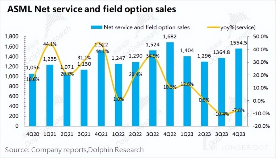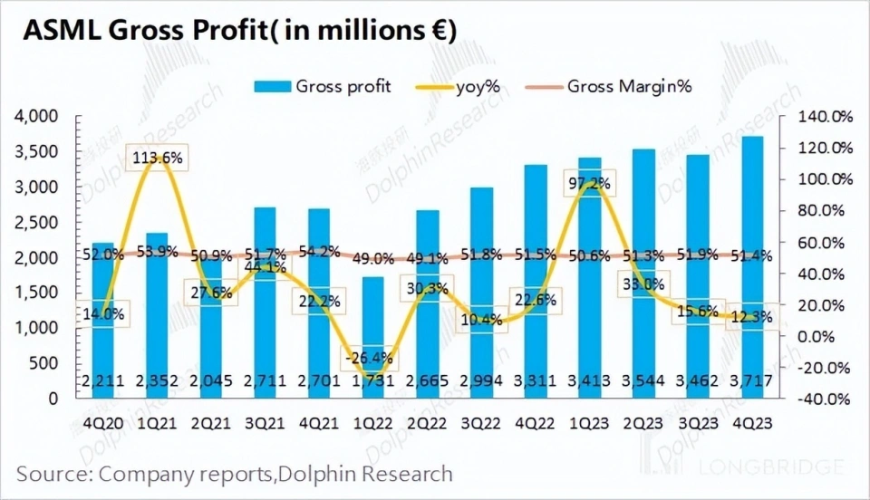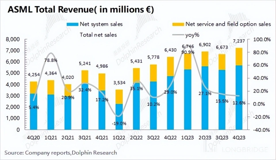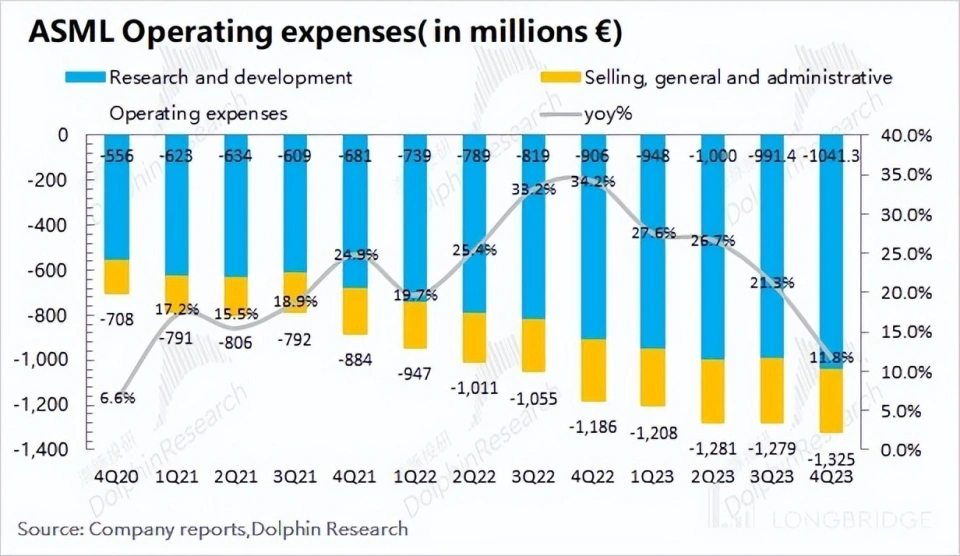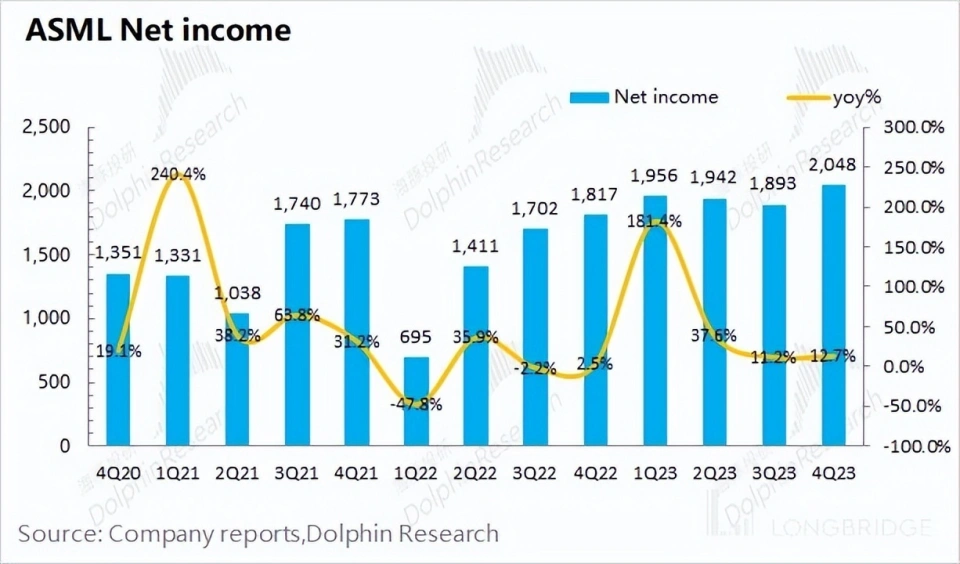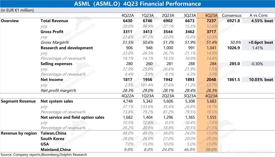 阿斯麦(ASML)于北京时间 2024 年 1 月 24 日下战书的美股盘前发布了 2023 年第四序度财报(停止 2023 年 12 月),要点如下: 1、焦点数据:双双超预期。阿斯麦(ASML)在 2023 年第四序度实现营收 72.4 亿欧元,小超市场预期(69.2 亿欧元)。固然中国台湾客户本季度拉货放缓,但还是抵不住中国大陆和韩国客户的拉货增长。公司在 2023 年第四序度净利润为 20.5 亿欧元,同比增长 12.7%,超出市场预期(18.6 亿欧元)。利润端体现,得益于收入和毛利率的超预期体现。 2、各项业务环境:EUV 和 ArF 是最重要的收入泉源。体系贩卖收入还是公司最重要的收入泉源,占据公司收入近 8 成。本季度$阿斯麦.US收入的同比增长,重要来自于鄙俚客户对 ArF 拉货的增长。 3、各地区收入体现:中国大陆还是第一大客户。受 EUV 管制的影响,中国大陆客户对ArFi 的拉货显着加速。除中国大陆地区以外,韩国地区的收入回升到相对正常水平。而中国台湾地区的收入本季度有较显着的下滑,重要是公司大客户 $台积电.US 收紧了本季度的资源开支,直接影响了拉货节奏。 4、阿斯麦(ASML)业绩指引:2024 年第一季度预期收入 50-55 亿欧元(市场预期 62.23 亿欧元)和毛利率 48-49%(市场预期 51%)。收入端回落有受到出口限定的影响,从 2024 年 ASML 将不会得到向中国大陆发运 NXT:2000i 及以上浸润式装备的出口允许证,直接影响公司浸润式光刻体系收入,进而也影响了公司的毛利率。 团体来看:阿斯麦(ASML)的收入和利润双双超市场预期,这重要得益于中国大陆地区客户和韩国客户在本季度的连续拉货。 从下季度的业绩指引看:公司 2024 年第一季度预期收入 50-55 亿欧元(市场预期 62.23 亿欧元)和毛利率 48-49%(市场预期 51%)。两项数据均有差异水平的下滑,而且都不及市场预期,这重要是受台积电拉货放和缓出口限定的影响。2024 年 1 月 1 日起公司将不会得到向中国大陆发运 NXT:2000i 及以上浸润式装备的出口允许证,直接影响了公司一季度的业绩体现。 固然公司给出了不及预期的推测,但海豚君以为阿斯麦(ASML)一季度的业绩下滑是短期的。从公司如今在手的订单看,阿斯麦(ASML)当前在手订单已经有 91.86 亿欧元,环比提拔 253%。对中国大陆地区的出口限定影响短期业绩,但公司依附领先的技能本领,当前在手订单金额到达了汗青新高。在履历一季度的下滑后,在手订单通过出货转为业绩开释。 团结台积电的财报来看,随着 3nm 扩产的举行,台积电的先辈制程营收占比到达了近 7 成。海豚君以为随着台积电与二三线晶圆制造厂继续拉开差距,将来市场上对 ArFi 等浸没式光刻体系的出口限定也有望减弱,届时有望再一次扩大公司在中国大陆地区的出货。 以下是海豚君对阿斯麦 ASML 的详细分析: 一、焦点数据: 双双超预期 1.1 收入端:阿斯麦(ASML)在 2023 年第四序度实现营收 72.37 亿欧元,小超市场预期(69.2 亿欧元),季度营收再创新高。本季度收入环比增长 8.5%,重要得益于韩国地区客户对 EUV 装备的拉货。 1.2 毛利及毛利率:阿斯麦(ASML)在 2023 年第四序度实现毛利 37.17 亿欧元,同比增长 12.3%。详细毛利率方面,公司本季度毛利率 51.4%,环比有所回落。ArFi 等产物的出货量和均价回落,直接影响公司的毛利率。 1.3 筹谋费用端:阿斯麦(ASML)在 2023 年第四序度筹谋费用为 13.25 亿欧元,同比增长 11.8%。 详细来看: 1)研发费用:本季度研发费用 10.41 亿欧元,同比增长 14.9%。研发费用率维持在 14.4%,公司对研发连续保持高投入; 2)贩卖管理及行政费用:本季度贩卖及管理费用 2.84 亿欧元,同比增长 1.5%;贩卖管理费用率为 3.9%,相对安稳。 1.4 净利润端:阿斯麦(ASML)在 2023 年第四序度净利润为 20.48 亿欧元,同比增长 12.7%,超出市场预期(18.6 亿欧元)。本季度公司业绩增长重要来自于韩国客户对存货用装备的拉动带来。 二、细分数据环境: 中国大陆成最大客户 阿斯麦(ASML)的业务由体系贩卖收入和服务收入两部分构成,此中体系贩卖收入占比靠近 8 成,是公司最焦点的收入泉源。 2.1 各项业务环境 1)体系贩卖收入 阿斯麦(ASML)的体系贩卖收入在 2023 年第四序度实现 56.8 亿欧元,同比增长 19.7%。体系贩卖业务的同比增长重要来自于 ArFi 的大增,业务增速到达 46.7%。随着中国大陆客户的拉货增长,ArFi 的出货均价也提拔至 0.7 亿欧元以上。环比的增长,重要来自于韩国对 EUV 采购的增长。 2)服务收入 阿斯麦(ASML)的服务收入在 2023 年第四序度实现 15.5 亿欧元,同比下滑 7.6%。阿斯麦的服务收入,重要包罗装备维护等项目,业务收入保持相对安稳。 2.2 各地区收入环境 中国大陆地区收入占比仍旧有 4 成左右,是公司本季度最大的客户。重要是由于中国大陆地区客户扩产的需求,增长了对 ArFi 等产物的连续拉货。 除中国大陆地区以外,韩国地区的收入回升到相对正常水平。而中国台湾地区的收入本季度有较显着的下滑,重要是公司大客户台积电收紧了本季度的资源开支,直接影响了拉货节奏。 <此处竣事> |