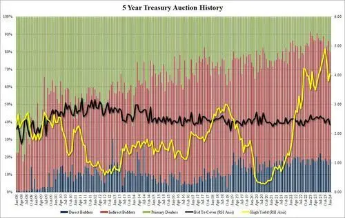 周三,美国财务部拍卖610亿美元的五年期国债,拍卖效果惨淡。媒体直言,没什么人想认购美国五年期国债。 本次610亿美元的五年期拍卖规模,是5年期这一限期品种自2021年以来的最大规模,且与汗青最高持平。 本次5年期美债拍卖的得标利率为4.055%,客岁12月27日的前次拍卖为3.801%。预发行利率为4.035%,比终极的4.055%低2个尾部基点,尾部利差凸显需求疲软,也是2022年9月以来最大的尾部利差。 本次投标倍数为2.31,创2022年9月以来最低,前次投标倍数为2.50。本次投标倍数明显低于迩来六次的均值2.45。 作为权衡美国国内需求的指标,包罗对冲基金、养老基金、共同基金、保险公司、银行、当局机构和个人在内的直接竞标者(Direct Bidders)获配比例为18.7%。 作为权衡外洋需求的指标,通常由外国央行等机构通过一级交易业务商或经纪商到场竞标的间接竞标者(Indirect Bidders)获配比例为60.9%,大幅低于此前的70.6%,创2022年9月以来最低,表明外洋需求非常疲软。 作为承接全部未购买供应的“接盘侠”,一级交易业务商(Primary dealers)本轮获配比例为20.4%,为2022年9月以来的最高,印证了真实需求惨淡。 拍卖效果出炉后,五年期美债收益率短线上扬超2个基点,革新日高至4.0671%,日内团体涨约3个基点。 同日,美国财务部拍卖四个月期国债,得标利率5.185%,前次为5.185%,投标倍数为2.76,前次为3.22。美国财务部还拍卖了两年期浮息国债FRNS,贴现利率为0.245%,2023年12月27日为0.250%。 2024财年迄今(2023年10月1日以来),美国财务部已经累计公布1.01万亿美元国债发行操持,根据操持,最晚将于1月31日发债。2023财年,拜登当局累计发债2.7万亿美元。 |