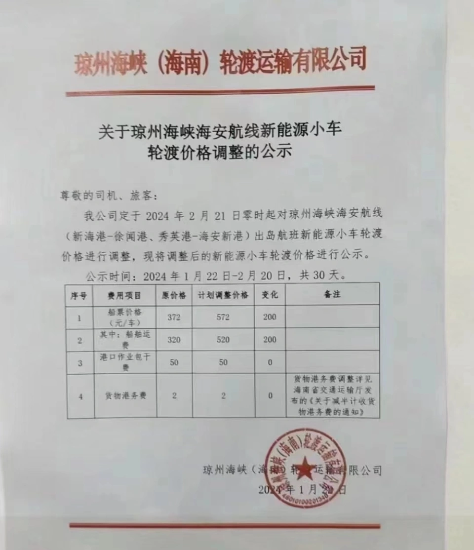 琼州海峡(海南)轮渡运输有限公司针对新能源小车涨价的公示,1月25日成为海南大众关注的热门。 由于琼州海峡隔绝,收支海南岛除乘坐飞机外,要靠轮渡过海。国有控股的琼州海峡(海南)轮渡运输有限公司(以下简称:琼州海峡轮渡公司)负担着这一任务。 1月21日,琼州海峡轮渡公司发出新能源小车轮渡代价调解的公示称,该公司将于2月21日零时起,对琼州海峡海安航线(新海港—徐闻港、秀英港—海安新港)出岛航班新能源小车轮渡代价举行调解。 琼州海峡轮渡公司发出代价调解公示,出岛新能源小车轮渡代价拟从2月21日起上调200元。 公示的代价表现,新能源小车轮渡代价原为372元,此中包罗320元船舶运费、50元港口作业包干费、2元货品港务费。调解后,船舶运费将上涨200元,别的两项不涨价,涨价幅度为62.5%。公示称,该涨价公示从1月22日至2月20日,一共30天。 对于此次涨价,琼州海峡轮渡公司工作职员1月25日上午告诉汹涌消息(www.thepaper.cn),他们没有调解代价的权利,此次代价调解是海南省交通运输厅答应的,详细情况得问交通运输厅。 海南省发改委代价管理处工作职员则表现,由于水运代价不在发改委的定价目次中,对此并不知情。他们也以为公示的代价涨价幅度太高,存在疑问。他们已接洽行业主管部门海南省交通运输厅对此举行关注。 海南省交通运输厅办公室及海峡办工作职员在担当汹涌消息采访时说,他们也是接到群众反映后才知晓琼州海峡轮渡公司的涨价告示。固然水运代价早已全面放开实行市场调治价,但涨价需提供依据,不能任意举行涨价,特别是在春运如许的敏感时期。“我们已要求企业提供涨价依据,待依法依规论证后再作出决定。” |
