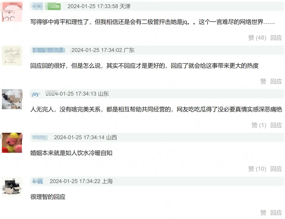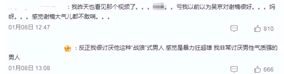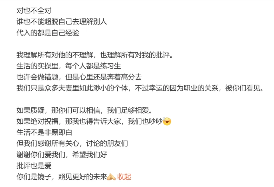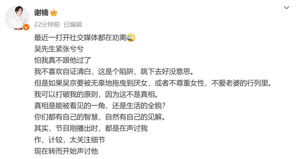由于多年前的夫妻综艺被翻出来,许多人对吴京节目中的一些做法感到不满,导致其口碑受到打击,面临部门网友劝离的品评。谢楠也发文回应了。 谢楠哭戏不得地表现,近来打开交际媒体都在劝离,导致丈夫吴京开始告急兮兮,怕本身真不跟他过了。 谢楠坦言,本身不喜好自证明净,直言这是个陷阱,跳下去没意思。但是如果吴京要被无辜地拖曳到厌女,大概不恭敬女性,不爱妻子的行列里。她可以冲破原则,由于这不是原形。谢楠说:“实在节目刚播出时,都是在声讨我作,计算,太关注细节,现在转而开始声讨他。” 谢楠表现本身明白全部人对吴京的不明白,也明白全部人对她的品评:“生存的实操里,每个人都是训练生,大概会做错题,但是内心照旧奔着高分去。我们只是浩繁夫妻里云云眇小的个体,不外荣幸的由于职业的关系,被你们瞥见。” 面临吴京在夫妻之间的相处方式引发争议,谢楠也很暖和地表现,他们也会吵吵,但请信任他们也充足相爱。 末了谢楠称:“生存不黑白黑即白,但我们感谢全部关心,讨论的朋侪们,谢谢你们爱我们,盼望我们好,品评也是爱。” 看得出来,近来的这些舆情风波,确实有影响到夫妻两人,不外谢楠的回应也算是很高情商了,没有猛烈的反怼网友,也没有太过的责备非难,乃至也没有刻意洗白,大概替吴京说好话,只是简单地表现他们夫妻相处跟平凡夫妻一样,都是会有相互磨合的时候,也会有吵吵的时间,总之婚姻是须要相互学习进步的,盼望各人平和对待他们。 网友看到谢楠的回应,对此纷纷大赞她不愧是主持人,本人好会语言,回应非常理性和客观,也有网友替谢楠担心,以为大概会有一些网友攻击她“娇妻”,但无论怎么样,谢楠这一次的回应,可以说是点水不漏了。 前段时间,随着周一围跟朱丹上综艺引发热度,不少观众重新考古了夫妻综艺的片断,结果因此引发了巨大讨论。从这些综艺片断中,各人更多的是对于吴京的质疑,一部门是以为吴京在婚姻中存在感情漠视加冷暴力的征象,另有一部门质疑吴京感情不稳固,在一样平常小事上对谢楠很急躁。 网友也替吴京妻子谢楠感到窒息,以为吴京太大男主主义,完全只顾本身的感受,而且动不动发性情,让谢楠当着镜头不由得落泪,不少网友都直言受不了。 因此吴京本人也多次被骂上热搜,网友的考古更是越扒越多,舆情一发不可摒挡。 现在谢楠本人都回应了,想来这些年他们应该找到了更好的相处方式。而且综艺节目始终是片断式的,无法相识两人恒久相处的全貌,以是各人照旧应该理性对待。 |