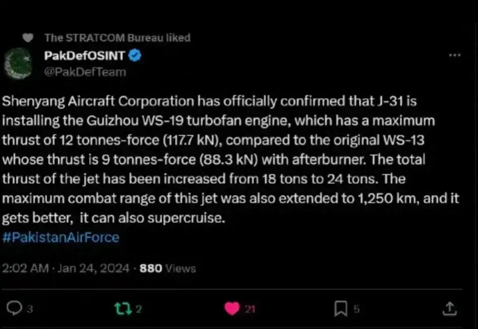 歼-31也能超音速巡航了?笔者不能确认,但是巴基斯坦媒体确实是这么说的。 根据巴基斯坦权势巨子军事媒体《巴基斯坦国防开源谍报》(PakDefOSINT)公布的消息,巴基斯坦购买的中国歼-31战斗机,将会换装中国最新研发的WS-19中等推力发动机,换发之后的歼-31将会在性能上有大幅度的提升。 巴媒称,WS-10发动机的最大推力大概到达了12吨级别,而此前歼-31装备的WS-13发动机最大推力约为8吨,这意味着歼-31战斗机的双发总推力到达了24吨,远高出去的16吨,歼-31战斗机推重比得到增长的同时,作战半径也提升到了1250公里。巴媒表现,得益于更大推力的发动机,歼-31也可以实现超音速巡航,完全到达5代战机的全部标准。 如果巴媒所言为真,那么歼-31的性能确实会有巨大提升,尤其是在长途攻击作战方面,将会有很大的改观,一款中型战斗机将大概取得类似于重型战机的攻击作战力气,这着实让人细思极恐!歼-31只是一种中型战斗机,其此前不停以俄罗斯出口的RD-33发动机为告急动力举行测试。RD-33发动机也同样配备在俄罗斯的米格-29战斗机上,而俄罗斯的米格-29战斗机不停都以航程短著称,被称为第4代战机里的“机场保卫者”。 为了提升米格-29战斗机的航程,从苏联到俄罗斯都想了许多方法,终极的办法是在米格-29战斗机的背脊上增长了一座“驼峰保形油箱”,而且扩大了其机体容油量,将米格-29战斗机的最大航程提升到了3500公里,飞行半径升级到1750公里,颠末一次加油之后,可以拥有6500公里的巨大航程,这一全新的米格-29战斗机被称为米格-29SMT战机,被以为是米格-29战斗机中的最强型号。 歼-31战斗机和米格-29同为中型战斗机,且都利用2台RD-33发动机作为动力,许多媒体都以为歼-31战斗机的航程将会是一个大题目。毕竟5代战秘密思量隐身计划和机腹弹仓,不能恣意增长背脊油箱,也不能把弹仓空出来载油,因此歼-31不停被以为航程有限。但是,我国为歼-31战机增长航程接纳的办法,同俄罗斯照旧有区别的。 我国的办法是提升发动机的技能程度,增长推力、提升服从,一方面增长了战机的巡航速率,一方面也增大了战机的航程。这远比俄罗斯利用简朴的“增长油料”方法要更有技能含量,也不会粉碎战机的隐身和睦动外形。而如果歼-31战斗机依靠内油就能有1250公里的飞行半径,那么在攻击模式下,如果挂载2具大型副油箱,那么歼-31的飞行半径就能到达靠近2000公里,如果接纳空中加油,那么歼-31战斗机的飞行半径也能高出6000公里。 歼-31战机如果真能取得内油1250公里的飞行半径,这对于巴基斯坦而言将会是一个非常有战略代价的事变,由于歼-31战斗机武器利用本事较强,可以挂载CM-400AKG超音速反舰导弹、FT和LS系列卫星制导炸弹,这意味着它可以或许从巴基斯坦境内腾飞,挂载2具副油箱和2枚攻击弹药,直接威胁印度的纵深腹地,将印度都城纳入打击范围。 而如果歼-31战斗机还可以或许更进一步,升级核武器利用本事,那么依靠隐身、大航程、超音速巡航等特点,歼-31简直可以充当巴基斯坦的“超音速隐身轰炸机”来利用了,将会对印度构成巨大的核威胁。如果上述假想成真,那印度队伍怕是真要睡不好觉了。毕竟,具备超音速巡航本事的歼-31战斗机,将会兼具隐身+超音速两种突防本事,以印度现在的本事,极难举行直接拦截,印度必须要构筑起巨大的早期预警体系和主动化防空指挥体系,才气应对歼-31这种隐身战机的快速打击,而这又让印度付出很大的资金和人力、物力。 固然,巴基斯坦版的歼-31现在还未现身,不外估计年底之前,出售巴基斯坦的歼-31量产型就能公开了,到时间我们就能一睹其技能状态,对各种意料举行逐一验证了。盼望巴基斯坦媒体所言非虚,也盼望中国水师的歼-35舰载机也能用上WS-19发动机! |