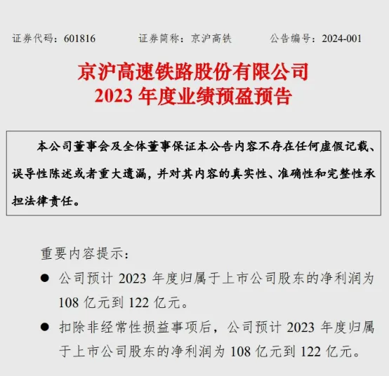 快科技1月26日消息,据媒体报道,京沪高速铁路股份有限公司本日发布了2023年度业绩预盈预报。 据悉,公司预计2023年度归属于上市公司股东的净利润为108亿元到122亿元; 扣除非常常性损益事项后,公司预计 2023 年度归属于上市公司股东的净利润为108亿元到122亿元。 与2022年净亏损576亿元相比,2023年同比扭亏为盈。 京沪高铁被称为最赢利的高铁,2011年6月30日开通运营,全长1318公里。 该线路纵贯北京、天津、河北、山东、安徽、江苏、上海等七省市,毗连“京津冀”和“长三角”两大经济区,是我国“八纵八横”高速铁路主通道的告急构成部门,是我国优质的高速铁路资产。 作为中国一次性投资最大(2209.4亿元)的铁路工程,京沪高铁不光经济、战略意义庞大,也是中国第一条实现红利、也是赢利本领最强的高铁。 2011年6月30日通车,四年后的2015年就开始红利,当年利润65.81亿元,2016年、2017年分别增至95.27亿元、127.16亿元。 |