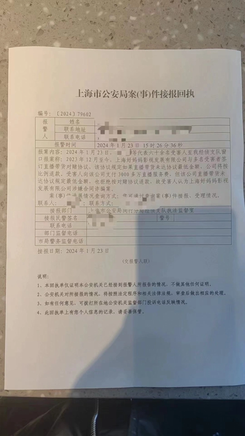 日前,杨子、黄圣依夫妇在抖音达人“表哥覃盼望”的直播间带货,引发争议。 1月27日,多名商家向南都记者反映,上海晟宸泽广告传媒有限公司(下称“晟宸泽传媒”)不光未按条约内容,让自家商品与黄圣依夫妇同框,贩卖量还非常昏暗,有商家的商品以致未能在预定直播日期上链接。以后,商家们还遭遇了退款困难。 同日,晟宸泽传媒回应南都记者称,“我们也和许多商家沟通了,这场销量不高,以切片为主。由于资源费用都已经付出,假如都退款银行也受不了。”别的,上海市公安局闵行分局经侦支队工作职员向南都记者表现,案件正在承办,经济案件观察须要时间,有了盼望会第一时间向报案人反馈。 商家:约请30个工人打包却一单未售出 一家居用品品牌负责人徐老师告诉南都记者,此前他是通过抖音上的一条招募链接相识到,黄圣依和杨子会作为高朋,到场1月16日抖音达人“表哥覃盼望”的直播间带货运动。填取报名信息后,晟宸泽传媒负责商务对接的工作职员就与他们取得了接洽。 吸引徐老师报名的招募海报。 徐老师提供给南都记者的条约信息表现,晟宸泽传媒提供直播带货服务,每场直播艺人为行业头部达人,助力高朋为明星。首场直播时间为1月16日,由“表哥覃盼望”、艺人黄圣依和杨子直播;第二场达人暂定覃盼望,明星待定。 杨子和黄圣依的直播写入条约。 以后,徐老师与“晟宸泽传媒”签订了条约,在交了5万多的服务费后,对方允许做三场大主播达人+明星直播带货的服务,资助徐老师的品牌贩卖钻石装饰画,而且保1:5,也就是保底25万元的贩卖额,否则等比例退款。为此,徐老师准备了50万元的钻石装饰画,并聘任了30个暂时打包工人,包管发货速率。 碰到同样题目的某洗地机品牌的负责人王密斯也告诉南都记者,她交了5万元的服务费,晟宸泽传媒在条约中允许,直播间内黄圣依、杨子夫妇会在现场使用扫地机并举行推介。然而当晚,王密斯没有比及明星使用自产业物的画面,她家的洗地机以致都没有出现在1月16日的直播先容中。期间晟宸泽传媒多次允许退款,但都没有退乐成。 相助方:条约允许的贩卖额并非针对单场直播 针对商家反映的题目,南都记者致电晟宸泽传媒的干系负责人王老师,他称,“我们条约明确写了1月16日带货达人‘表哥覃盼望’而且规定由(QJZ88999)账号带货,黄圣依和杨子仅作为本场直播带货高朋,并没有规定每个产物必须由黄圣依、杨子手持产物切身带货。我们也和许多商家沟通了,这场(1月16日的直播)销量不高,以切片为主。” 王老师表现,条约上允许的贩卖额并不是针对单场直播的,而是会在条约期内安排主播连续地直播,包罗后续的场次也连续排期中。 别的,根据王老师提供的谈天截图,晟宸泽传媒曾与商家沟通称,“‘表哥覃盼望’年货节运动,由于我们品牌的产物机制缺乏肯定的电商上风,品牌电商背书不是很足等综合缘故原由,直播过程中有大概销量不会太高,为保障品牌方的有效权益,我司独自出资购买表哥覃盼望的切片素材授权,由我司专业的视频团队连合直播切片和现场花絮等素材,为贵司的产物定制500 条小视频。通过我司的短视频矩阵情势举行分发。” 对于商家对晟宸泽传媒不具备退款归还本领的质疑,王老师称,“我们提出了可以签订排除协议的事件,他们现在不听劝,我们条约也有规定!两边提前排除是须要负担50%违约责任的,但是特别情况,是可以提前排除的。现在资源都已经付出出去了,假如都退款银行也受不了。” 晟宸泽传媒王老师提供的一份验伤关照书。 别的,王老师说现在商家比力冲动,和他的同事发生了一些肢体辩说,他向南都记者出示了一份上海市公安局一派出所盖章的《验伤关照书》。 警方:经济案件观察须要时间 南都记者注意到,1月25日,黄圣依工作室发表声明称,1月16日,黄圣依和杨子是应抖影文化传媒(上海)有限公司的约请,作为高朋到@表哥(覃盼望)的直播间助力推介带货。 黄圣依工作室发布声明。 黄圣依工作室夸大称,两人没有作出过任何情势的招商等授权以及任何保量等允许,且两人全面推行完成了合约内容,包罗约定的直播时长、需以高朋身份助力推介30个指定产物等。 “对于任何未经授权使用黄圣依、杨子肖像或名义举行任何情势的商业运动,我方将果断追究其法律责任。”黄圣依工作室称,他们已第一时间敦促抖影传媒对各商家、各品牌方严格履约,及时妥善处理处罚善后事件。 1月27日,与晟宸泽传媒签订了条约的某腊肉品牌的负责人王密斯,向南都记者提供了《上海市公安局案(事)件接报回执》。 某腊肉品牌负责人王密斯提供的报案回执。 回执中,报警内容中称,王密斯代表60余名商家报警称,2023年12月至今,上海好妈妈影视发展有限公司与多名受害者签订直播带货对赌协议,该协议规定假如直播带货未达协议最低金额,公司将按比例退款。受害人向该公司付出3000多万直播服务费,但该公司直播带货未达协议规定最低金额,也拒绝按对赌协议退款,故受害人以为上海好妈妈影视发展有限公司涉嫌条约诈骗案。 王密斯表现,“现在已经有一百多个商家找到我,我们想请警方赶紧追回我们的钱,也盼望能有爱心贩卖渠道帮我们办理一下库存题目。” 晟宸泽传媒的干系负责人王老师此前向南都记者表现,“晟宸泽传媒和洽妈妈影视两家公司是一起的。”对于约请杨子、黄圣依的抖影