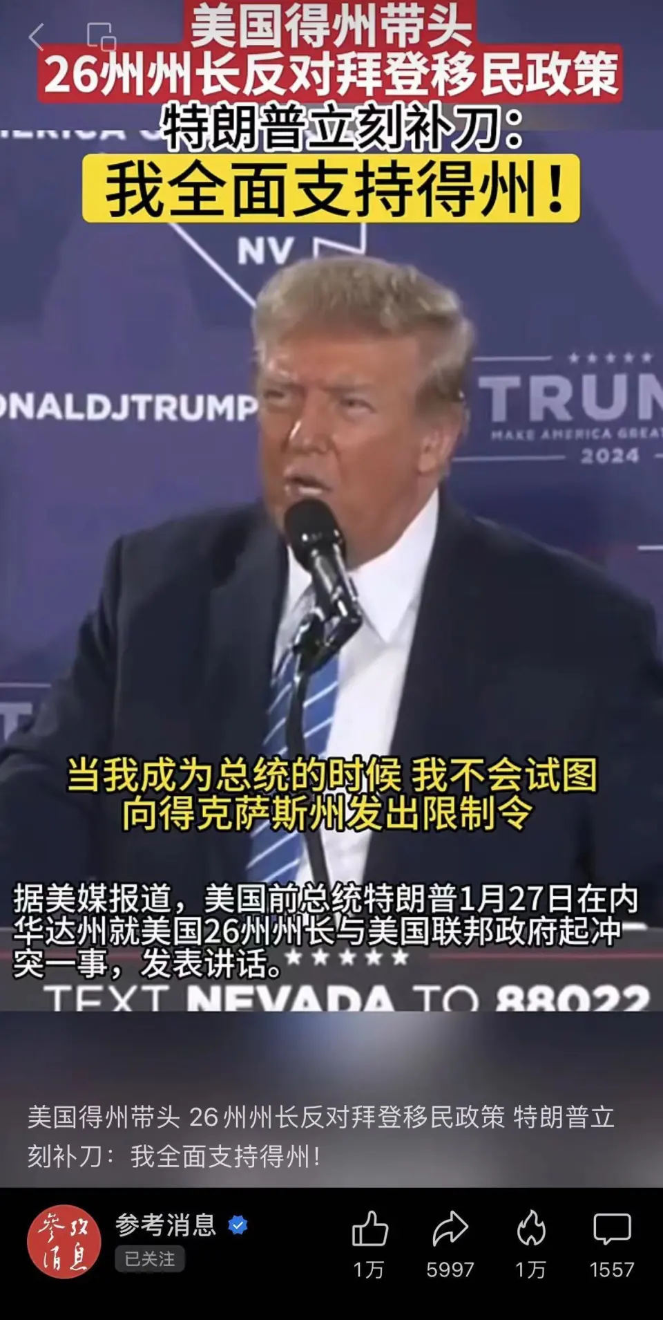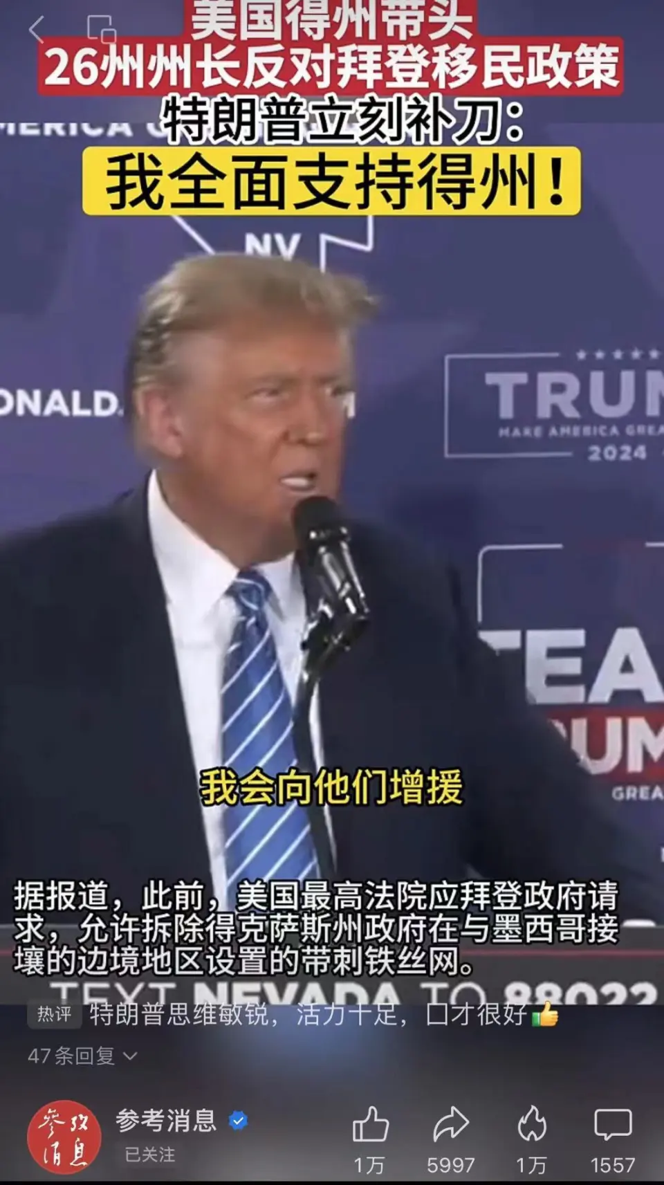 每经编辑:黄胜 据参考消息1月28日援引美媒报道,美国前总统特朗普在内华达州就美国26州州长与美国联邦当局起辩说一事,发表发言并表现全面支持得州。特朗普说到,当自己成为总统的时间,不会试图向得克萨斯州发出限定令,并会向他们支援。 据报道,此前,美国最高法院应拜登当局哀求,答应拆除得克萨斯州当局在与墨西哥接壤的边田地区设置的带刺铁丝网。 美一民间构造筹划克制移民入境据央视消息,美国海关与疆域掩护局1月26日表现,2023年12月份因从墨西哥非法入境美国,而被捕的人数到达了自月度数据公布以来的汗青最高程度。现在,美国地方当局与联邦当局在怎样办理移民危急上对立严肃。美国一民间构造也筹划赶赴美墨疆域克制非法移民入境。 根据报道,美国联邦边防巡逻队2023年12月在美墨疆域逮捕了24.9万人,比11月的19.1万人增长了31%,比2022年12月的22.2万人增长了13%。美国海关与疆域掩护局同时表现,2024年1月份前两周因非法越境而被逮捕的人数,因墨西哥当局的执法力度加大而大幅淘汰。 据报道,名为“夺回我们的疆域”的民间构造,在交际网站上发布消息称,他们将于29日构造车队赶往美墨疆域,克制非法移民进入美国。车队将由一名美陆军退役中校领导。现在在网络上已经有2000多人相应他们的筹划。该构造还筹划在得克萨斯州、加利福尼亚州、亚利桑那州举行集会集会。有消息称,大部门活动到场者将携带枪支武器,不外活动构造者否认这一说法。 美国得州与联邦当局围绕移民标题严肃对立据央视消息,当下,美国地方当局与联邦当局在怎样办理移民危急上严肃对立。日前,美国最高法院答应了美国联邦当局的一项哀求,答应联邦边防巡逻队拆除得克萨斯州疆域部门铁丝网。不外,得克萨斯州方面态度倔强,得州国民保镳队拒不平从最高法院和联邦当局的下令,反而设置了更多的铁丝网,并与联邦边防巡逻队睁开对峙。 特朗普在共和党初选中连下两城据新华社1月23日报道,据美国多家主流媒体23日测算和报道,美国前总统特朗普在当天举行的2024年美国总统推举新罕布什尔州共和党初选中胜出。 据相识,这是特朗普在共和党初选中赢得的一连第二场胜利,击败的是美国前常驻团结国代表、南卡罗来纳州前州长妮基·黑利。黑利随后向特朗普表现庆贺,并表现她将继承到场共和党初选,称“比赛远未竣事”。 美国媒体以为,初选连胜让特朗普隔断再次成为共和党总统候选人更近一步,黑利则面临更大压力。 图片泉源:外媒报道截图 逐日经济消息综合央视消息、参考消息、新华社 逐日经济消息 |