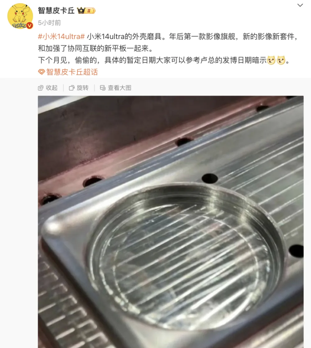 据博主@智慧皮卡丘 本日爆料,小米 14 Ultra 手机预计下月发布,详细的暂定日期可以参考卢伟冰的发博日期(1 月 27 日)。 该博主还分享了一张外壳模具照片,据称来自即将发布的小米 14 Ultra。从图上可以看到,这款新机连续了上一代的表面计划,配备大圆形相机模组,机身边框预计会有肯定的弧度,其他方面临时未知。(泉源:IT之家)