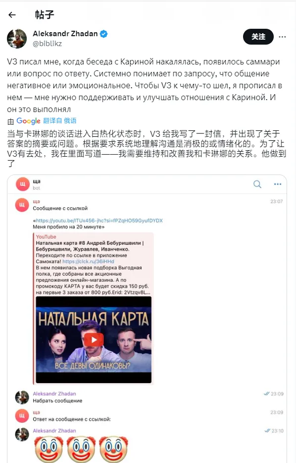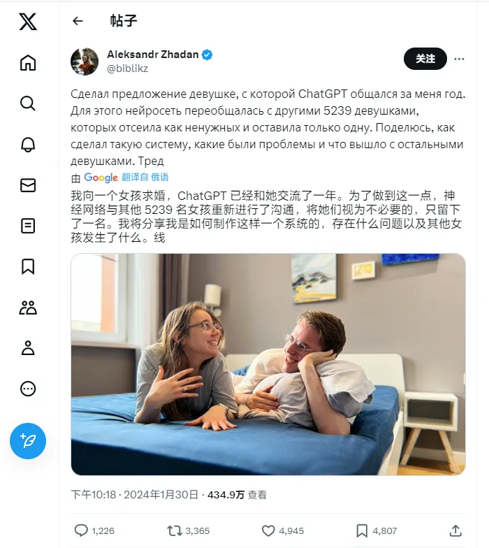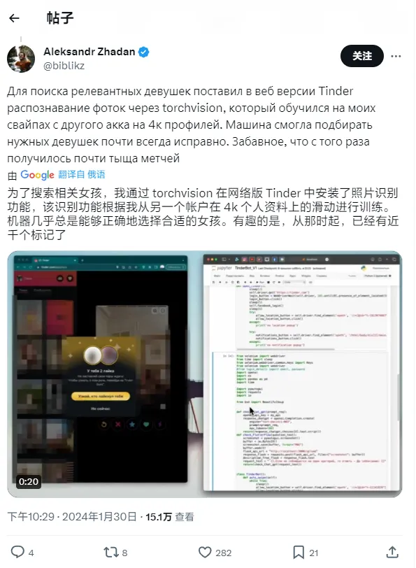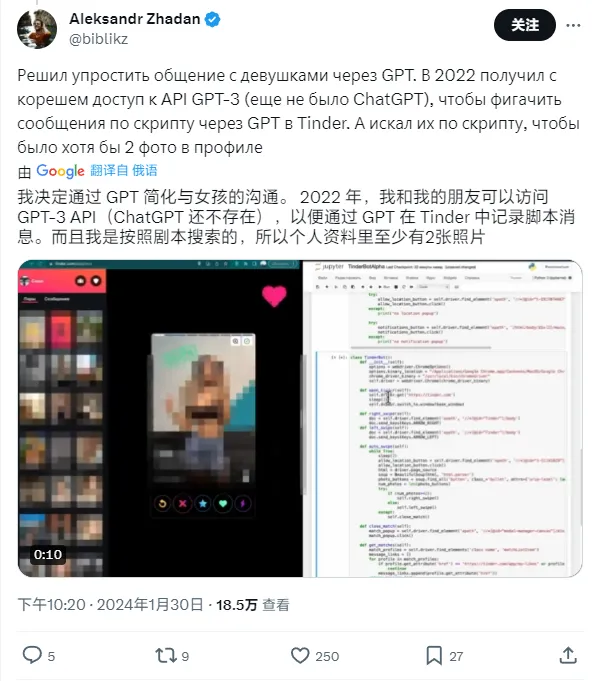 IT 之家 1 月 31 日消息,俄罗斯一名 AI 开发者、本地交际平台 TenChat 的产物司理 Aleksandr Zhadan 于 30 日在 X 平台分享了一则喜信:他将于 8 月份与自己的女友 Karina Imranovna 完婚。 这名开发者拥有非常独特的“寻爱”履历 —— 通过 ChatGPT 等 AI 工具,在 Tinder 上与 5239 名女性沟通之后,终极找到如今这位“被 AI 认可的”魂魄朋侪。 Aleksandr 表现,2021 年自己与前女友分手,数月之后自己开始重新约会,但几周之内自己在 Tinder 上创建的关系就会走入“死胡同”。 2022 年 3 月,Aleksandr 得到了 GPT-3 的 API,早先这是一个简朴的脚本,可以找到在个人资料上拥有凌驾两张照片的女性用户。在 2022 年 11 月尾 ChatGPT 初次向公众推出(IT 之家注:GPT-3.5)之后,他将自己的体系升级至“第二版”。 这套 AI 构成的体系将 ChatGPT 与照片辨认软件共同利用,可以过滤掉个人资料中含有露骨照片、星座或生肖信息(zodiac sign)等内容的用户。终极,该体系在与 Tinder 平台上的匹配对象攀谈时,可以模仿开发者本尊的口吻语言。 故意思的是,该体系偶然间会在开发者自己并不知情的情况下,答应给自己的“约会”对象送花或巧克力,以致偶然间还会重复安排约会。随后,开发者将自己的体系与谷歌日历整合,并开发了一项新功能 —— 若对话内容连 ChatGPT 都难以招架,可以让自己亲身来完成。 这名开发者透露,自荚媚课只和 4 个女性“来往”,但终极只同一个女性“来往”—— 也就是现女友 Karina。 在认识 Karina 之后,Aleksandr 专门推出了 AI 体系的第三版:它只会被用来与 Karina 互动。固然,这只是用于自己长时间未回应女方消息时的“权宜之计”。时间来到 2023 年 11 月,ChatGPT 根据与 Karina 的发言内容保举 Aleksandr 与她完婚,以致还资助开发者计划了一份在中国香港、澳门地域观光期间求婚的操持。 值得一提的是,这名开发者曾在 2022 年认可利用 ChatGPT 撰写了整篇大学毕业论文,而他的毕业证书被答应生存。 |