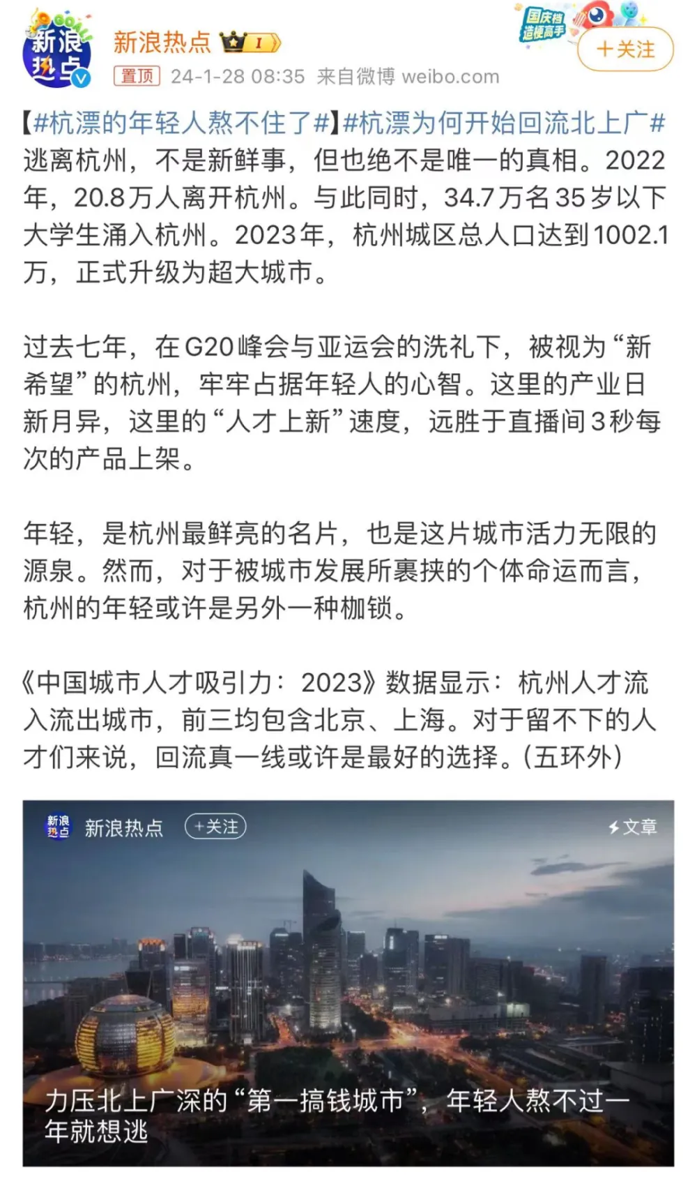 “如果在人间,杭州大概是最好的人间了。” ——吴晓波 文 / 巴九灵 克日来,一篇关于“杭漂的年轻人熬不住了”“杭漂为何开始回流北上广”的文章,被顶上了热搜,又在各交际网络逐步发酵。 图源:微博 文章中说道:“杭州固然对标一线都会,但是综合力气与一线相去甚远,就连在二线都会中都算不上龙头,为了摆脱产业底子单薄、产业布局单一的标签,反复在新制造、新工业、数字经济及各类风口型产业上喊出标语……” 在它的语境里,如许一个杭州对年轻人“并不友好”,它仿佛一座虚火茂盛、空有标语的都会,吸引热血的年轻人来,又令他们失意脱离。 这番品评颇让人皱眉。 单是“工业底子单薄,产业单一”一项,就完全经不起推敲。 在“2023杭州市综合百强榜单”中,杭州的制造型企业和修建企业共51家,服务型企业共49家,二三产业较为均衡;在“2023浙江省制造业百强企业名单”中,杭州占了1/3,前五家企业有四家位于杭州,分别是荣盛、祥瑞、恒逸、杭州钢铁,涉及石化、化纤、物流、收支口、汽车、新质料、钢铁等多个范畴。 如果再从创造首富的角度看,近十年来,杭州运送的中国首富中,从事制造业的只有三位:梁稳根、宗庆后和钟睒睒,后两位拥有娃哈哈和农民山泉,是两家典范的杭州食品工业企业。能创造首富和集聚龙头,意味着行业有较强的利润率和现金流,以及在这座都会的周边有强盛的供应链、产业链和客户链。 那么杭州对年轻人真的不友好吗?杭州还是创新创业的热土吗? 单一的视角杭州是一座善于“造星”的都会,从互联网的丁磊、马云,到直播电商的薇娅、李佳琦。 消耗互联网、网红和直播给这座曾经的旅游都会打上了期间的标签。曾有人戏言,位于西湖边的湖滨银泰掉一块砖,都能砸死一群网红。 2021年,杭州直播电商买卖业务额已占电商总额68.1%,短视频直播行业大学求职人数增长69.52%,高出35%的结业生涌入了这个躁动的行业。 硕士结业于香港浸会大学、曾从事直播电商的催催,是最早选择逃离杭州的年轻人之一。 2021年,经挚友先容,催催入职了一家MCN机构,彼时,她的税后月薪约1.3万元,在市场中属于中等偏上的水平。 “我以为(在杭州)找工作不难,对于年轻人的包涵水平高,各种工作范例的都有涉猎,而且不太在乎配景。对于年轻人来说,它是个能驻足的地方。”催催客观评价道。 与此同时,直播电商也吸引了无数善于洞察商机的小微创业者,张鹏博便是此中一员。 2020年,他从深圳来到杭州开始了电商创业,而且很快融入杭州的直播圈子。这几年,他卖过白牌的农产物、母婴产物,最多一天业务额几十万,还打造过天然流量过千的医生直播间。风光时,天下各地创业者都前来杭州向他取经。 当行业方兴未艾时,到处都是泼天的财产和年轻人的热情;当行业过热进入了洗牌期,内卷加剧,身在此中的人的心态和选择都发生了变革。 直播电商 催催在MCN公司仅仅干了半年后,便脱离了这个收入还算不错的行业,现在在大连一所大学任教:“杭州的公司会以为996是正常的,还分巨细周,我继承不了。” 张鹏博同样在客岁4月脱离杭州回到深圳,开始实验从直播卖货拓展到广州的服装生产端。 在深圳,他熟悉了好几个偕行,一问居然都是从杭州刚返来的,“有的以致从前跟我在同一个办公楼。”返来的来由也都类似,“代价战下,直播电商越来越朝着产业集群带和三四线都会转移”。 已往几年,涌动的财产让杭州与电商、直播、网红挂上了钩,也在某种水平上,一个行业的升降决定了人们对这座都会的直接评价。 诺贝尔经济学奖得主阿马蒂亚·森曾说:当身份和视角变得愈加单一而忽略其丰富的部分时,就会造成幻象和误解。 同理,当杭州被直播和网红标签化,它的身份和人们对她的认知也将走向单一,从而遭遇阿马蒂亚所说的抱负与误解。 多面的都会究竟上,杭州的身份并非是单一的。新中国建立后,杭州先后被定位成休闲疗养地、轻工业之都、旅游胜地、互联网和电商的圣地,但并不意味着杭州会扬弃前者拥抱后者。杭州的诸多身份不是独立或割裂的,而是愈发地融合,这作育了杭州很强的都会综合竞争力。 杭州西湖 在最新公布的“2023胡润天下500强”榜单中,杭州有四家企业,上榜企业数排天下都会第三。在2023年公布的《财产》天下500强中,杭州贡献了此中7家企业,排在北上深之后,位列第四。 聚焦到国内,据统计,2023年《财产》中国500强排行榜上,从地区看,北上深杭广位列前五,此中北京超100家,上海55家,深圳34家,杭州22家,广州17家,杭州排名第四。 在“2023中国民营企业500强”榜单中,杭州上榜的企业数一连21年蝉联天下第一。 杭州也在并非“反复在新制造、新工业、数字经济及各类风口型产业上喊出标语”。 除了买卖业务额占天下61%的电子商务,杭州的数字经济尚有软件产业这张王牌:软件收入天下第四,增速天下第一,信息技能服务收入在全行业占比达79%,已形成龙头聚集效应。火热的人工智能算力天下前三,仅次于北京。 以是,杭州不是只靠互联网和网红经济。究竟上,杭州的数字经济、传统制造业和先辈工业并驾齐驱。在“2022年天下先辈制造业百强市榜单”中,杭州位列第五,排在它前面深圳、苏州、广州和南京。 杭州的高新技能产业占工业增长值的比例到达71%。像在电子信息产业中,有100多家芯片筹划企业,是国家芯片筹划基地之一,