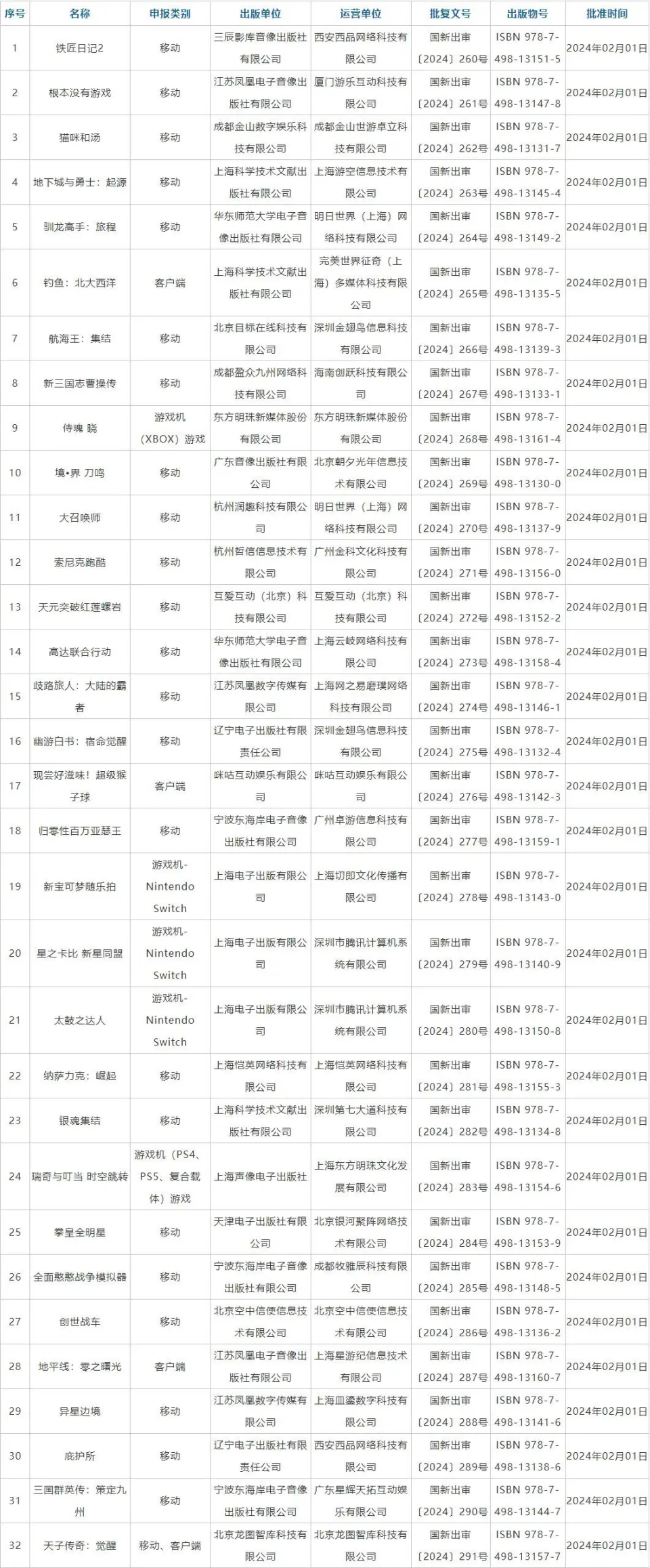 2月2日,夏历小年当天,2024年年首批入口版号正式下发,本批次共有32款游戏通过审批,此中手游24款、PC端游4款、主机游戏5款。(含一款客户端、手游双平台游戏) 本批次重点游戏企业、重点产物重要有: 腾讯手游《地下城与勇士:劈头》、Switch游戏《新宝可梦随乐拍》《星之卡比 新星同盟》《太鼓之达人》 网易《歧路旅人:大陆的霸者》 美满天下端游《垂纶:北大西洋》、掌趣端游《地平线:零之曙光》 东方明珠的Xbox游戏《侍魂 晓》、PS4/PS5游戏《瑞奇与叮当 时空跳转》 金山世游《猫咪和汤》、恺英网络《纳萨力克:崛起》、4399《根本没有游戏》、嫡天下《驯龙高手:旅程》《大召唤师》、中手游《新三国志曹操传》、金科文化《索尼克跑酷》、互爱互动《天元突破红莲螺岩》、凯撒文化《幽游白书:宿命觉醒》、奥飞娱乐《帆海王:集结》、广州卓游《归零性百万亚瑟王》、第七大道《银魂集结》、银河聚阵《拳皇全明星》、心动《全面憨憨战役模拟器》、战火互娱《创世战车》、旦夕光年《田地 刀鸣》、星辉娱乐《三国群英传:策定九州》 以下是本批次重点游戏先容: 腾讯手游《地下城与勇士:劈头》 作为DNF端游时隔多年的手游产物,《地下城与勇士:劈头》国服上线的过程可谓一波三折。 早在2020年2月,Nexon就曾预报,DNF手游国服将在年内上线,直到2020年8月20日,游戏官方体现,出于防着迷体系升级等,DNF手游将延期上线,虽知道国服玩家一等,就是三年多。 国服玩家期待期间,2022年在韩国上线的DNF手游已经取得了巨大的乐成上线不到八个月后的累计流水或已靠近10亿元。 日前,腾讯官方已经规复了游戏干系社媒和官网的更新,并为预约玩家提供了额外期待的夸奖,只不外游戏上线时间仍旧待定。 腾讯Switch游戏《新宝可梦随乐拍》 《新宝可梦随乐拍》是一款由万代南梦宫开发、发行在任天国Switch平台的照相动作游戏,国际服于2021年4月30日发售。 腾讯Switch游戏《星之卡比 新星同盟》 《星之卡比 新星同盟》是一款2018年(外洋)在任天国Switch发行的侧视角2.5D平台动作游戏。这是《星之卡比》系列的第十二部主线游戏。 腾讯Switch游戏《太鼓之达人》 《太鼓之达人》是由万代开发的太鼓模拟演奏音游,该系列游戏自2018年发布的《太鼓之达人:Drum ‘n’ Fun!》开始,在Switch平台已经推出了3款作品,共计近300首收录曲。 网易《歧路旅人:大陆的霸者》 《歧路旅人 大陆的霸者》是由Square Enix开发的《歧路旅人》系列新作手游,最早于2020年10月在日本上线,根据官方先容,该游戏以理想风HD-2D画面、最大8人组队、3条可选择主线故事为特色,保存了NPC谍报扣问、雇佣等玩法。 据SE官方的数据,该游戏在日本上线后短短 2 天内下载量就到达了 300 万次。 美满天下端游《垂纶:北大西洋》 《垂纶:北大西洋》是由Misc Games开发的垂纶游戏,玩家可以探索加拿大新斯科舍省的雄伟天下,欣赏多姿多彩的海洋生物。在职业渔夫生活的盼望中,使用各种可升级的渔船和差异渔具来征采北大西洋里的黄金。 如今游戏在Steam上为76%的多半好评。 掌趣端游《地平线:零之曙光》 《地平线:零之曙光》是由Guerrilla Games开发、SIE(外洋)发行的一款动作RPG游戏。该产物在外洋于2020登岸PC端,预计累计销量过百万。 东方明珠Xbox游戏《侍魂 晓》 《侍魂 晓》是SNK于2019年在Xbox One主机上发售的格斗游戏。 东方明珠PS4/PS5游戏《瑞奇与叮当 时空跳转》 《瑞奇与叮当 时空跳转》是一款由Insomniac Games开发、2021年SIE(外洋)发行的第三人称平台射击游戏,也是“瑞奇与叮当”系列第九部作品。 金山世游《猫咪和汤》 《猫咪和汤》是由韩国公司Neowiz旗下工作室HIDEA于2021年发布的休闲放置模拟游戏,玩家可以在游戏中与小猫相遇,一起制作美食来积攒产业,不停解锁更多的美食摊位与游乐办法,主打休闲治愈的氛围。 根据游戏官网数据,如今该产物的预约人数已经到达了101万。 4399《根本没有游戏》 《根本没有游戏》最早于2020年在Steam上发布,是一款点击类笑剧冒险游戏,如今在TapTap上,这款尚未发布的产物已经得到了9.6的高分。 嫡天下《驯龙高手:旅程》 据官方先容,《驯龙高手:旅程》是由举世影业和梦工场动画授权,嫡天下自研并发行的一款模拟策划育龙手游。故事发生在维京期间,你将在游戏中扮演驯龙学院的龙骑手,招募、顺从、繁育作育各具特色的飞龙同伴,组建强盛的驯龙小队,与他们一起称霸“天空竞技赛”,掩护“博克岛”,成为真正的“驯龙高手”! 第七大道《银魂集结》 据官方先容,《银魂集结》是一款再现人气动画《银魂》天下观的全新3D手游。由万代南梦宫(上海)娱乐有限公司与辉夜工作室共同开发。 心动《全面憨憨战役模拟器》 据官方先容,《全面憨憨战役模拟器》是·一款近乎真实的专业战役模拟游戏,由Landfall官方授权,游戏将会是基于Steam原版的完备移植,买断制发售,并会针对手机玩家的体验做专门优化。 旦夕光年《田地 刀鸣》 《田地 刀鸣》是基于《死神》IP,由《BLEACH 境·界》官方正版授权的二次元ARPG游戏。 |