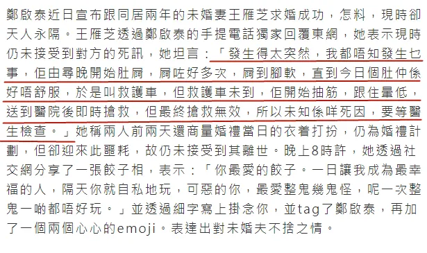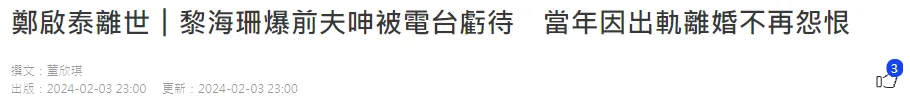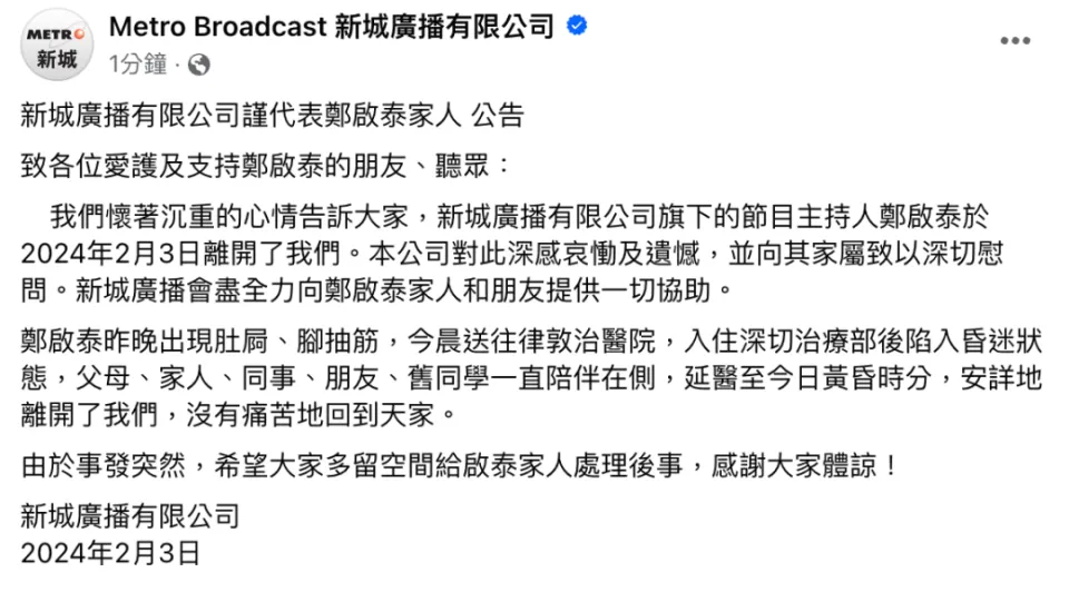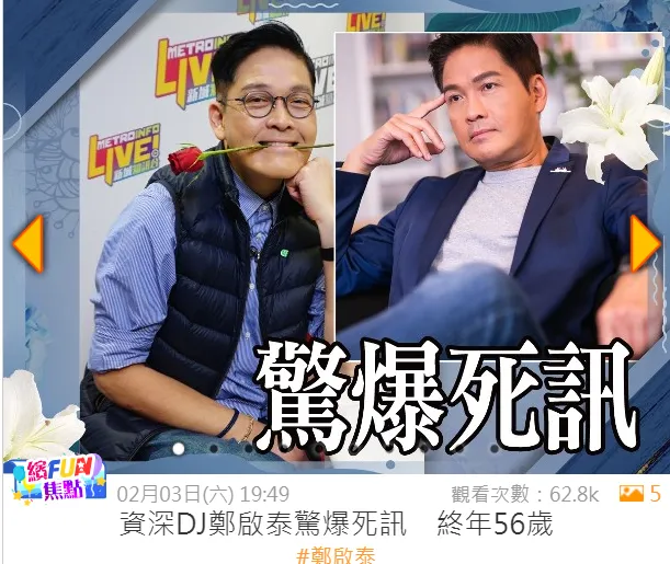 3日晚上,港媒突然爆出“资深DJ郑启泰猝逝,终年56岁”的消息。 据报道,郑启泰2日晚上突然出现腹泻、脚抽筋症状。第二天早上突然在家中晕倒,并立即送到律敦治医院接济。入住深切治疗部后陷入昏倒状态,延至下战书4点接济无效离世。 脱离时父母、家人、同事、朋侪、旧同砚不停陪伴在侧。 及后,新城电台发出告示证明死讯。 消息出来后,震动了许多网友。 要知道,1日时他刚刚与女友求婚乐成,工作时马浚伟还拥抱接待庆祝他,港媒也在2日庆祝了此事。 没想到才过了一天,喜事竟然变成了丧事。 郑启泰是香港广播及电视节目主持人、唱片骑师、演员及司仪,结业于温莎大学,曾经修读两个学位:传理系(电视影戏制作)及工商管理系学士。 TVB“御用恶人”郑恕峰是他的堂兄,郑启泰从前在九龙乐民新村长大,其时原来郑伊健、曾航生是他楼上楼下的邻人。直到中五结业,他才搬去了加拿大。 从前他从加拿大回港后,他曾在香港最大的纸厂分公司当翻译文员,后自荐到香港贸易电台,主持了《齐备从音乐开始》、《开心看天下》等多个节目,并徐徐提拔为高级监制。 1995年起,他开始为有线电视主持节目及为多个电视广告作旁白。 四年后,他转至新城娱乐台(现已易名为新城知讯台)任职,曾继承该台实行监制及主持,主待了《开心大闹钟》、《生存好国度》等节目。 2007年到2012年,他转去亚视做节目报幕及旁白,亦曾为亚洲电视艺员训练班作导师。 从2010年第29届香港影戏金像奖开始开始,他不停为颁奖仪式继承现场报幕员,他的声音也成为许多喜好港台节目粉丝的经典回想。 2017年,他到场无线电视台,除电台电视外,还继承多项晚会司仪,并到许多大企业训练员工沟通本领及语言运用。 除了主持外,他还接演电视剧。 在《爱·回家之开心速递》、《果栏中的江湖大嫂》、《多功能妻子》、《智能爱人》、《美丽战场》、《超能使者》等近40套剧会集都能看到他的身影,固然脚色大多是客串居多,不外曝光率相称高。 客岁热播的《消息女王》,他就在内里扮演卢展廷一角。 对于自己的感情事,他也从不避忌。 郑启泰曾于90年代与同是DJ兼演员的黎海珊完婚,婚姻仅维持5年便竣事。 郑启泰曾受访时体现,完婚时年仅26岁,与黎海珊由认识、拍拖、同居到去加拿大机密完婚,只是半年之间的事,但因太年轻,未看法过花花天下,经不起勾引,终因出轨与前妻分开。 他透露,其时用圈外人弥补好奇心,以及探求自由,仳离的决定很不成熟。 他和圈外人的感情也没对峙多久就分开了,厥后他连续来往过几个女友,每一个都是来往了几年才分手,还与此中一个女友有了一个女儿。 面临已往的感情题目,他坦言自己从前是个“坏男孩”,有本领后就花心,还一投机取巧,伤了几个前任的心,导致感情难以调停。他说出自己的履历,也是盼望别人不要学他,爱惜真正爱自己的女子。 2010年,在奇迹低潮期他碰到了王雁芝。王雁芝是前香港滚轴滑冰运动员,曾代表香港角逐长达11年。王雁芝的最佳结果为亚洲锦标赛500米第5名,天下速率轮滑5000米积分镌汰赛亚军。 与王雁芝相识并相恋后,郑启泰自言改掉了花心的性子,两人一同相恋了11年,王雁芝对他女儿视若己出,女儿对王雁芝也非常喜好。 2023年10月23日,郑启泰突然于交际平台公布已辞去新城电台的工作。但时隔三个月,他收到其时刚上任的首席营运总监马浚伟的约请而决定回巢。 就在他回巢的同一天,他承认向女友王雁芝求婚乐成,如今已经在动手预备婚礼。 受女友影响,他积极锻炼身段,去世前三天,还在交际平台上晒了自己举重的照片,固然恶搞但也力证自己身段很好。 而他本于今个月13日,即将迎来57岁生日。 在许多人推测他会不会在生日那天举行婚礼时,没想到等来的竟然是他的死讯。 消息出来后,他的未婚妻在回应,称事发太突然,她到如今都无法继承。现在还不知道具体的死因,只能等大夫举行查抄关照。 晚上,王雁芝在交际平台晒了多个与郑启泰的合照,以及公开求婚乐成的照片,表达自己的不舍和惦记。 郑启泰的前妻也体现,自己早已不痛恨前夫,只会记取郑启泰最精美一刻,并指两人当日的痛恨已微不敷道,两人客岁还在传媒酒会上晤面谈天。她还替前夫行侠仗义,以为前夫被电台亏待。 逝者已去,盼望郑启泰的亲朋能节哀。 |