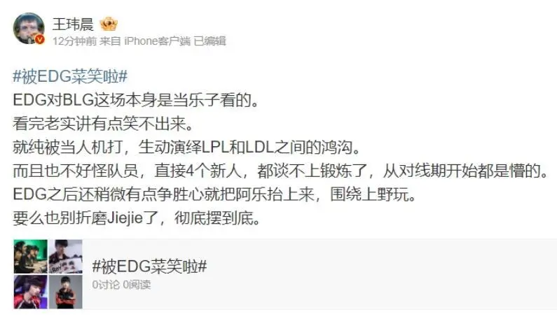 近来关于电竞圈的消息是很多人在关注的,信赖各人也不绝在讨论这方面的内容,这段时间有一场比赛引起了大量网友的热议,这场比赛就是BLG和EDG的对决,一边是本赛季最强战队,另一边是老牌战队。 固然我们赛区的热度下滑了很多,但是这两支战队的对决照旧引起了很多人的关注的,当天的比赛热度也很高,不外终极的效果各人也看到了,BLG两场比赛一共用了46分钟,成为了本赛季比赛时长最快的对决。 固然在比赛开始之前,各人就已经猜到了EDG大概率会输,但是没想到终极输的这么惨,他们已经履历4连败了,在这么下去,大概季后赛都进不去了,现在各人就在分析,接下来的EDG到底要怎么办。 近来赛后体坛周报记者王玮晨就出来语言了,他发的内容是:EDG对BLG这场本身是当乐子看的。看完老实讲有点笑不出来。就纯被当人机打,生动演绎LPL和LDL之间的鸿沟。而且也不好怪队员,直接4个新人,都谈不上锻炼了,从对线期开始都是懵的。EDG之后还轻微有点争胜心就把阿乐抬上来,围绕上野玩。要么也别折磨Jiejie了,彻底摆到底。 实在他的观点很简朴,那就是接下来的EDG只剩两条路可走,第一条路就是请Ale回归首发,然后想想怎么才气破局,另有一条路就是不请回ale那就放过jiejie,彻底摆烂,不要折磨jiejie,别把jiejie的心态都给打崩了。 现在很多人就担心,如果以现在这个状态打一个赛季的话,估计下个赛季的jiejie会发生很大的变革,大概职业生存都大概会被打废,因此现在各人都在讨论这件事,如果EDG不改变,那选手们大概会被摧残到改变。 不管怎么说吧,小编个人以为,就算把Ale抬回顾发位置,那大概率也没办法拿到好效果,不外可以试着打击一下季后赛,能进季后赛就算乐成,如果选择直接摆烂,那就没什么好说的了,对此你们有什么想吐槽的吗? |