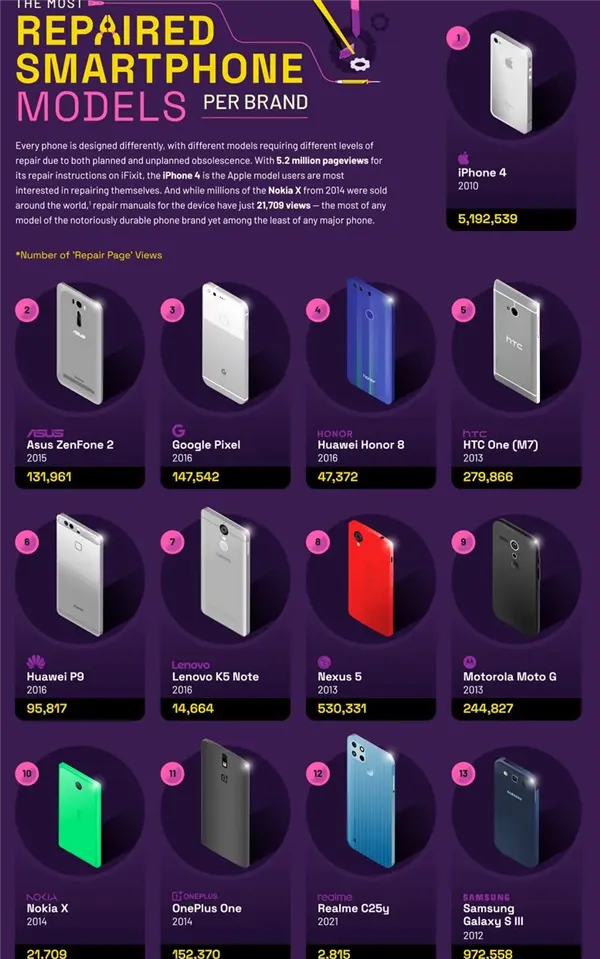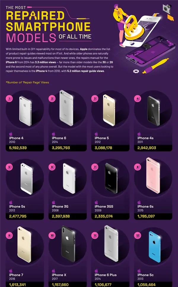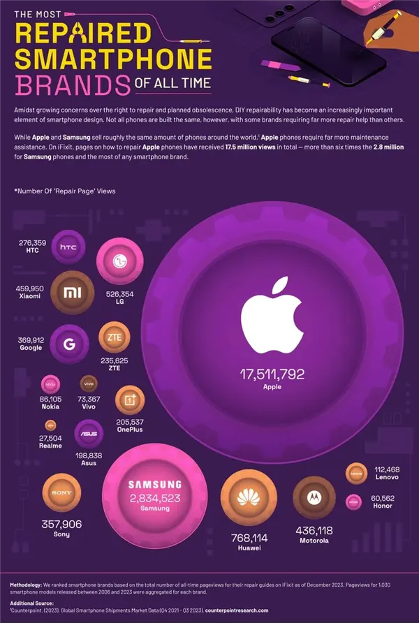 快科技2月8日消息,调研机构Electronics Hub给出的陈诉表现,苹果是维修次数最多的智能手机品牌。 这份陈诉基于国外维修网站iFixit产物维修页面的访问量,盘货了用户访问维修页面次数最多的智能手机型号和品牌。 在查询次数最多的前20款机型中,iPhone 占据主导职位(也是自2022年以来维修次数最多的机型)。 陈诉表现,iPhone 14 Pro Max是自2022年发布以来访问维修次数最多的智能手机。2012年三星Galaxy S III是访问维修次数最多的安卓机型。 三星的维修次数又是排名第三华为(768114 次)的3.69倍。之后是LG、小米、摩托罗拉、谷歌、索尼等。 |